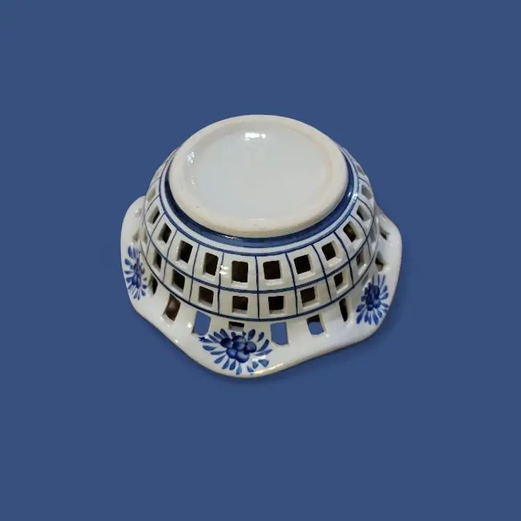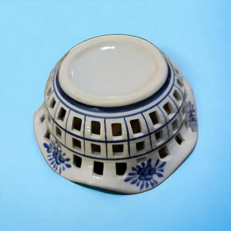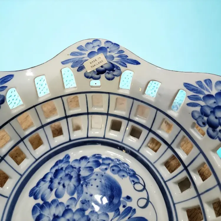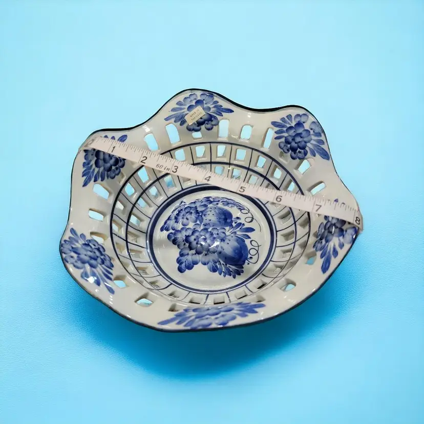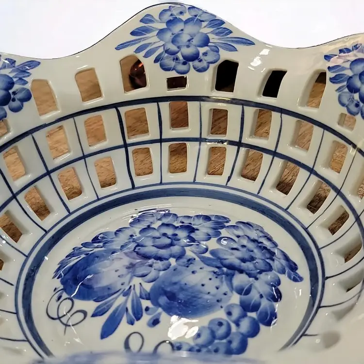 This is a very pretty reticulated bowl, ideal for displaying fruit or even bread for the table. It would add a different touch to displaying Easter eggs too. The bowl is 8" across the top and about 3" high. There are two separate ones for sale individually although combined shipping is possible. The hand painting on each is slightly different but the same pattern. I will provide a 20% discount refund on the total purchase price of two, except for cost of shipping which you pay. If you want just one, the price remains as stated here for one. Shipping quoted here is for 1 bowl.