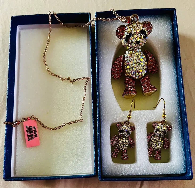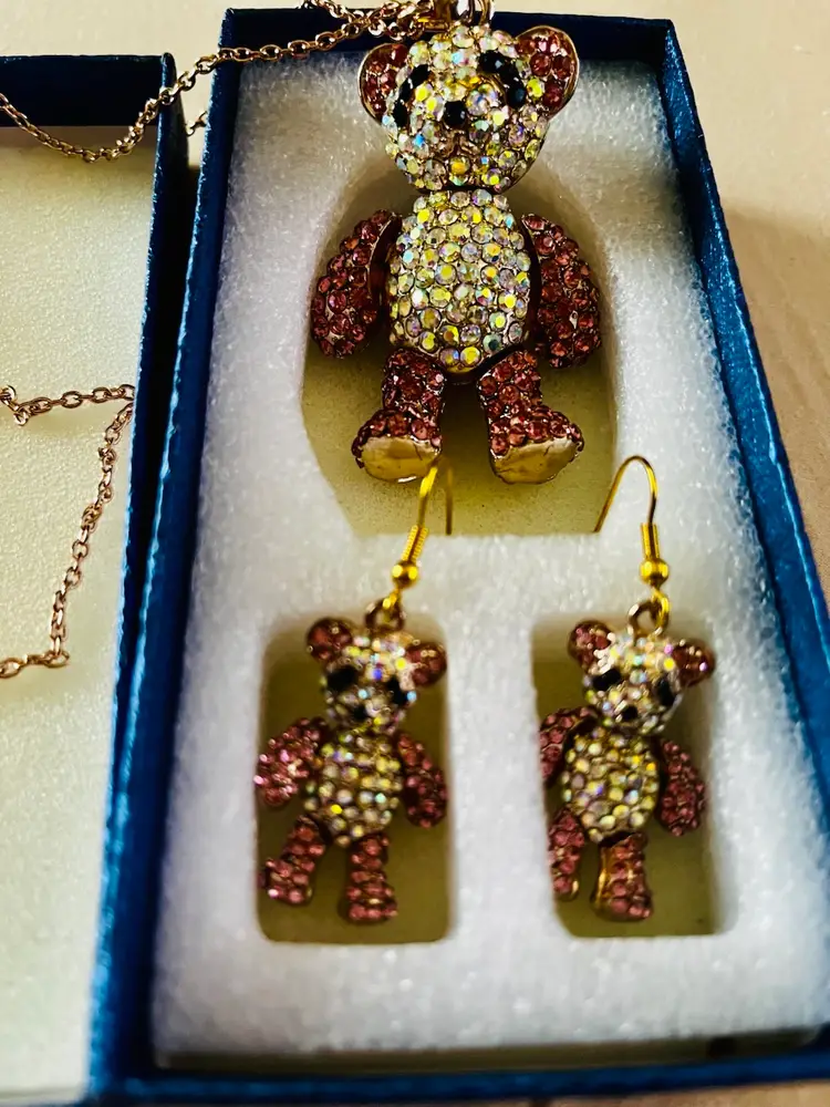 Eye-catching and unique rhinestone set. New in gift bix. Joints on the bears move.