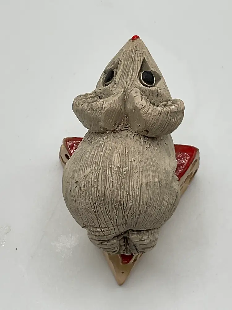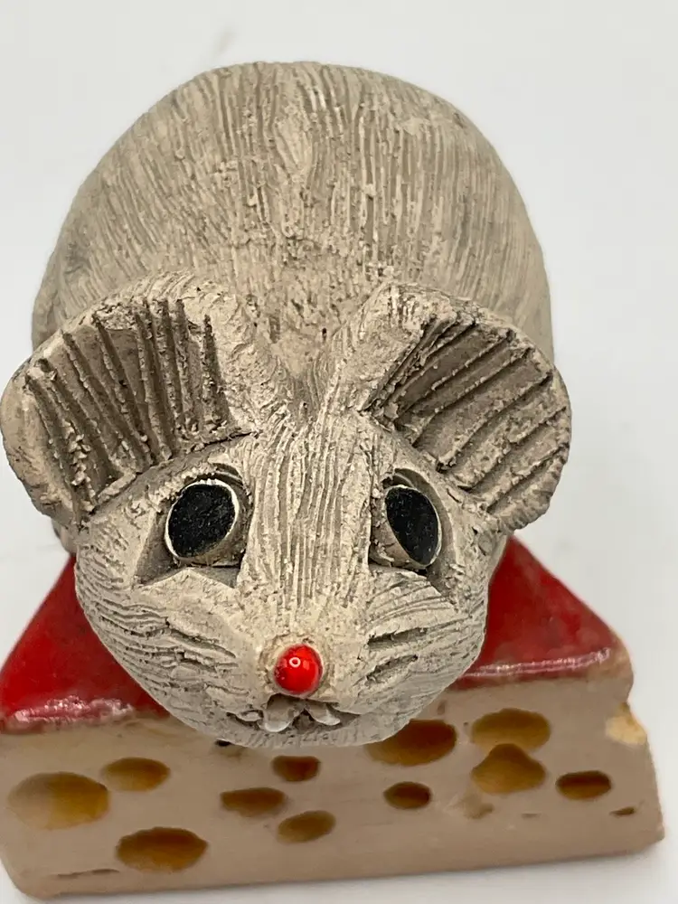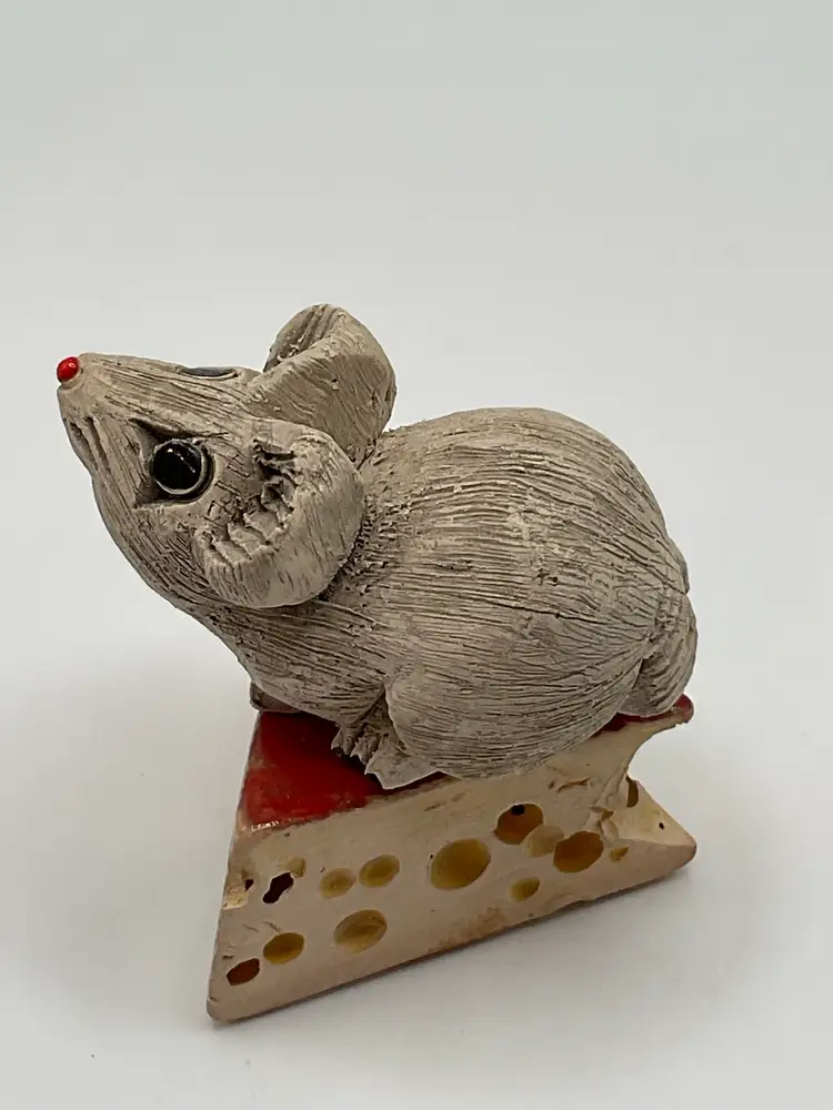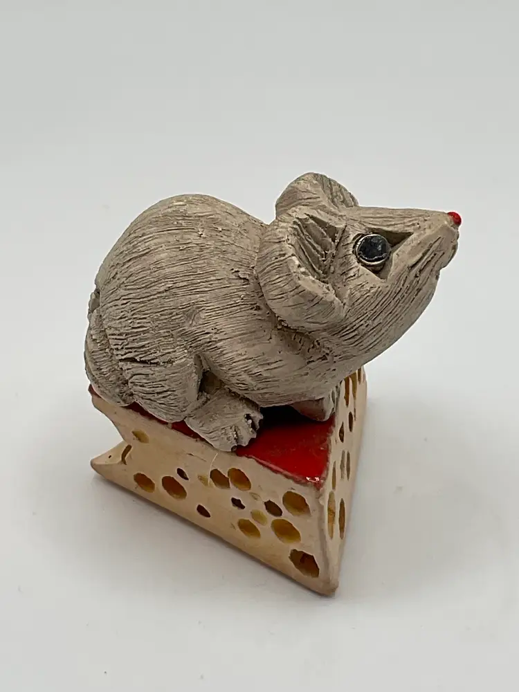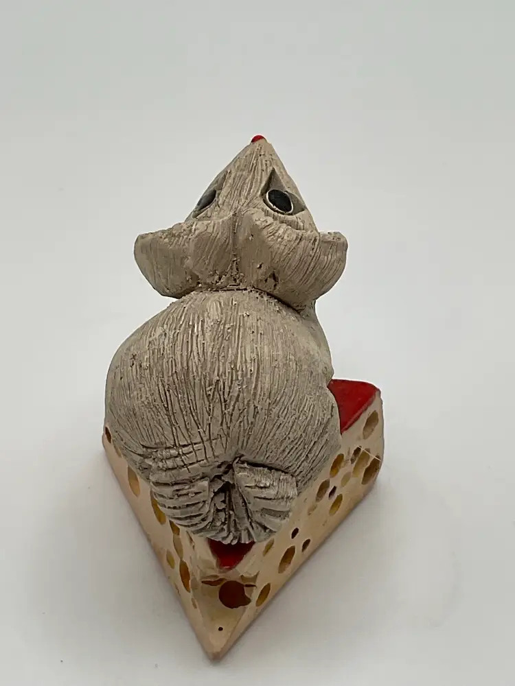 This Artesania Rinconada mouse figurine is sitting on a wedge of cheese and is approximately 2" tall, 2.5" long, and 1.75" wide. He is in excellent vintage condition-no chips, cracks, or repairs.