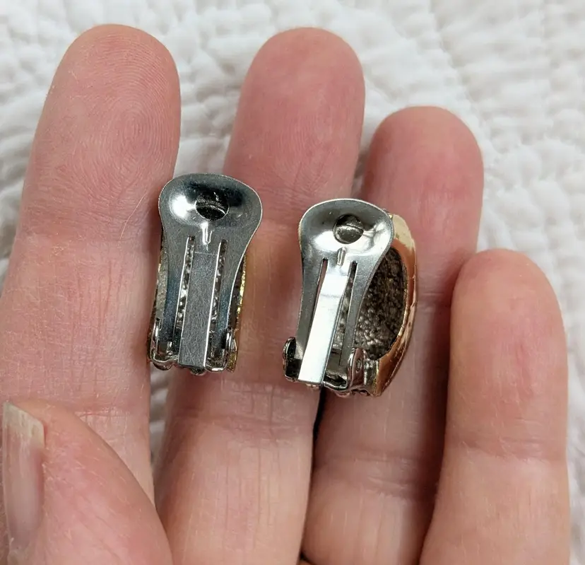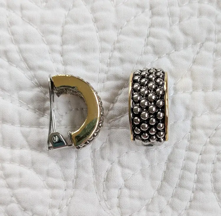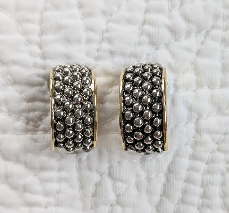 Elegant clip-on earrings featuring a textured beaded design in silver and gold tone. Perfect for adding a touch of vintage charm to any outfit. Excellent condition. Unmarked, as Brighton pieces typically are, but this piece was owned by my mother who sold Brighton jewelry.