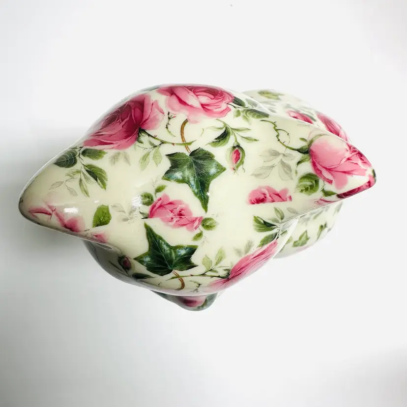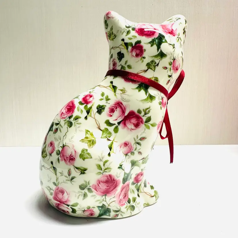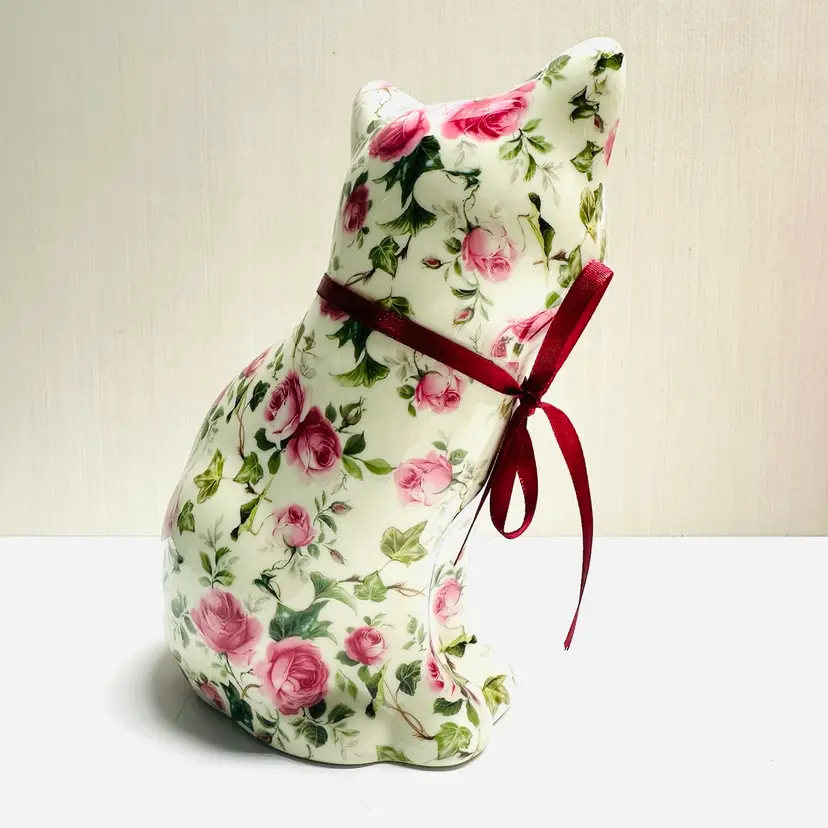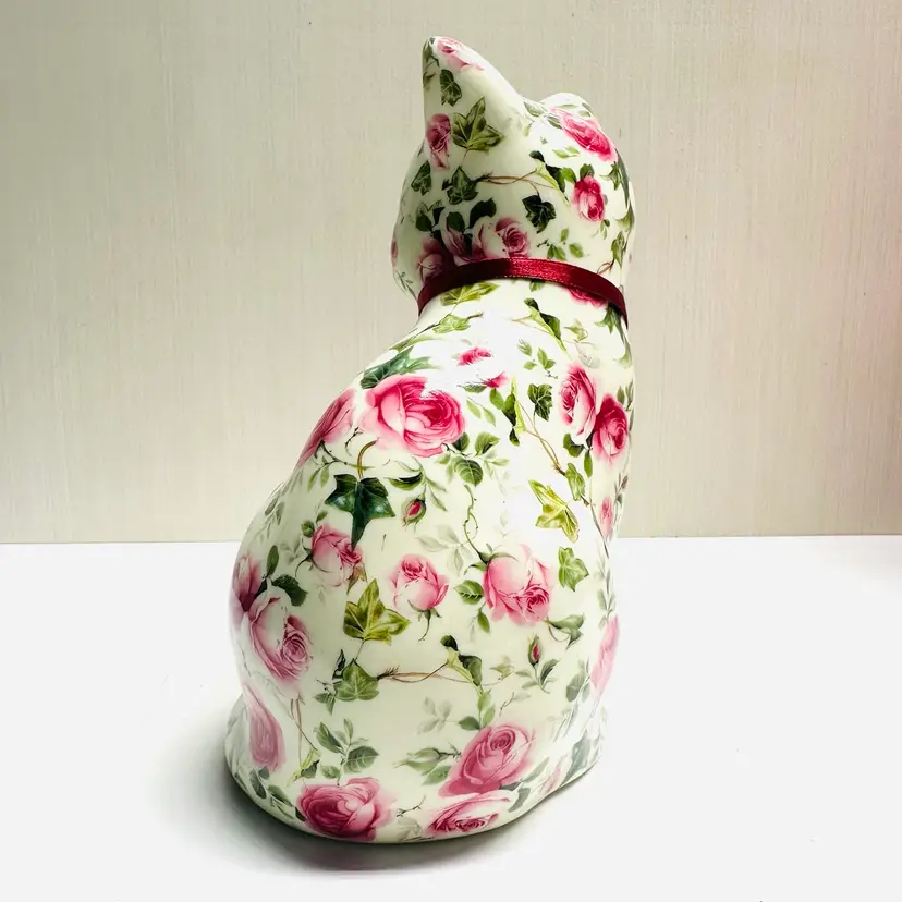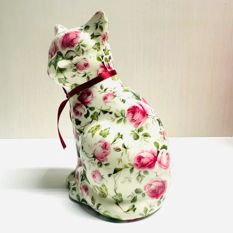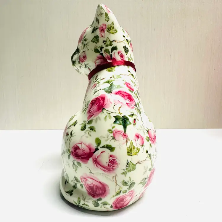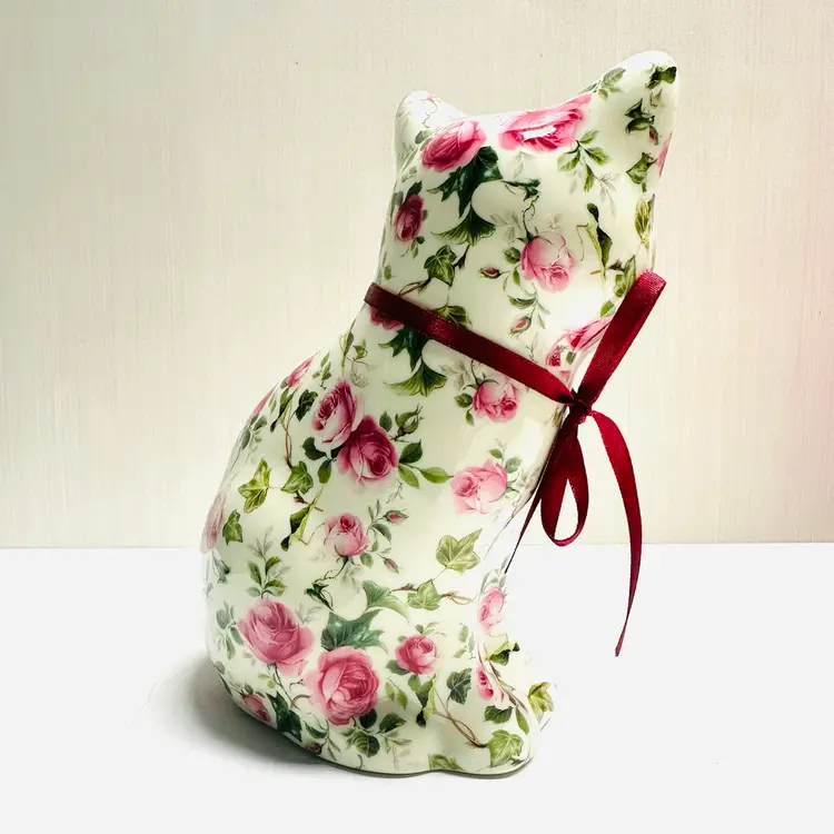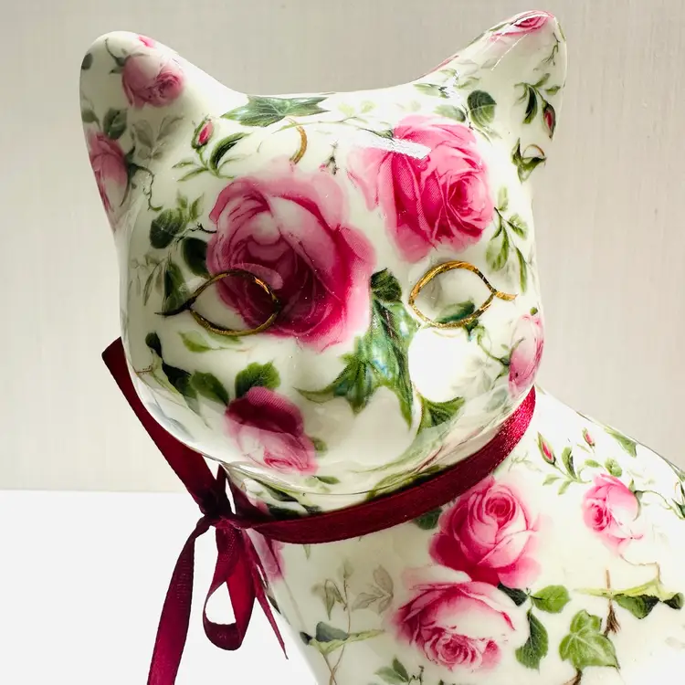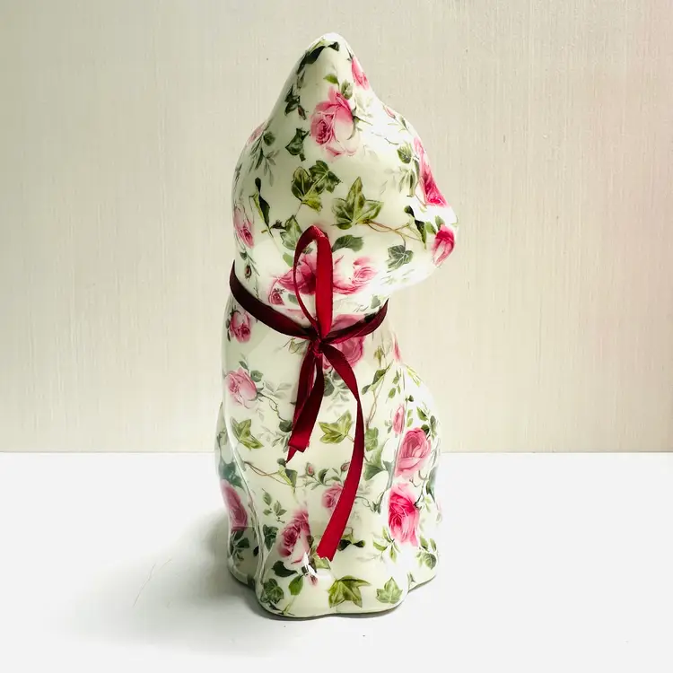 Previously owned Formalities by Baum Bros pink rose chintz kitty, kitten, cat, or feline figurine. There is a maker mark on bottom of figurine (see pictures).