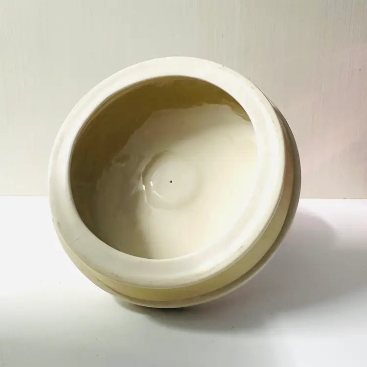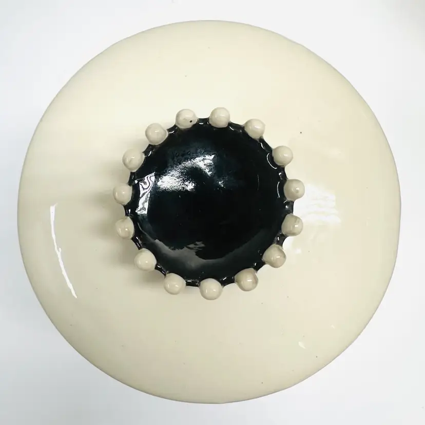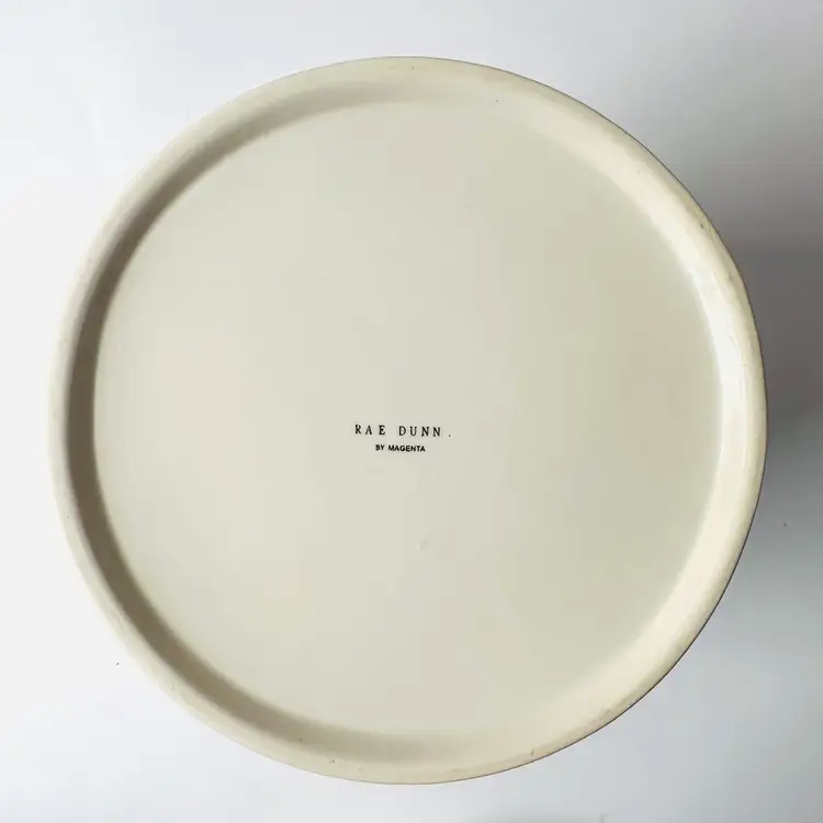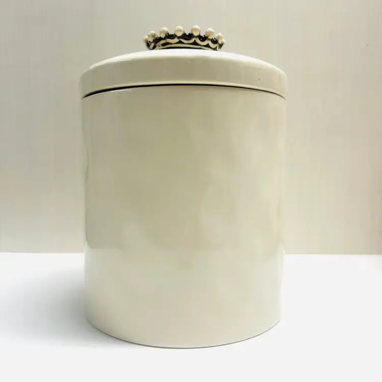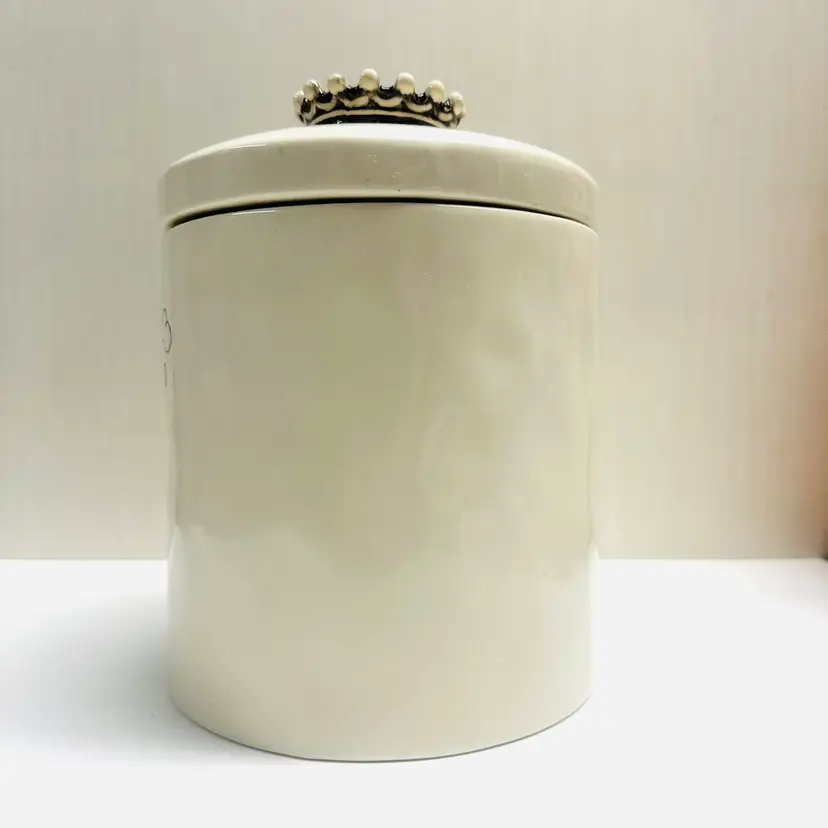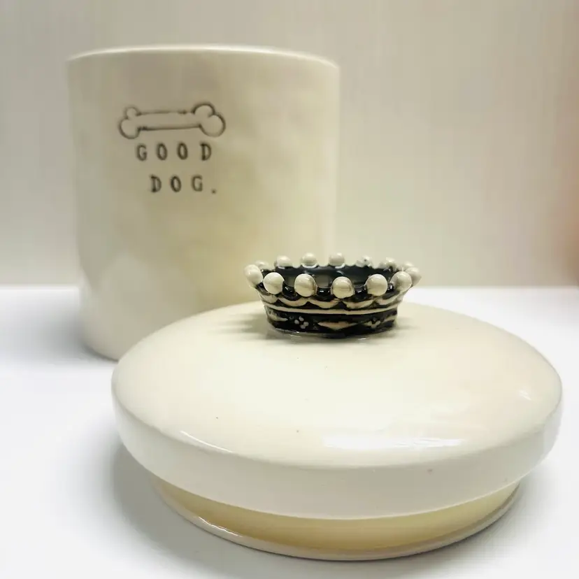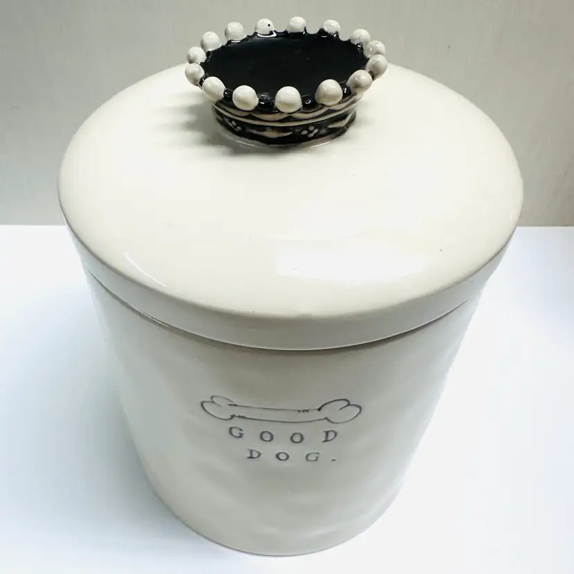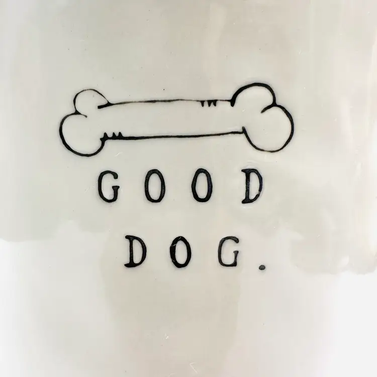 Previously owned Rae Dunn Good Dog lidded ceramic lidded canister or container. There is a maker mark on bottom of canister (see pictures). Black and white detailing on lid.