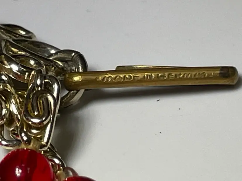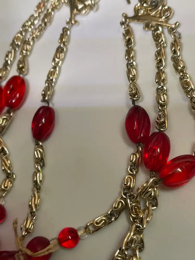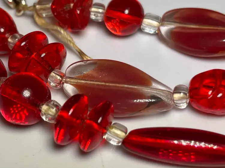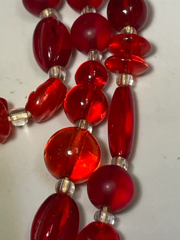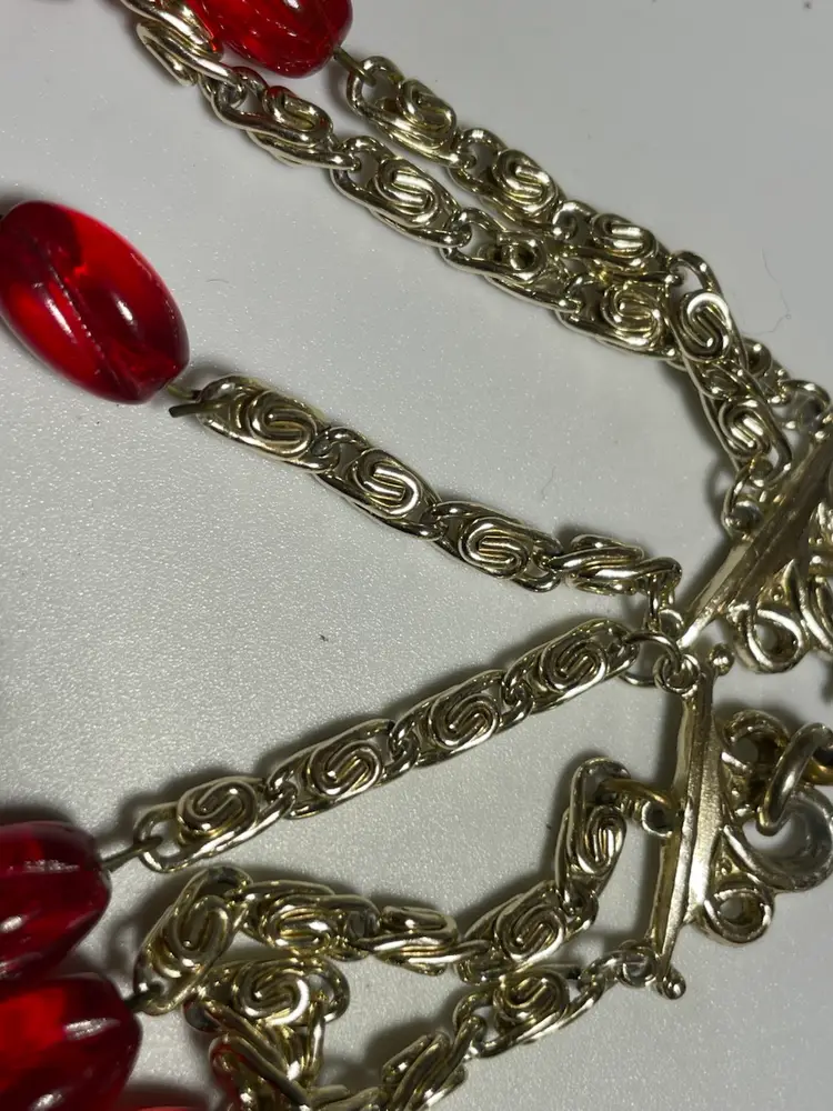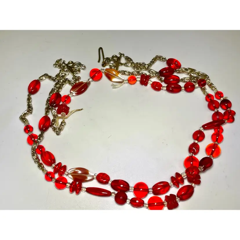 Incredible vintage made in Germany, triple strand pressed glass necklace, translucent and frosted cherry red an incredible condition with very high polish on the chain 15 inches long.
