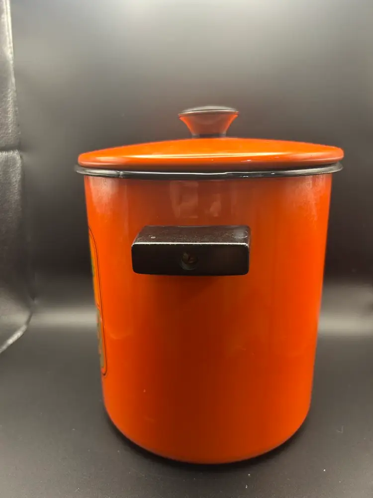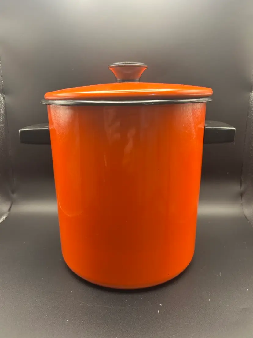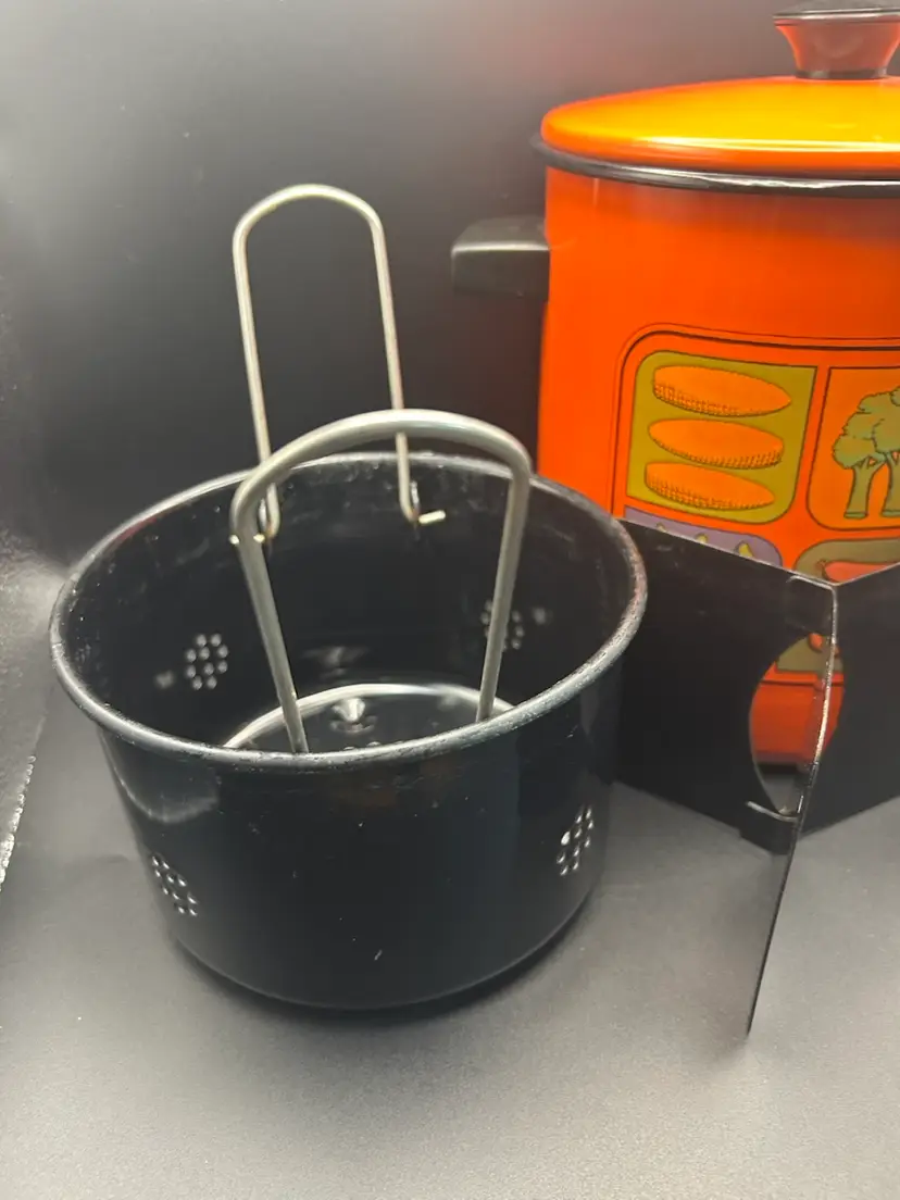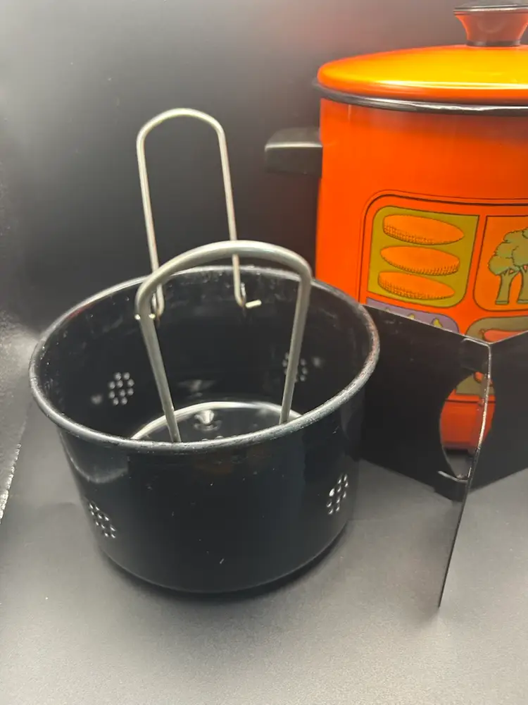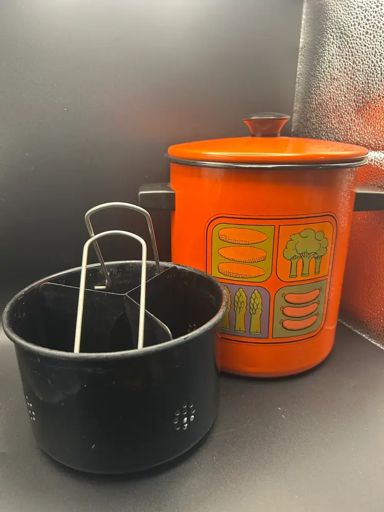 This multi-use enamel ware pot can be used for many things. It is in mint condition, a few chips on the lid but it does not effect the use of the pot. It is 4.5 quart pot with a removable steamer basket. The retro 70’s look would put a pop of color in the kitchen. It measures approximately 8” tall and 7” in diameter.