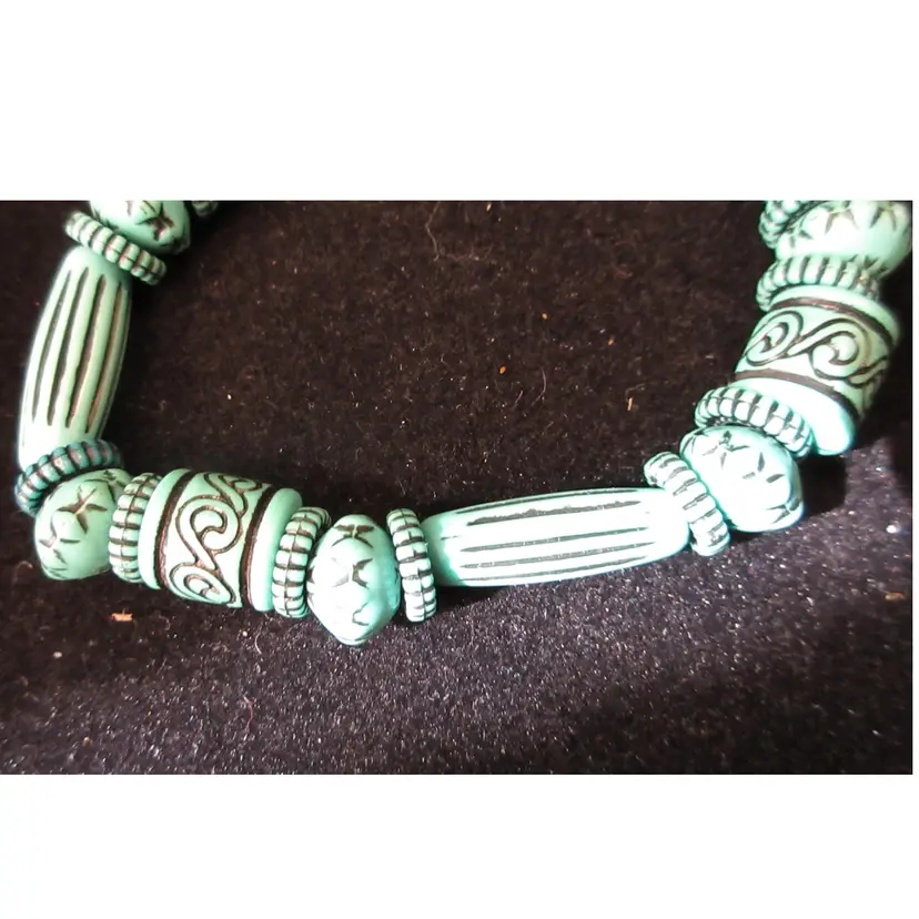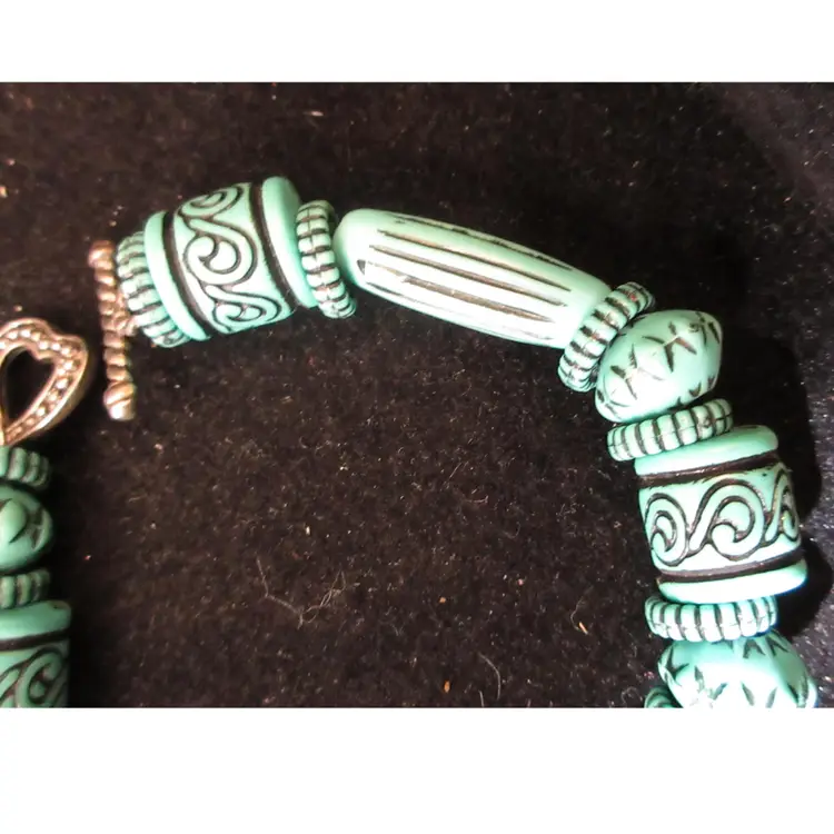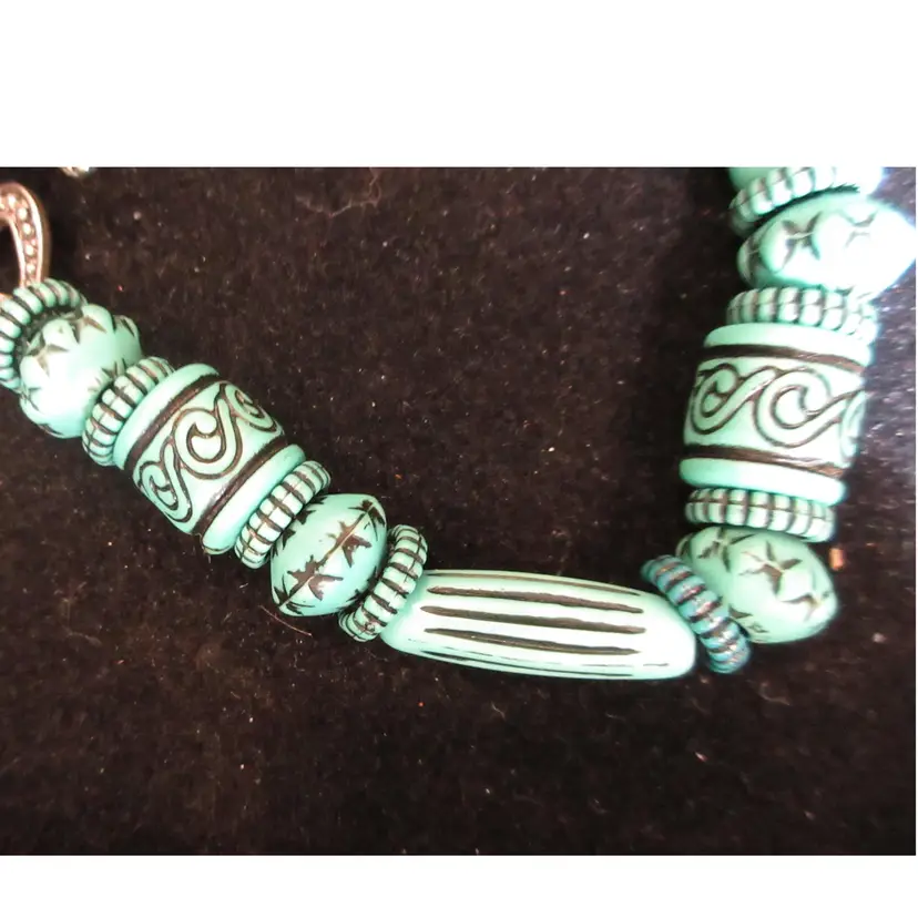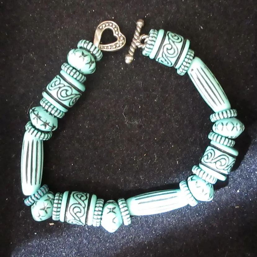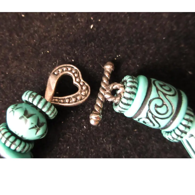 This is a BEAUTIFUL faux turquoise bracelet in a Southwestern theme. The beads are made of acrylic plastic and are in various cylindrical shapes. They have black embellishments on them that evoke a Southwestern feel. This bracelet is 9 inches long and has a heart toggle closure.