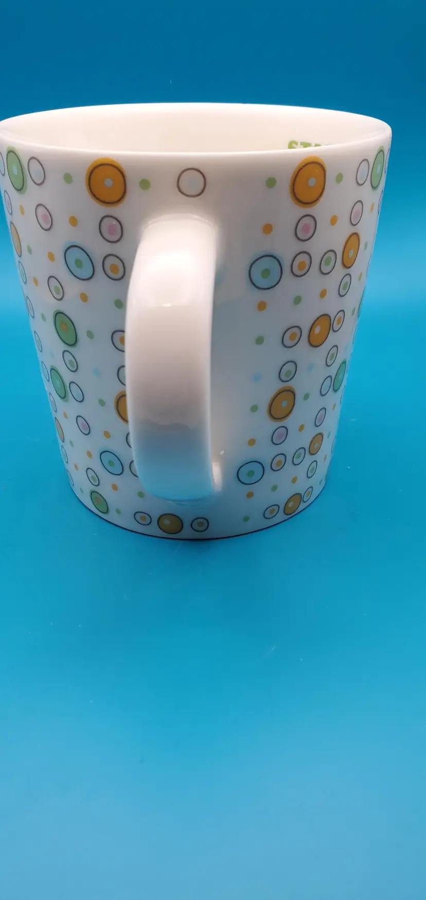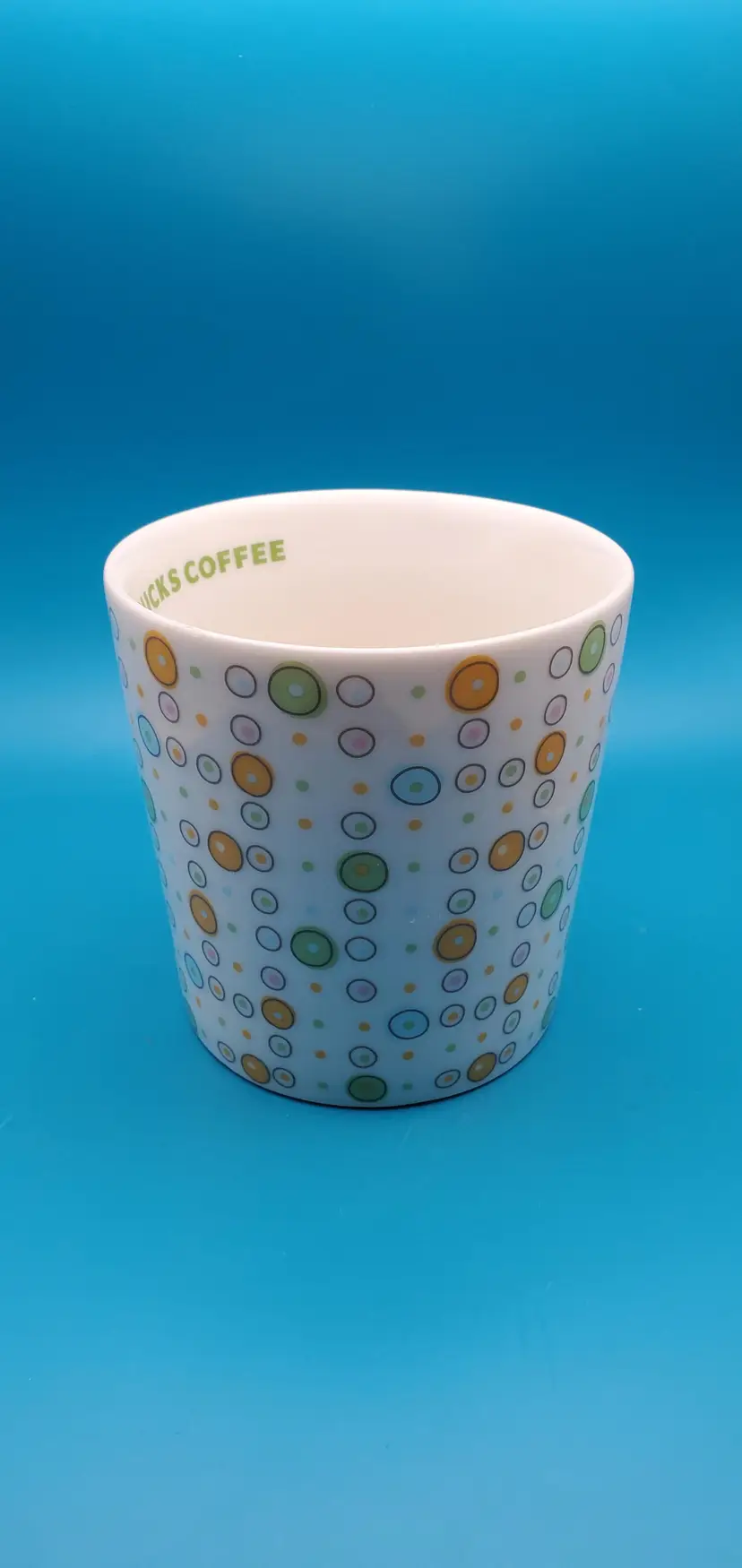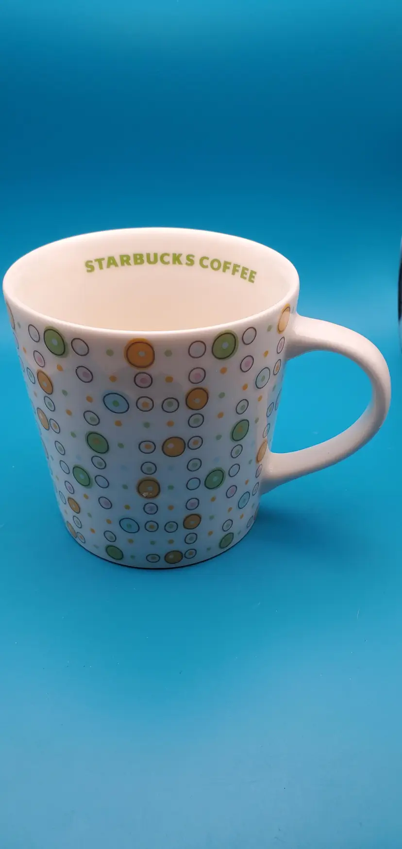 Charming white ceramic coffee mug adorned with a playful array of multicolored polka dots. Perfect for your morning brew or as a cheerful addition to your mug collection. Measures approximately 4 inches in height and 3.5 inches in diameter. Pre-owned Starbucks mug in excellent condition.