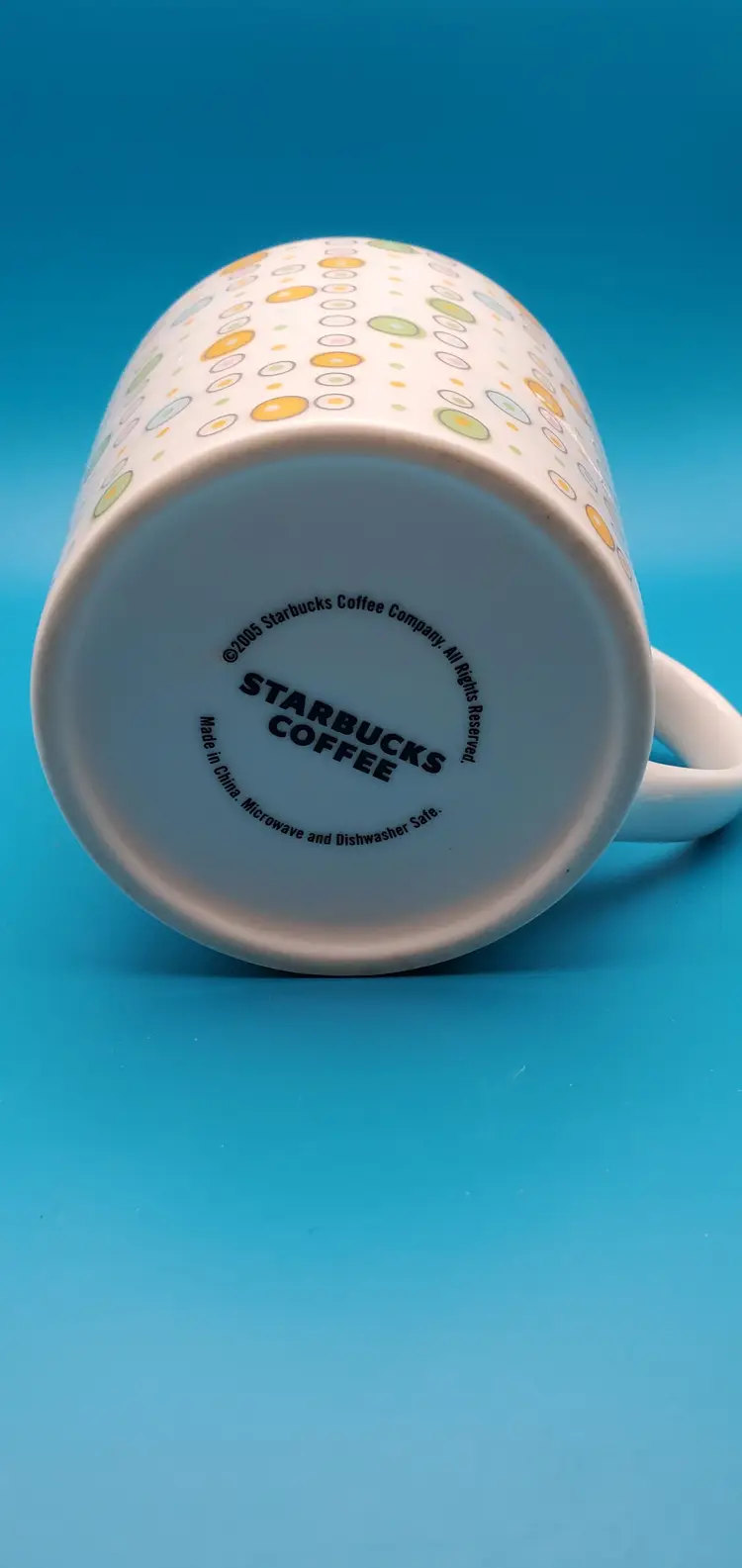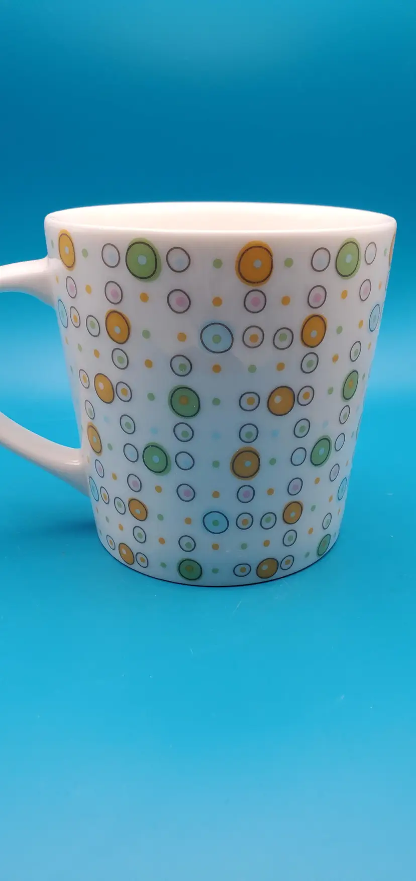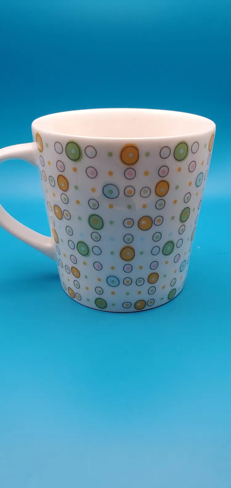 Charming white ceramic coffee mug adorned with a playful array of multicolored polka dots. Perfect for your morning brew or as a cheerful addition to your mug collection. Measures approximately 4 inches in height and 3.5 inches in diameter. Pre-owned Starbucks mug in excellent condition.