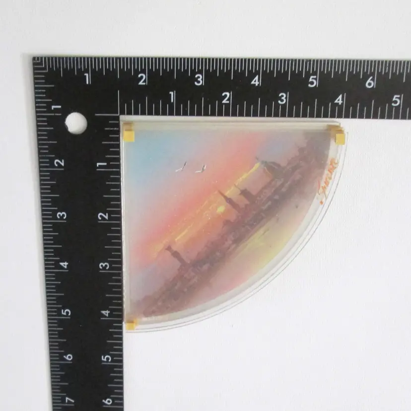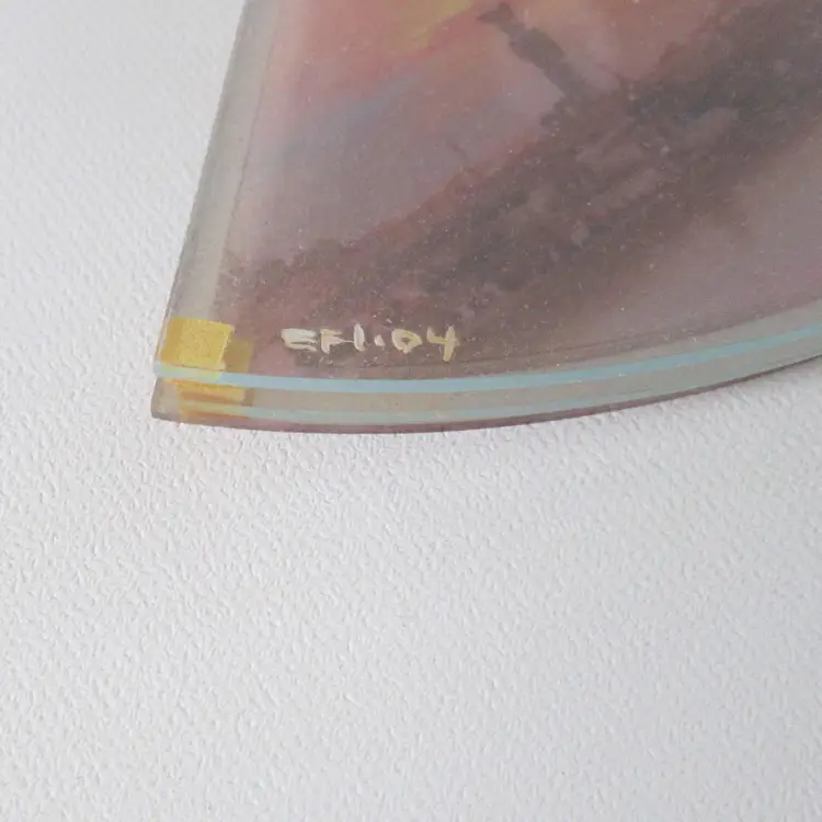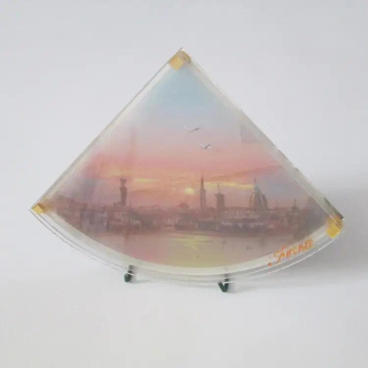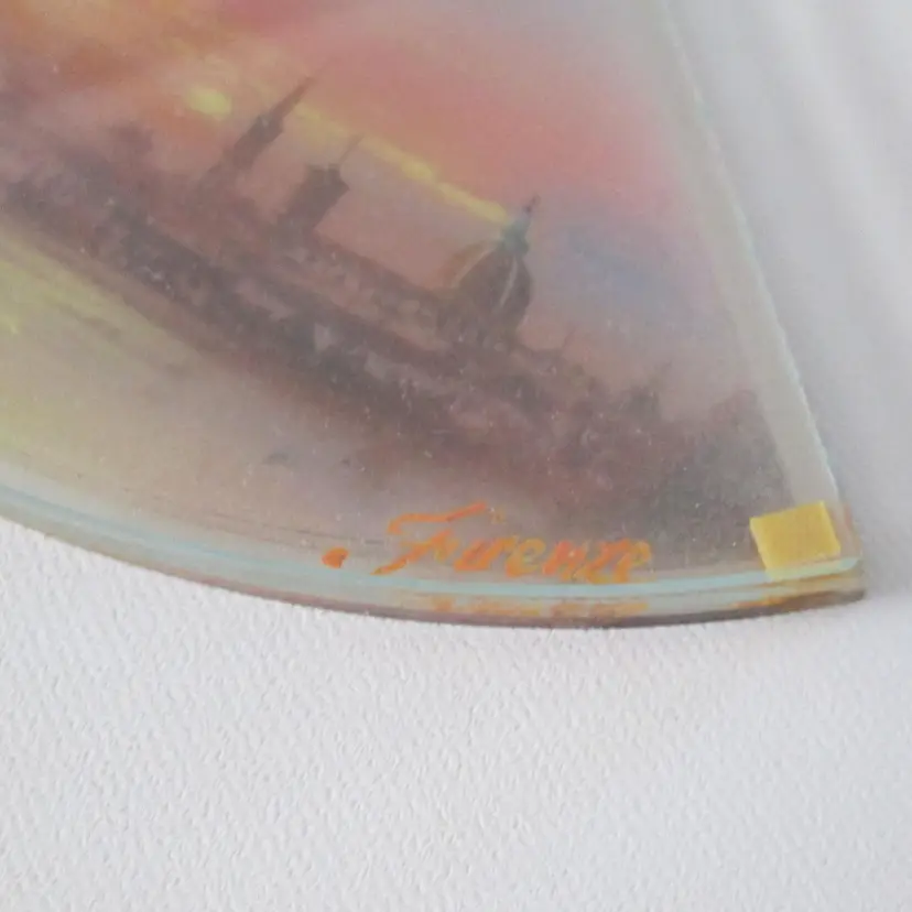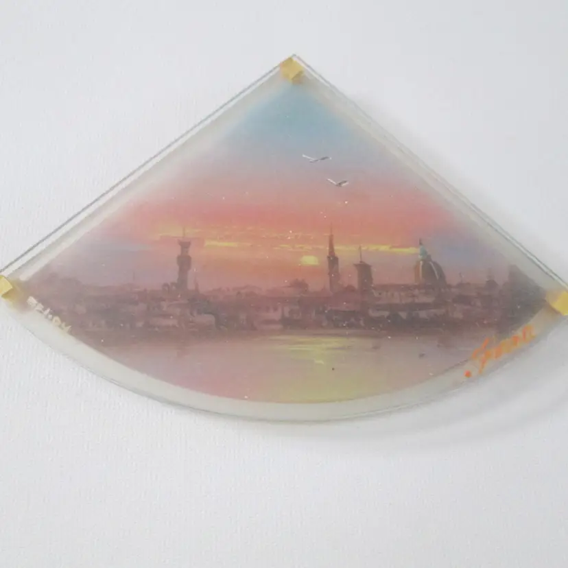 Vintage reverse painted glass picture with stand. A mirror with two layers of glass on top. Beautiful scene of Firenze, Italy at sunset. Signed and numbered in lower left corner. Measures 4" tall x 5" across. Includes a coated wire stand. Beautiful hand painted artwork. Adhesive squares in corners have yellowed.