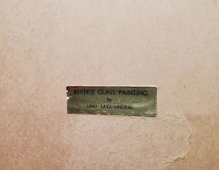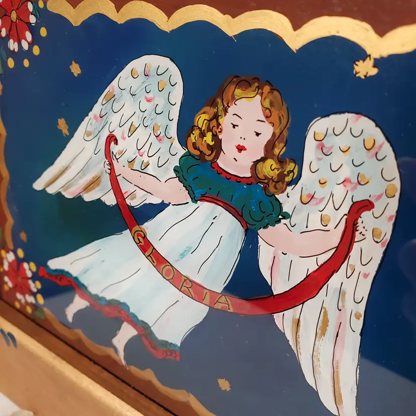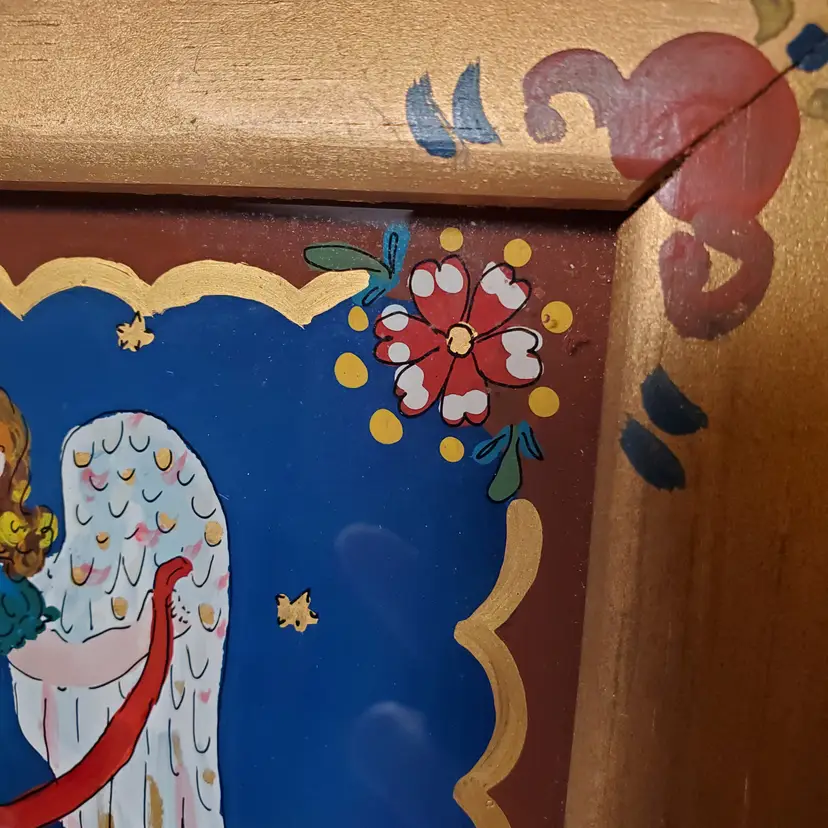 Beautiful, reverse painted on glass angel in hand painted frame. 9" x 10 7/8"