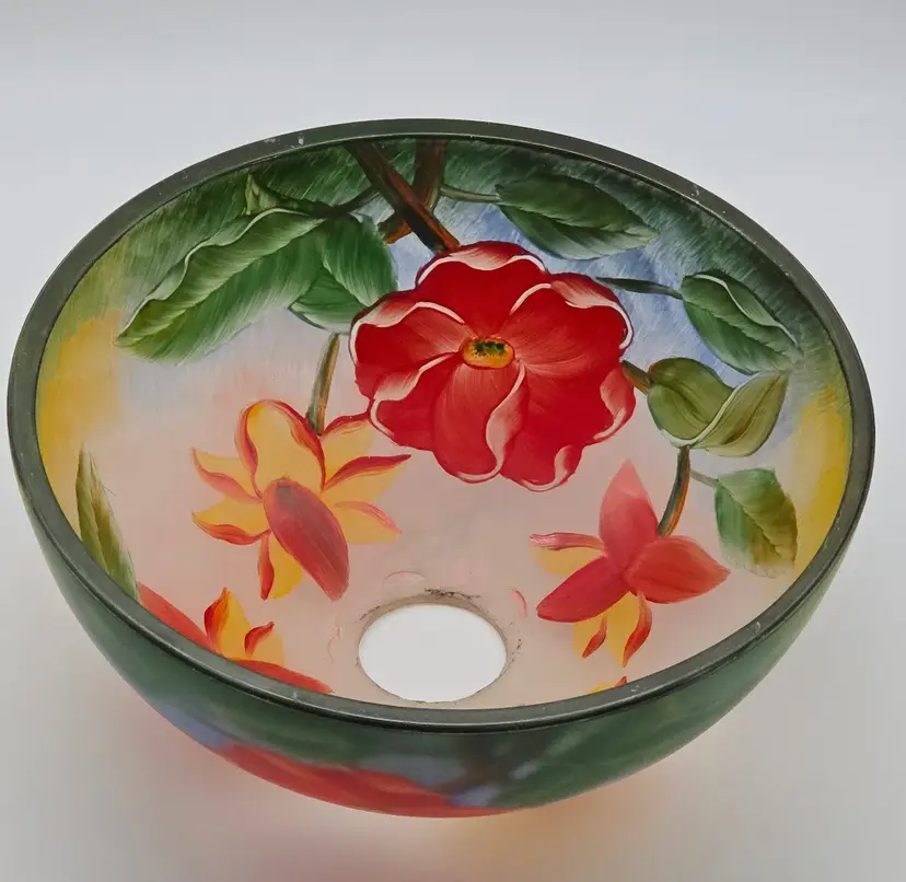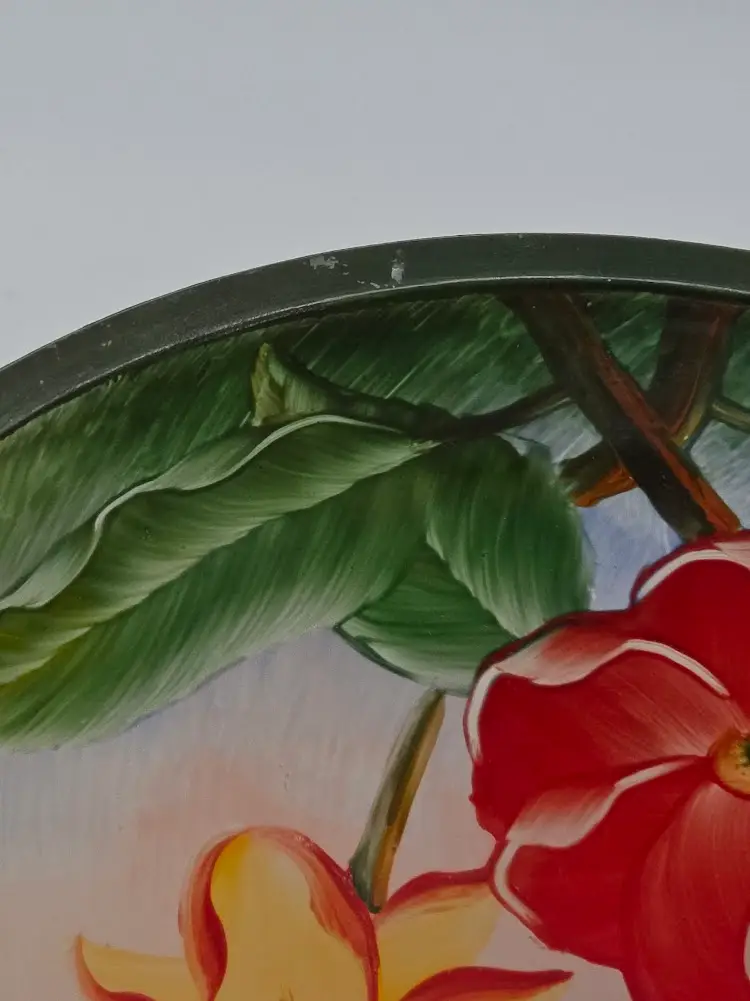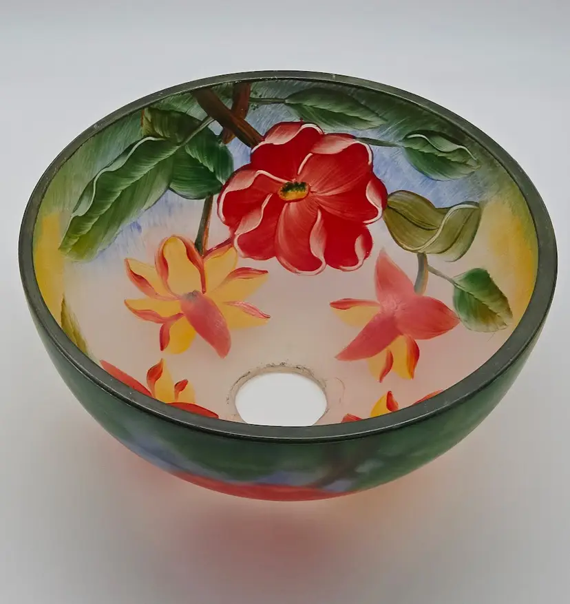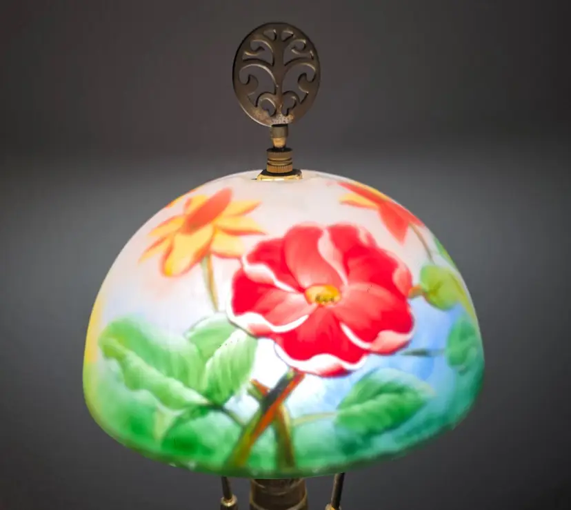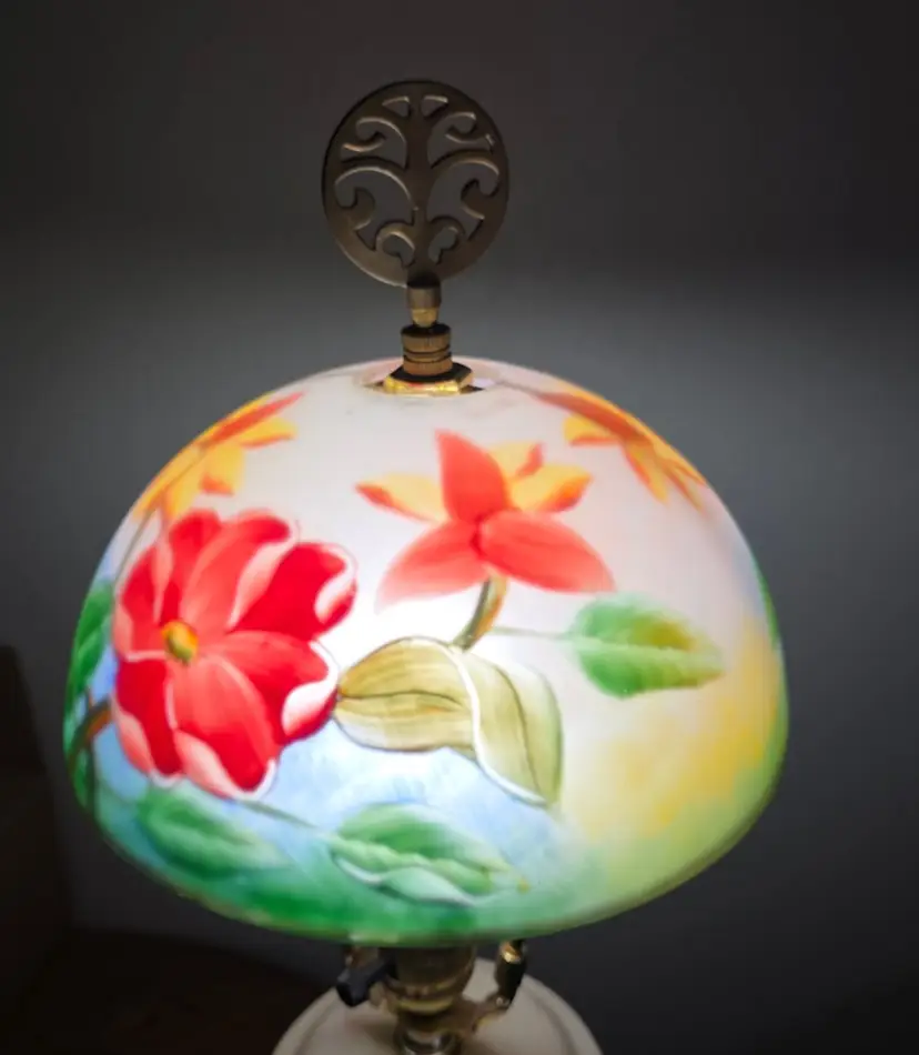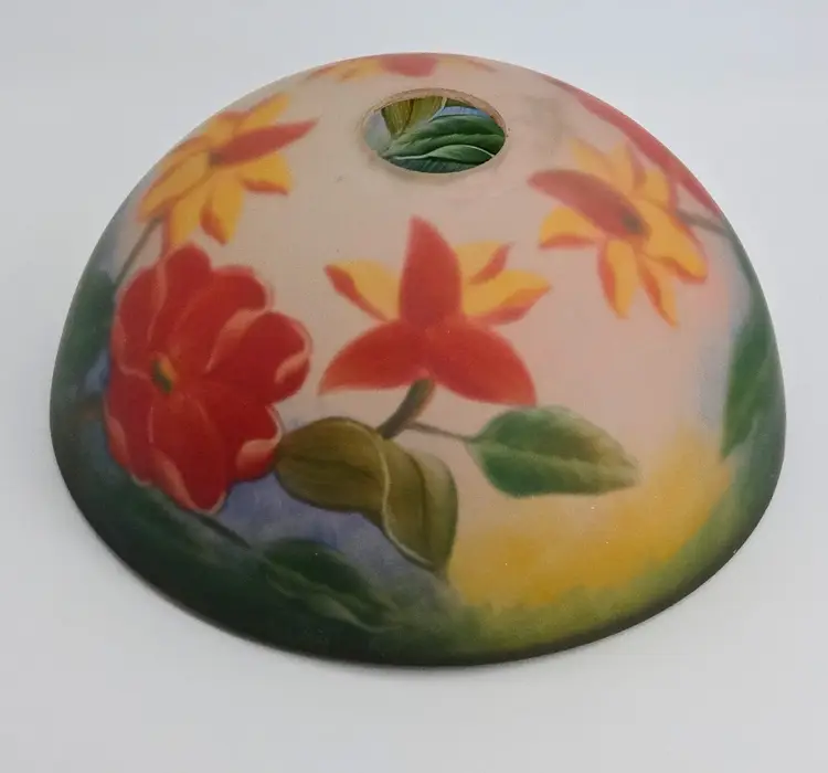 Turn of the century glass dome that is reverse painted with bright orange and yellow flowers. Meant to top a boudoir lamp.
