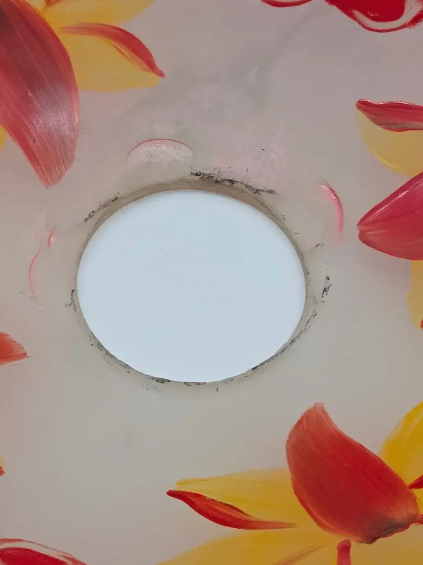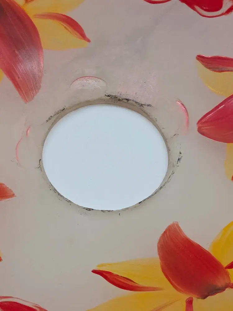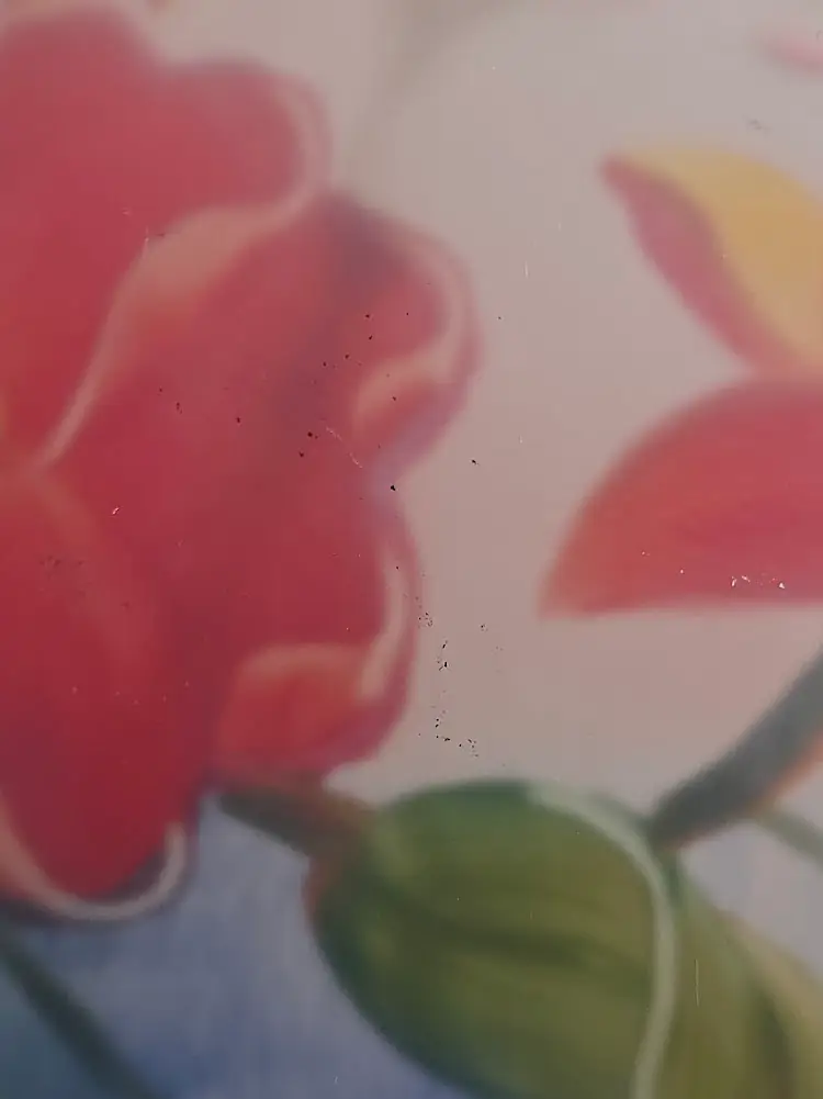 There is very little damage, which is some chipping at the hole at the top on the inside where the hardware would go. The paint is in excellent condition. There are no other chips or cracks. Please see the photos for condition. Overall condition is very good.