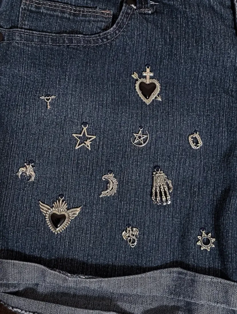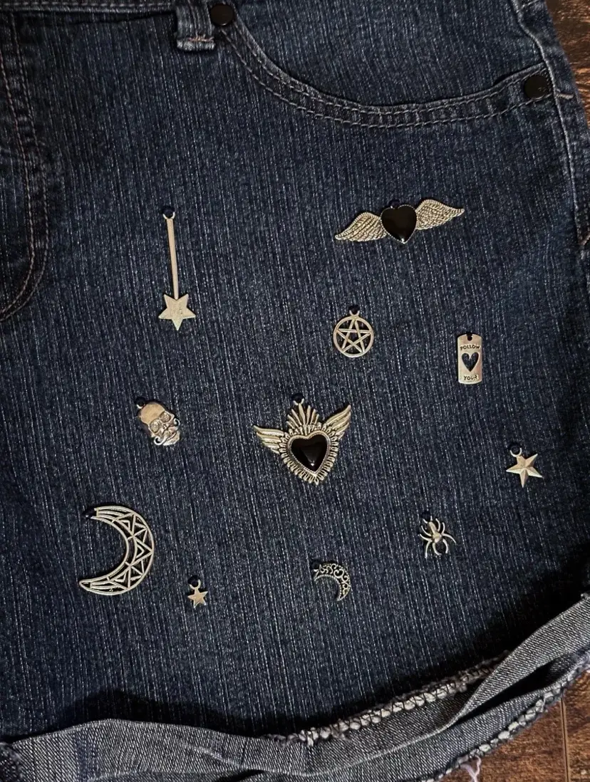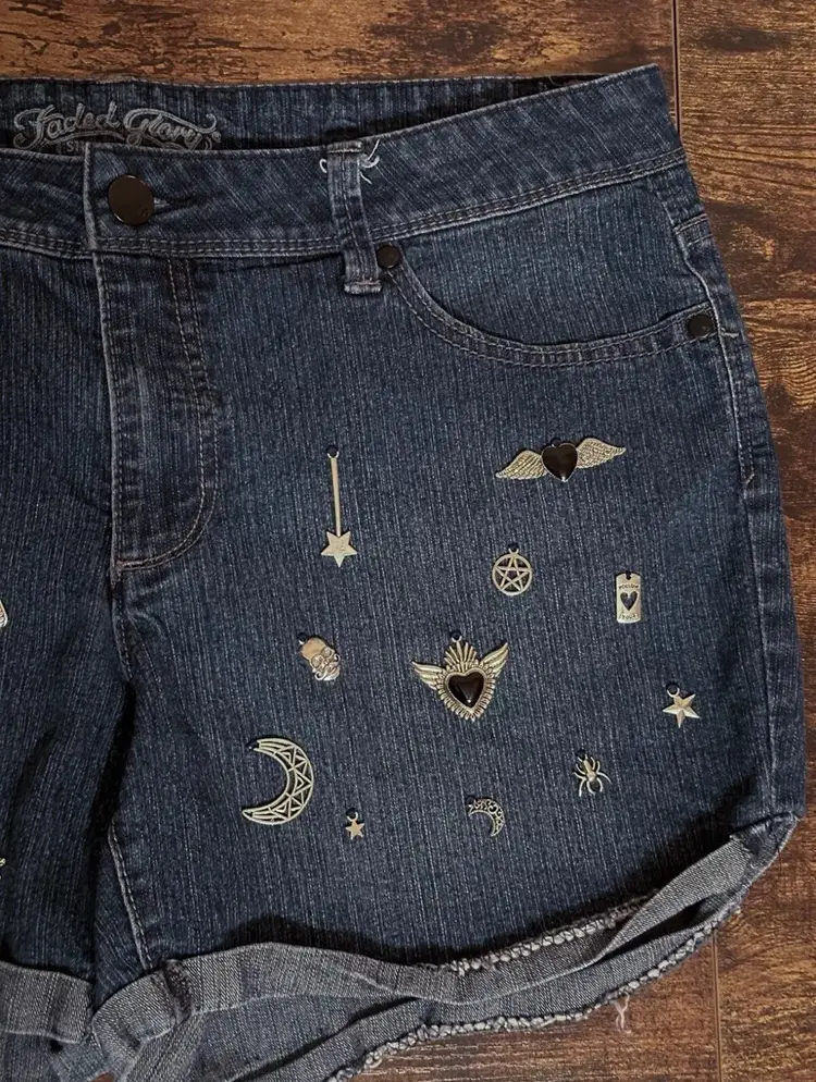 Medium Blue Denim Shorts Silver Black Charms - Embroidered on denim by hand Pockets - front and back Zipper, button closure