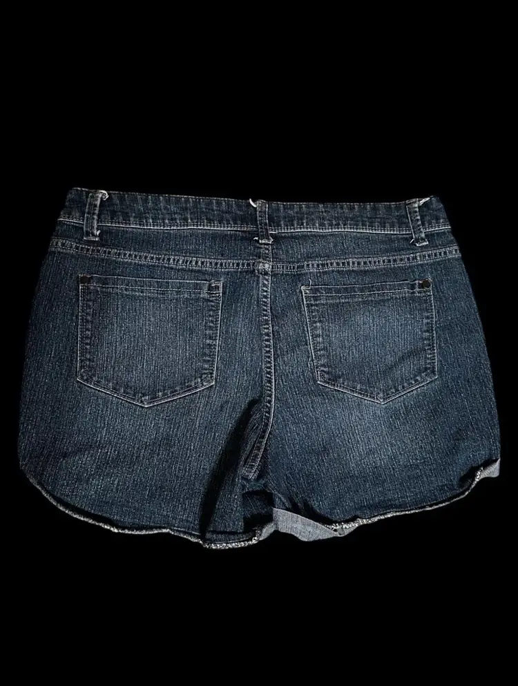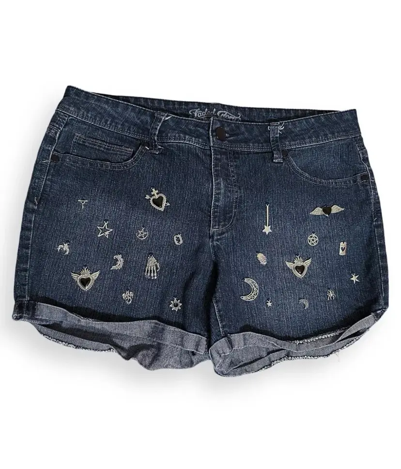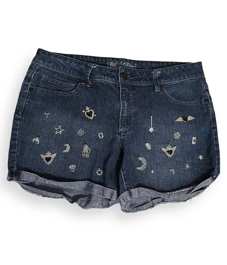 Hand Embroidered Silver Black Punk Gothic 90s Y2K Retro Charms Dark Denim Shorts US Size 14/L