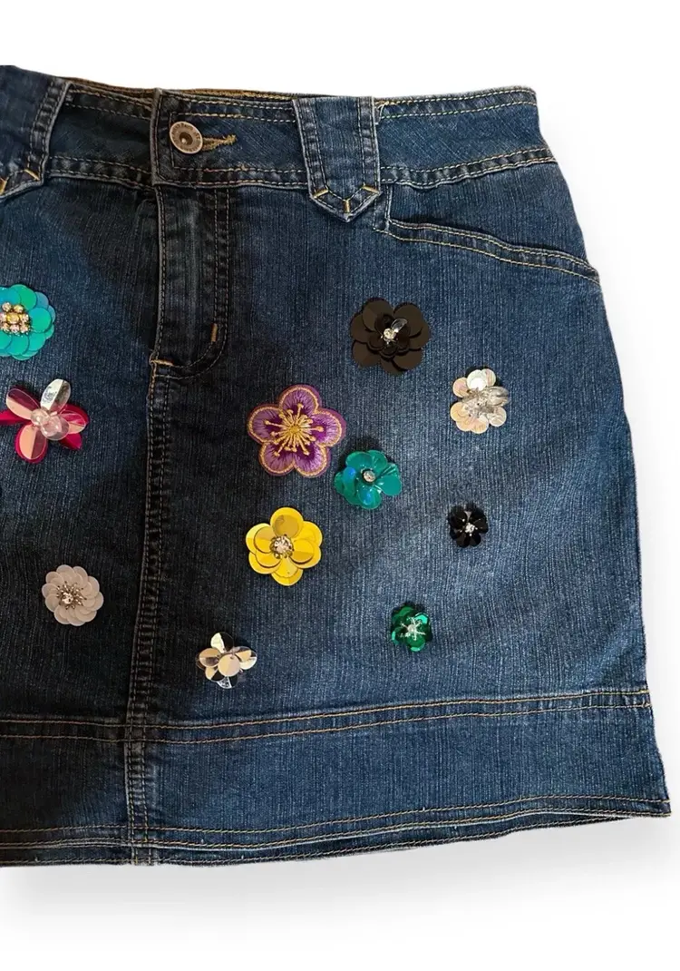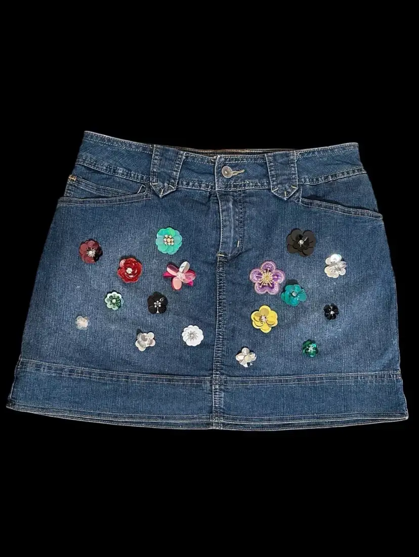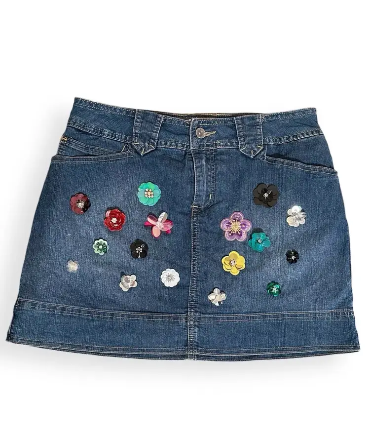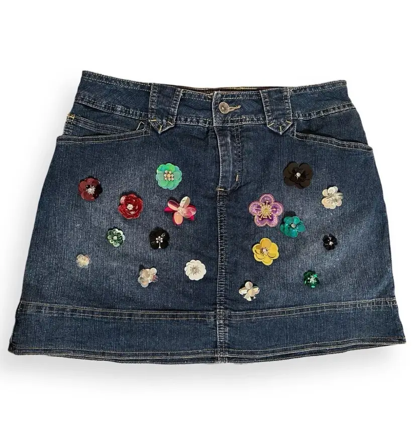 Hand Embroidered Multicolored Sequin Flowers Front Detail Denim Y2K Retro Girl Pop City Upcycled Reworked Mini Skort US Size Petite 8/M