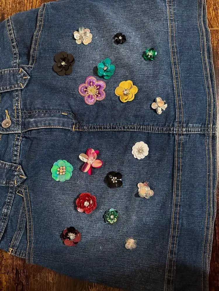 Medium Blue Denim Skort Multicolor Sequin Flowers - Embroidered on denim by hand Front Pockets Front Button Closure