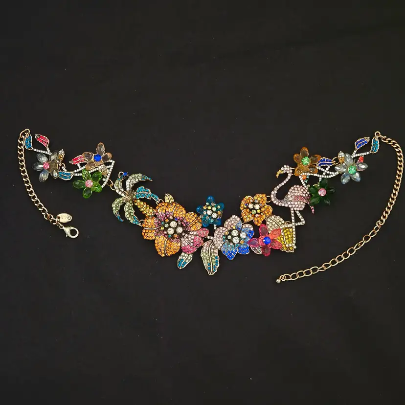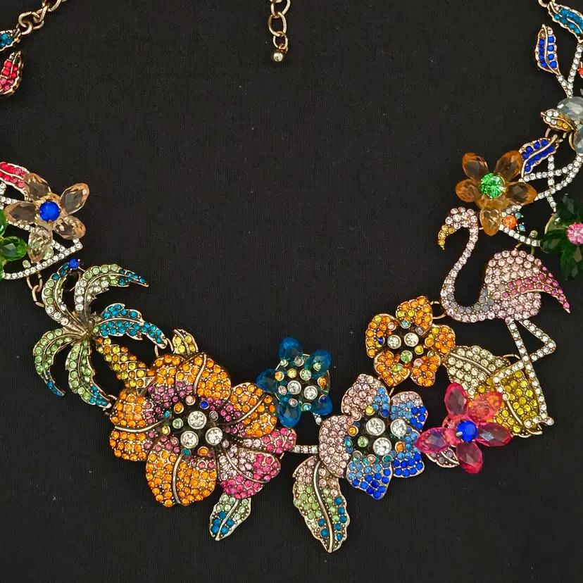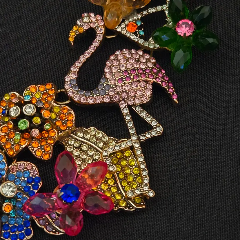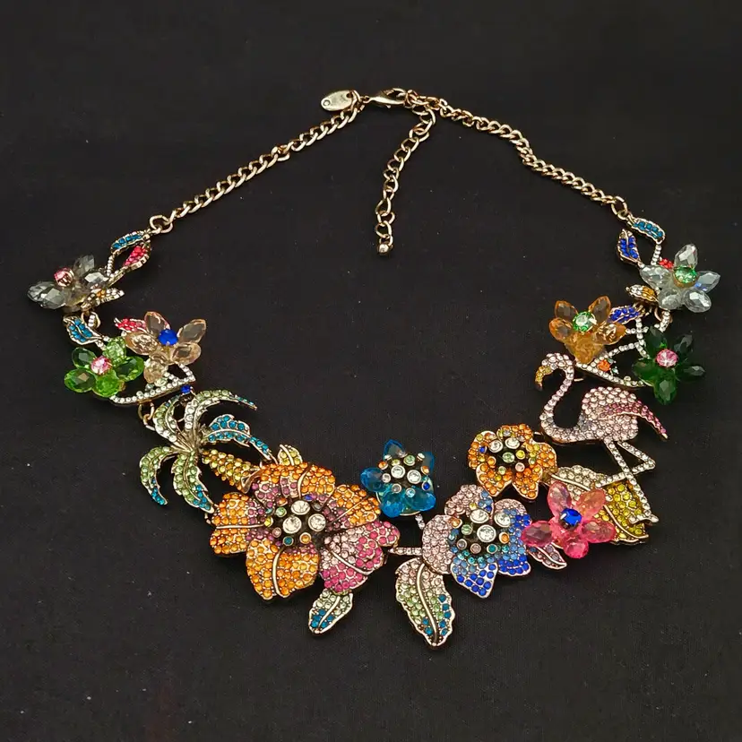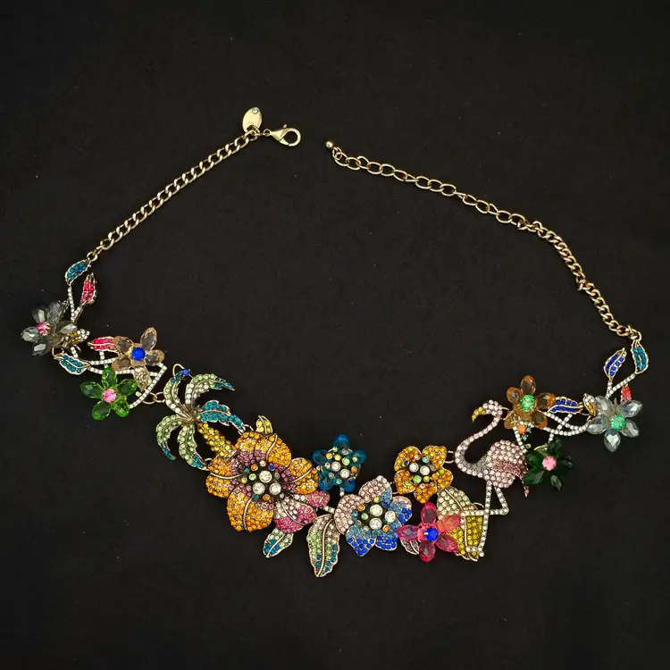 Rhinestone Floral Flamingo Necklace Statement Multicolored Unbranded +12" Long (possibly by Christian Siriano). Used condition with no extensive signs of use. Please view all the photos and please ask any questions prior to purchase when possible.