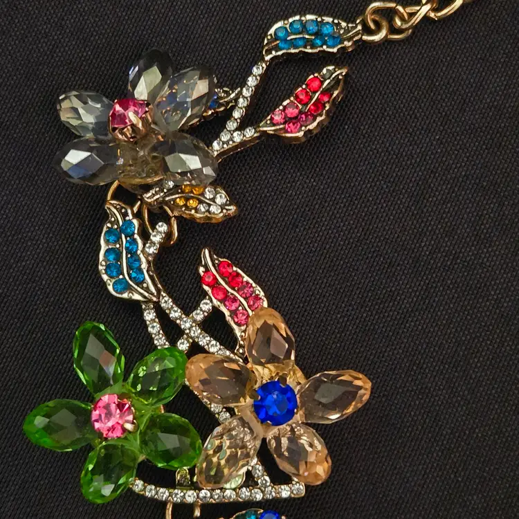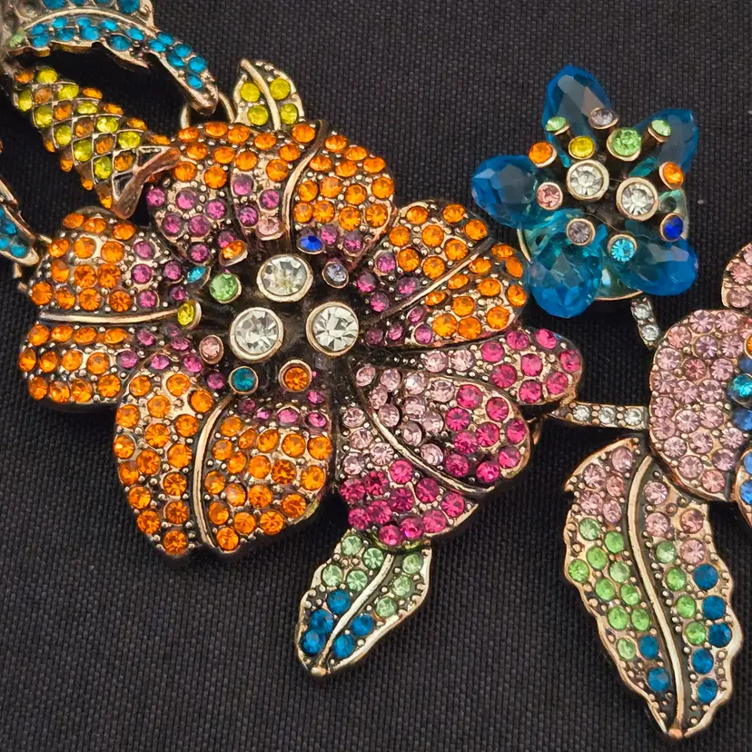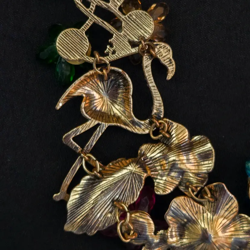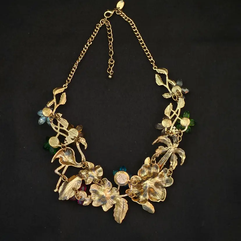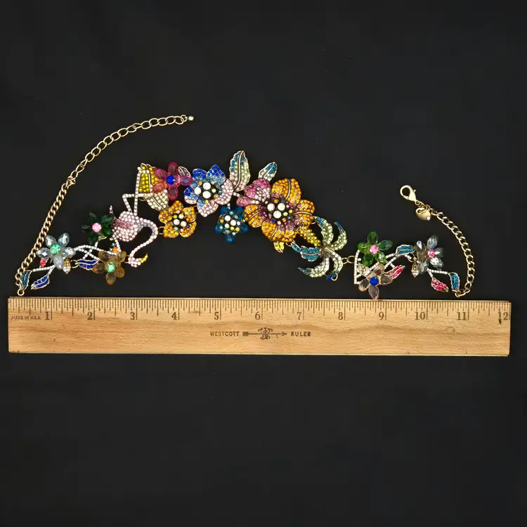 Rhinestone Floral Flamingo Necklace Statement Multicolored Unbranded +12" Long (possibly by Christian Siriano). Used condition with no extensive signs of use. Please view all the photos and please ask any questions prior to purchase when possible.