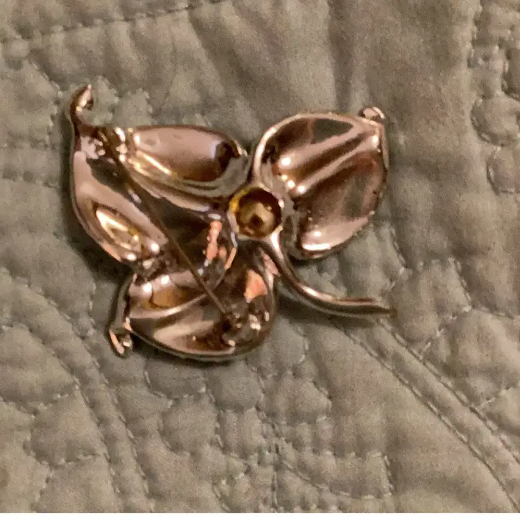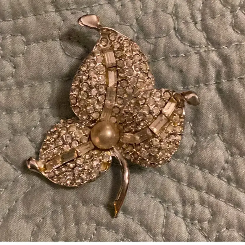 Rhinestone leaf brooch with square little rhinestones in it there might be a stone missing out of it