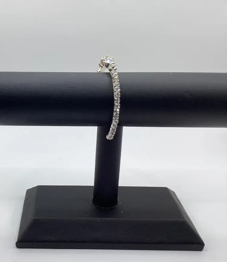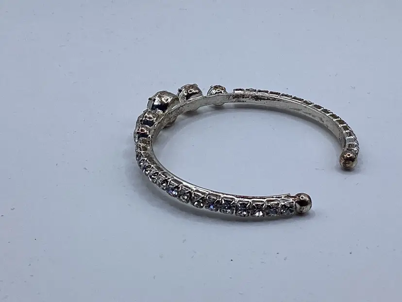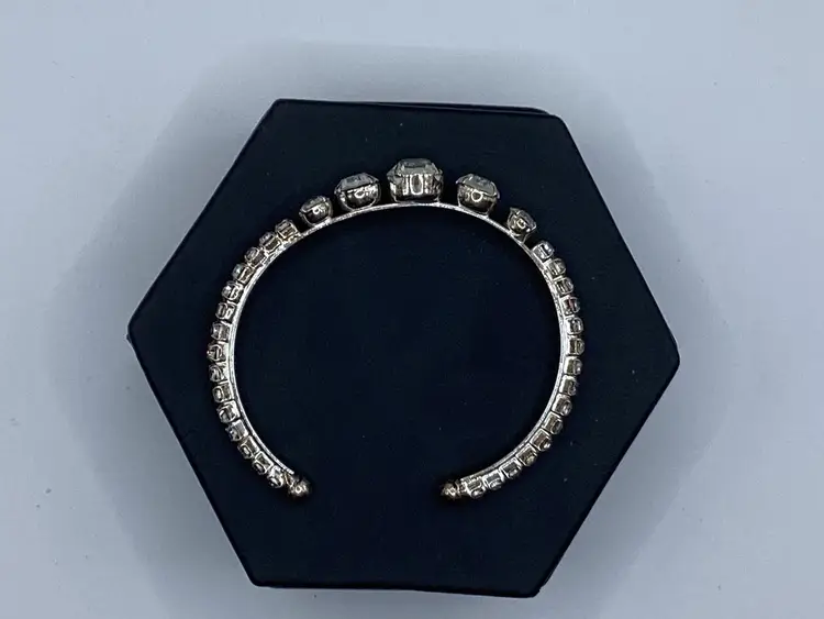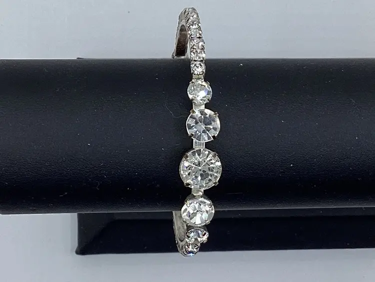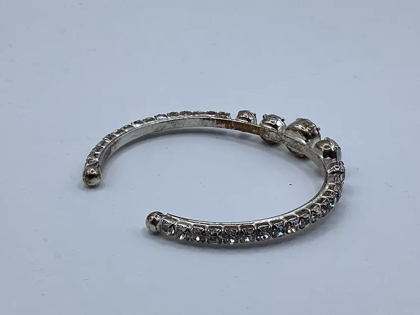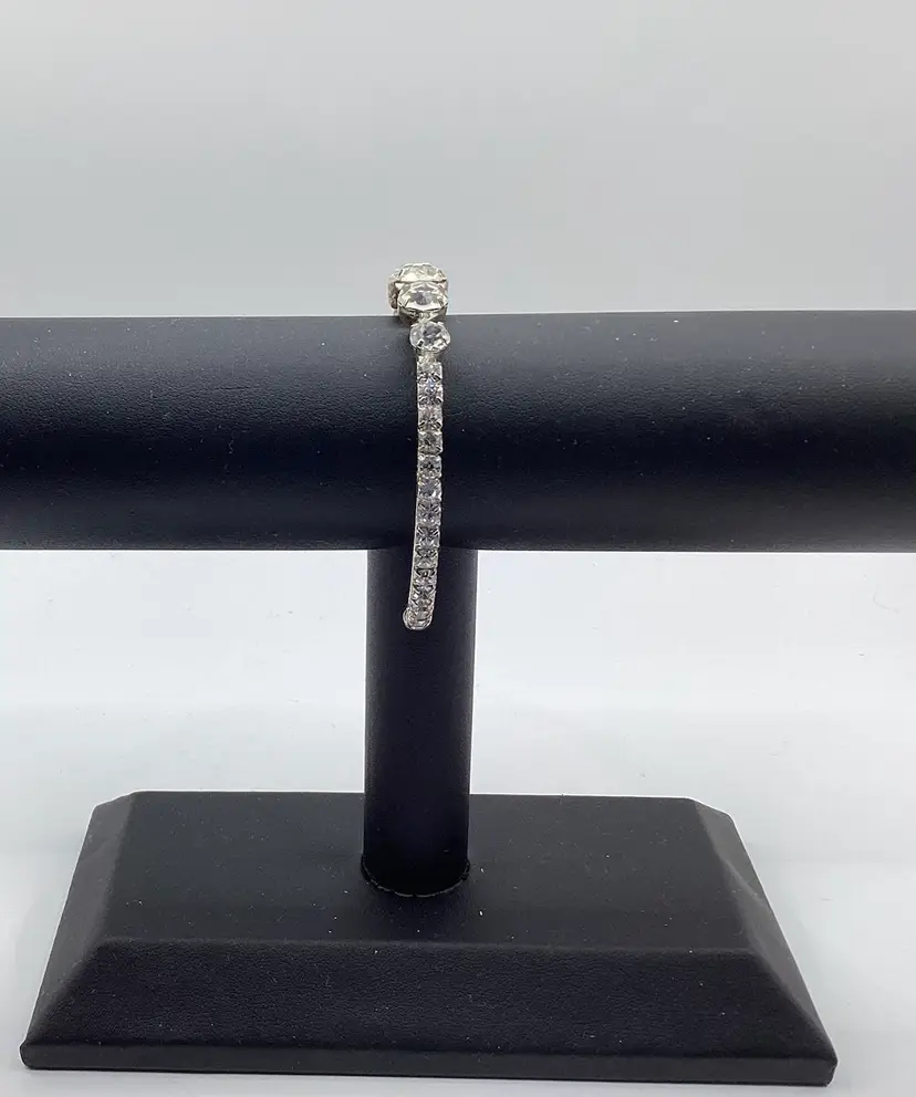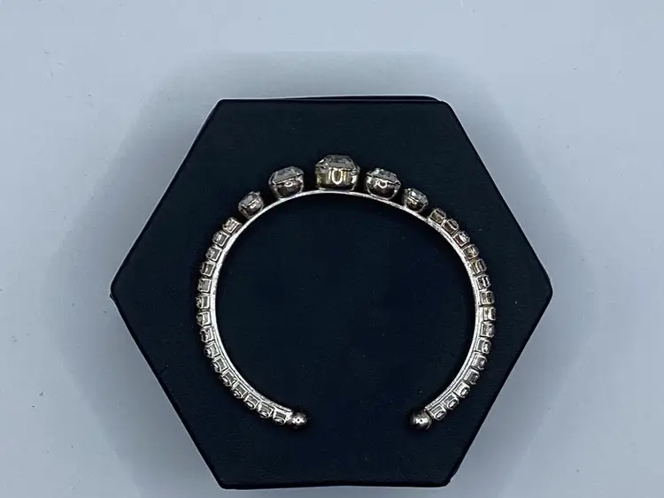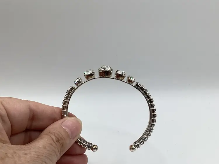 Identifier: No identifying marks Features: Easy on cuff / Graduated rhinestones in the center of the cuff with rhinestones down each side to the easy slide on balls Material: Metal / Rhinestones tested on low end of glass on the Presidium Pattern/Design: Cuff Color: Silver tone and clear Measurements: - 2 & 1/4” opening but had some room with it being a cuff