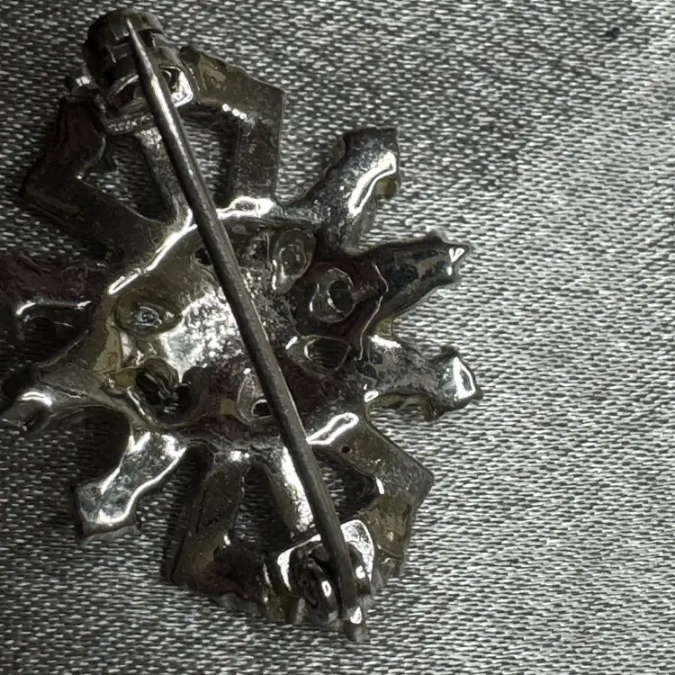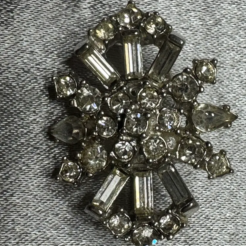 RHINESTONE STARBURST BROKCH likely from the 1950s or 1960s. This era was the "golden age" of rhinestone costume jewelry, characterized by high-quality glass stones and complex, multi-layered settings. Design Features • Stone Variety: This piece features a sophisticated mix of cuts, including round chatons, rectangular baguettes forming the top and bottom "fans," and pear-shaped (teardrop) stones on the sides. • Setting: It is a silver-tone "rhodium-plated" metal. The stones are prong-set, which is a hallmark of higher-quality costume jewelry compared to cheaper pieces where stones are simply glued in. • Construction: The back shows a "closed-back" setting with a standard pin stem and a safety C-clasp, which appears to be in good working order. Condition Observations • Stone Brilliance: Some of the stones, particularly the round ones in the center, show signs of "graying" or "pinking." This happens when the foil backing on the glass stones begins to oxidize over time. • Metal State: The rhodium plating on the back remains quite bright, though there is some light surface wear consistent with age. This would look stunning on the lapel of a dark blazer or used as a "bridal" accessory. Keywords like Mid-Century Modern, Hollywood Regency, Bridal Brooch, and Prong-Set Baguette