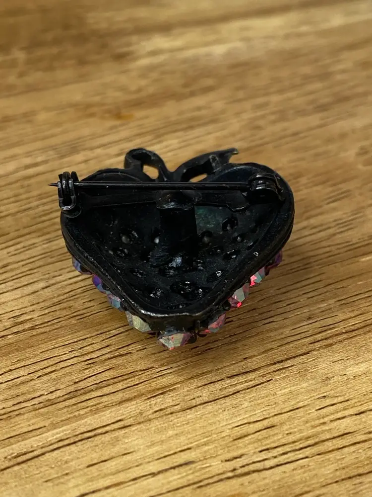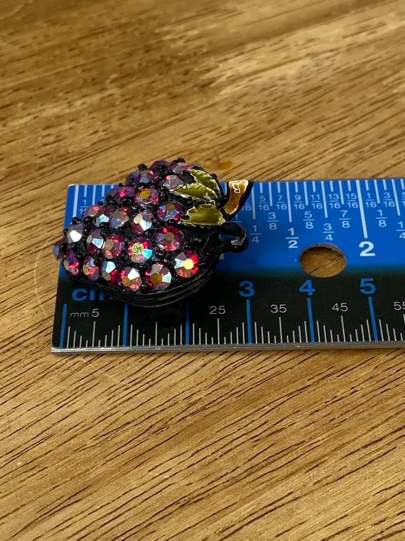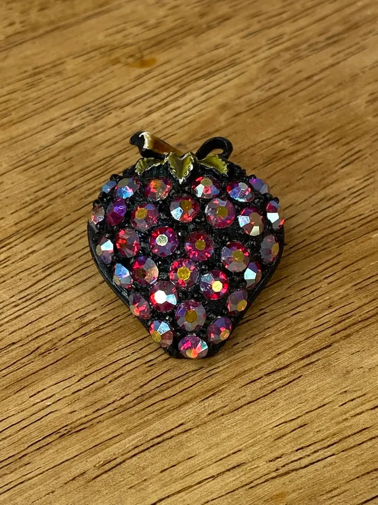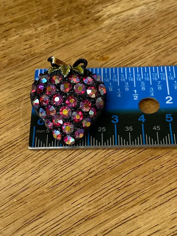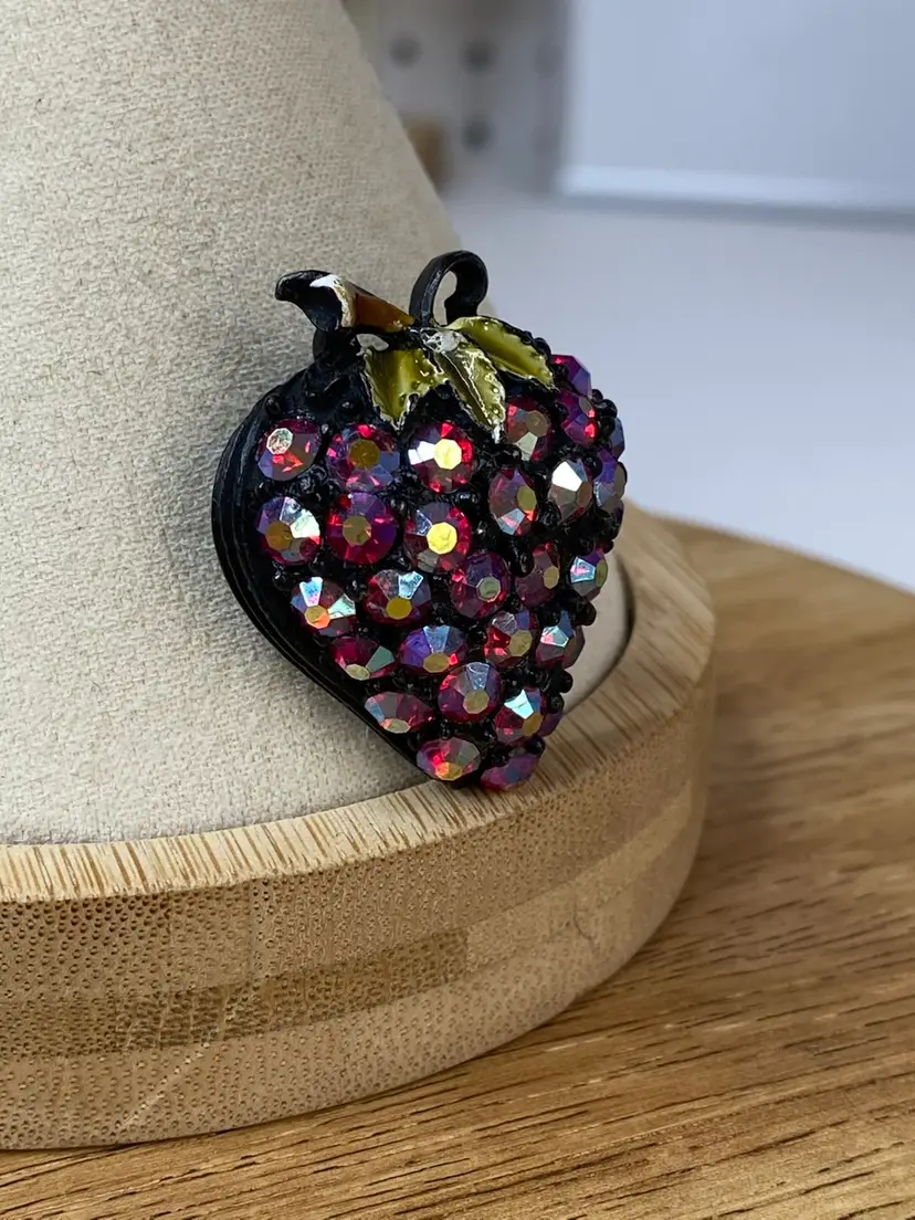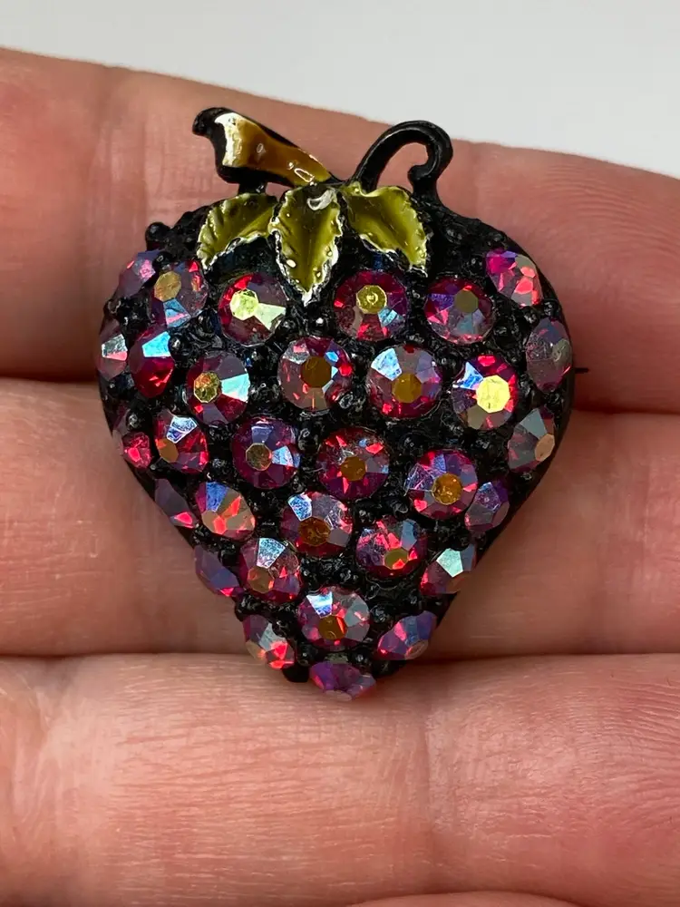 Add a touch of vintage glamour to your outfit with this stunning Rhinestone Strawberry Brooch. The brooch features a beautiful black tone metal body with a pavé setting style, and round rhinestones in a vibrant red aurora borealis color. The brooch is adorned with intricate details that give it a unique and elegant look.