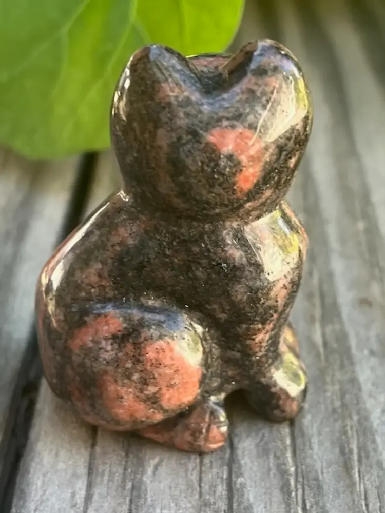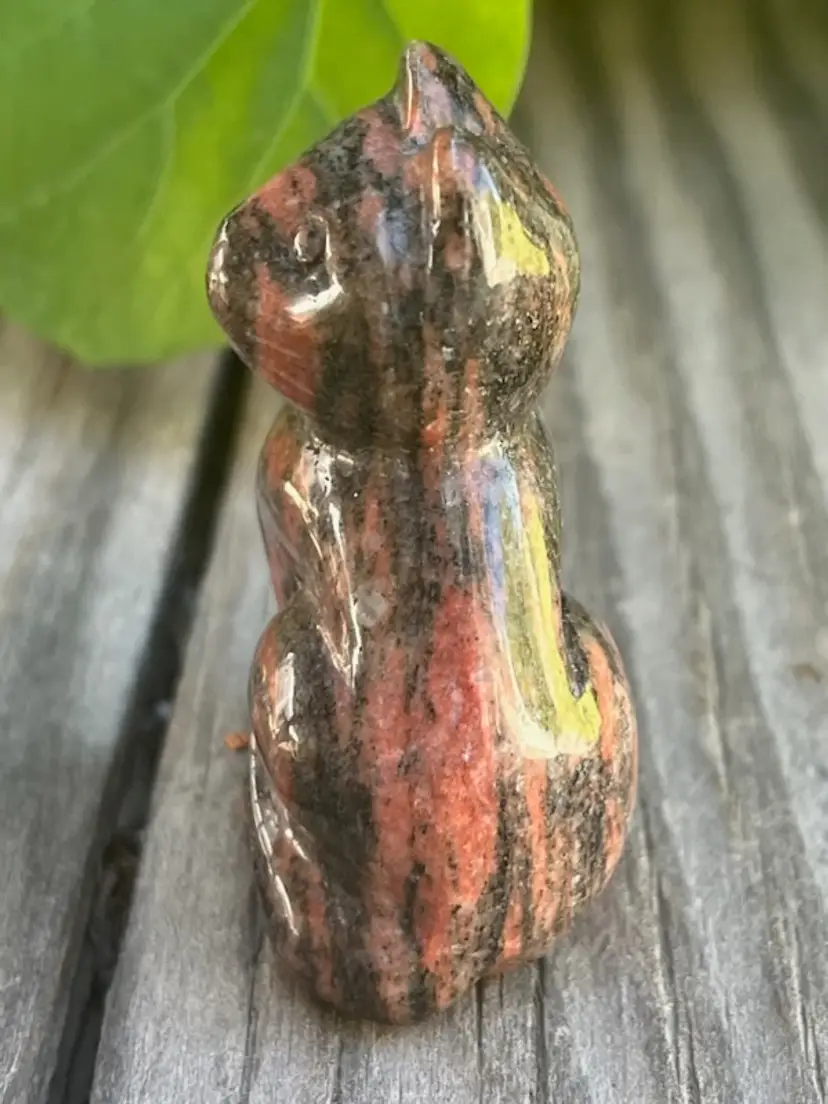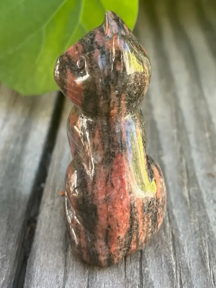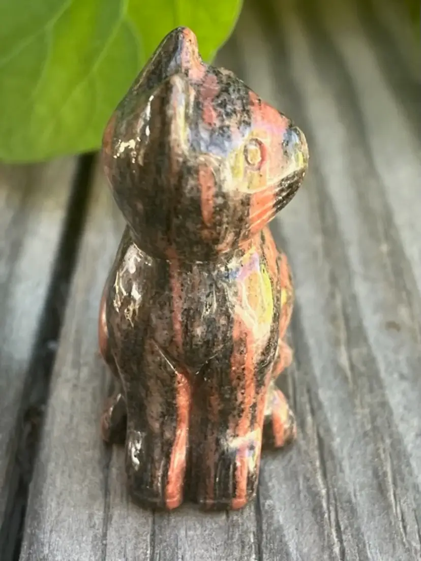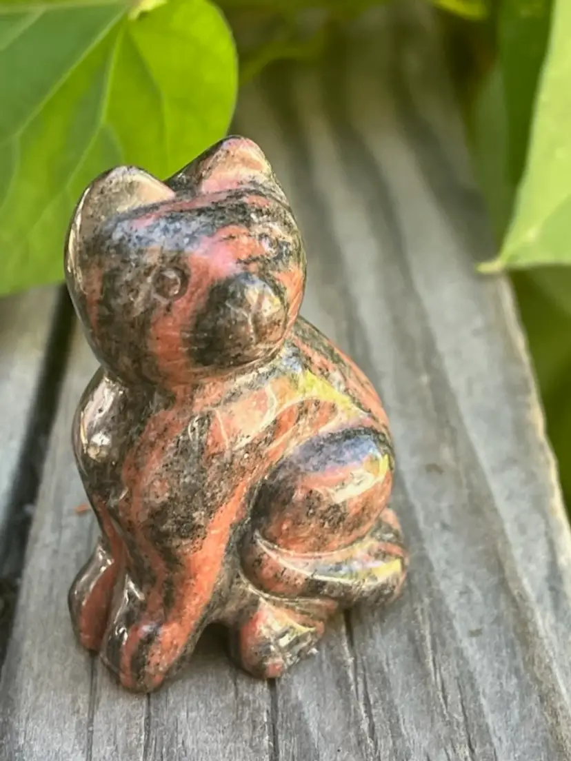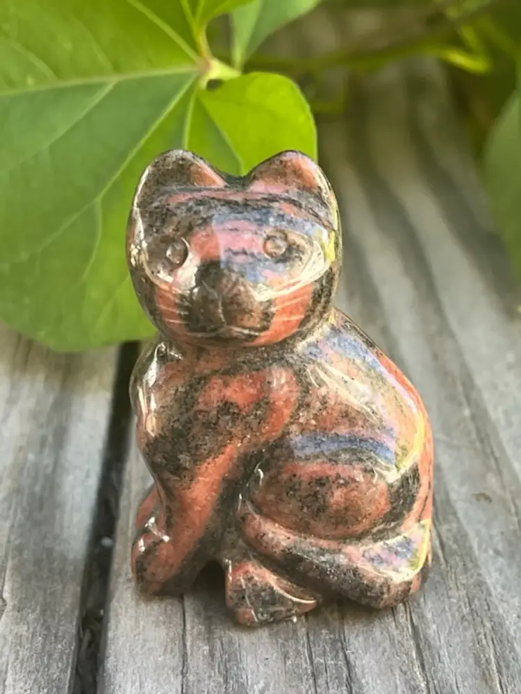 A vintage Rhodolite carved cat. 50 grams. Approximately 2 inches tall and 1 1/4 inches wide.