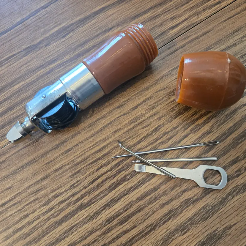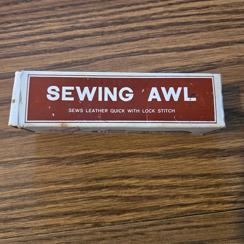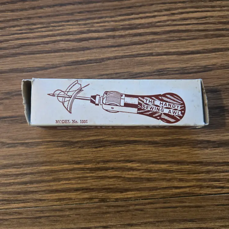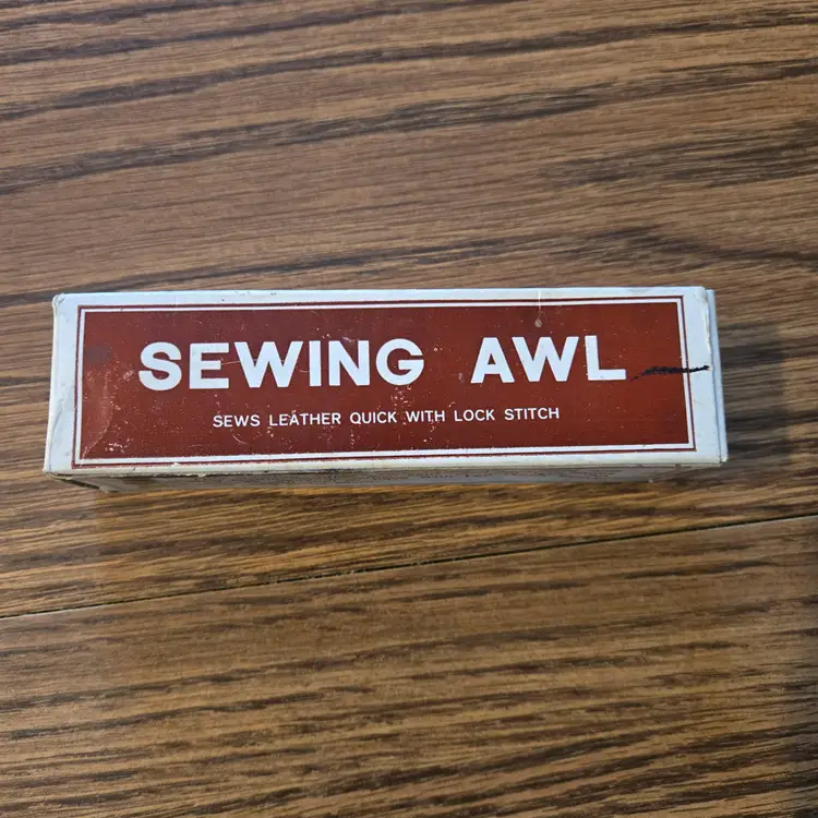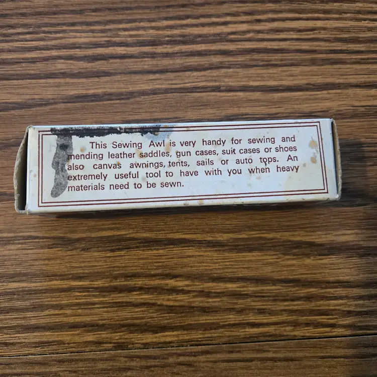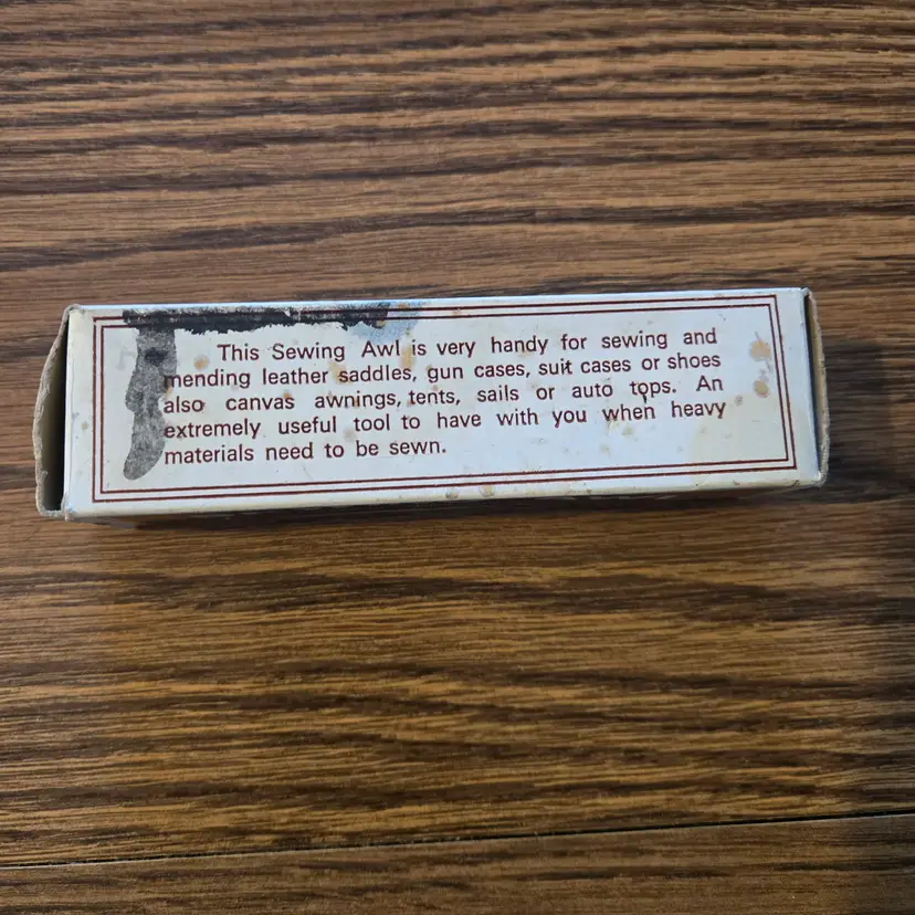 I found this stored among sewing things at my dad's house (pet and smoke free) after he passed. I believe it came from my great aunt's house. This sewing awl is used for leather and includes four pieces that fit inside the body of the awl. There are two needles, one curved. There is what appears to be a punch tool as well as a wrench/screwdriver tool. The instructions are included. When I found this, it had some black spots on the brown plastic (bakelite?) parts. It came off easily with just water and a cloth. I think it may have been from the black thread which may or may not be usable. Other parts appear like new, but I did not test the needles to make sure they are sharp enough to use on leather. The box has damage that appears to be ink or marker. See pictures!