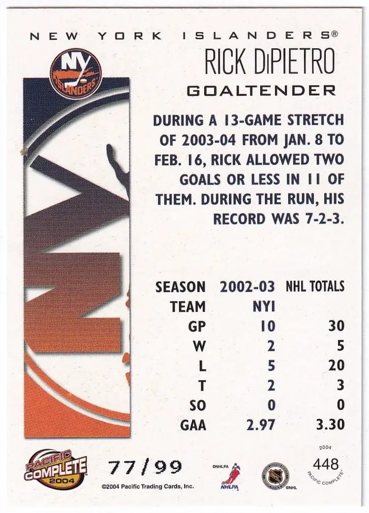 2003-04 Pacific Complete Red #448 Rick DiPietro New York Islanders Print Run - 99