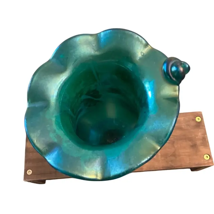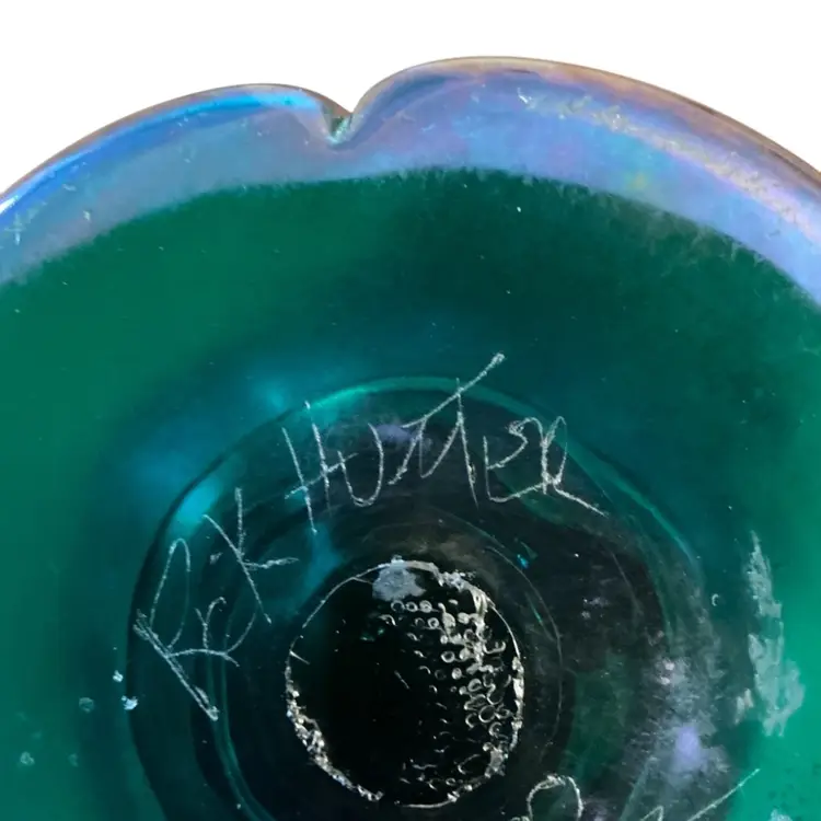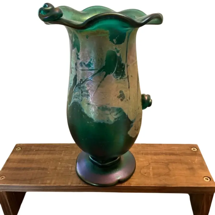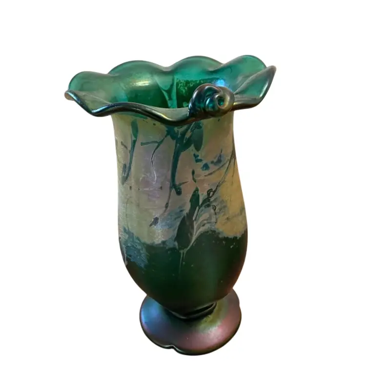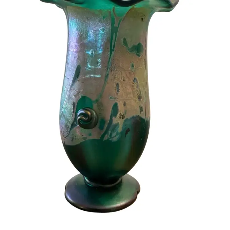 Hand blown ruffled top gorgeous matt iridescent carnival glass vase signed on the base. 9 1/2” x 5 1/2.”