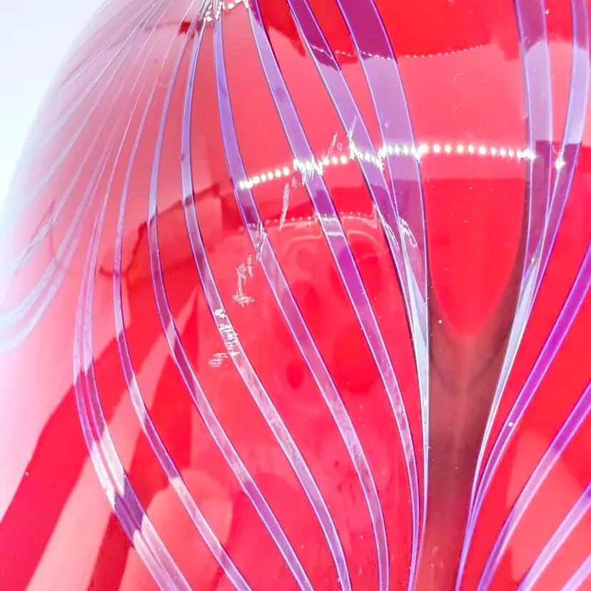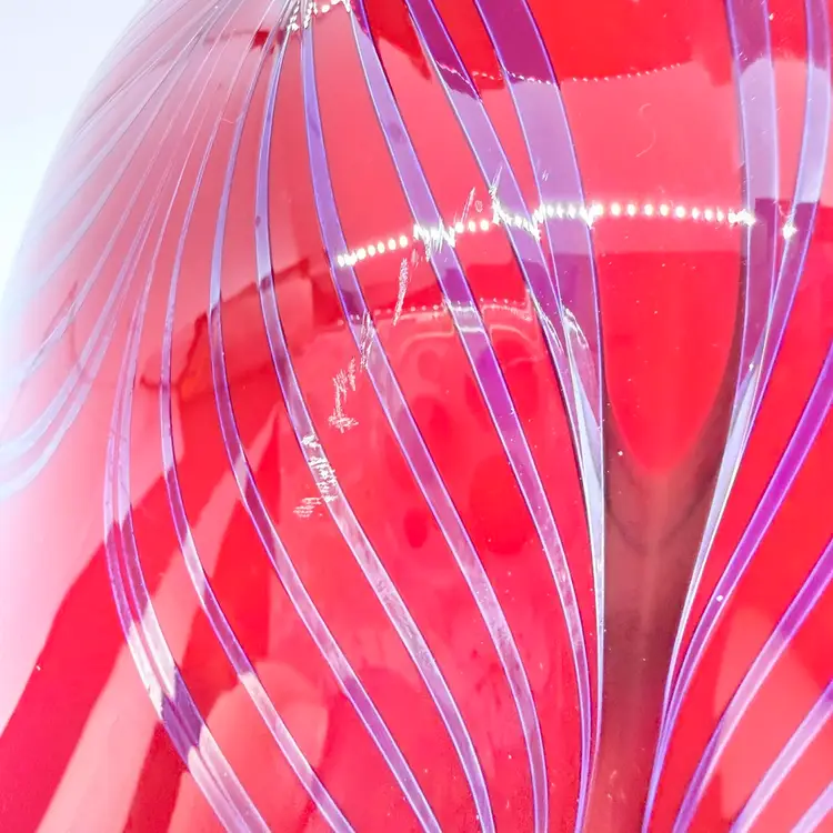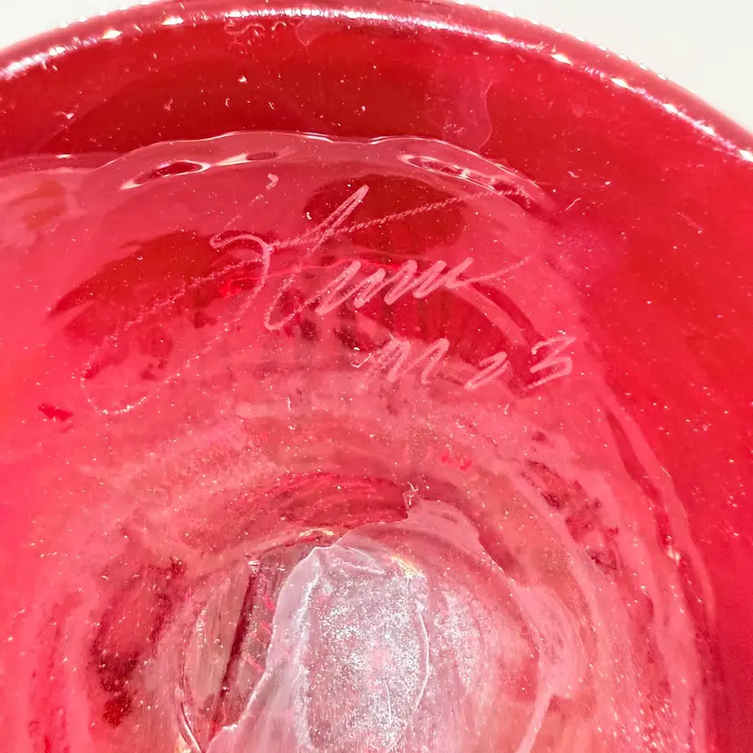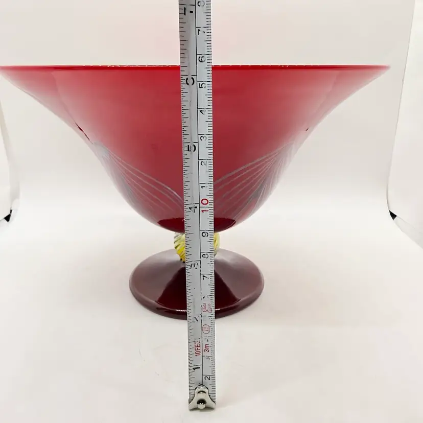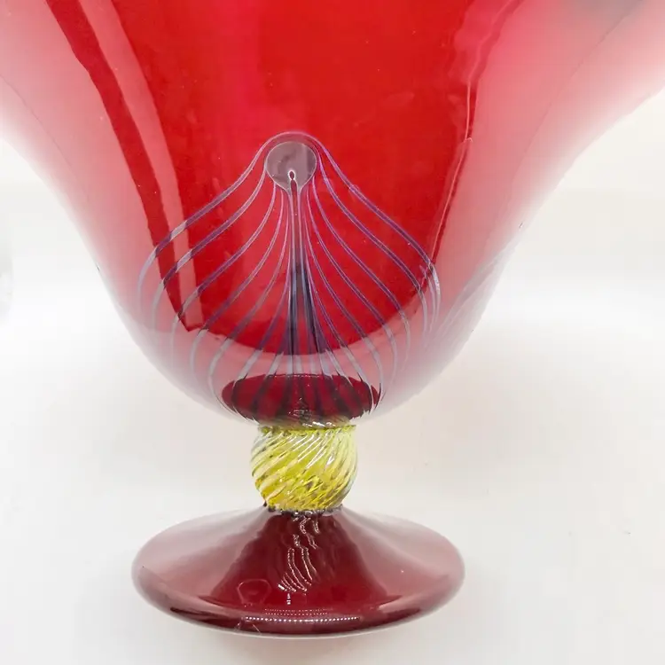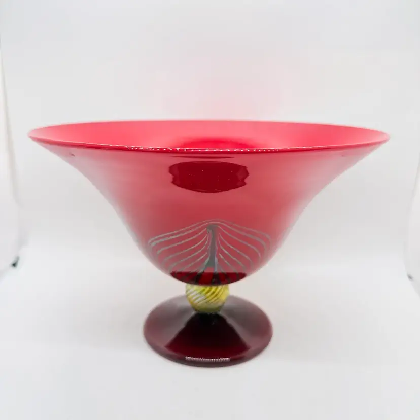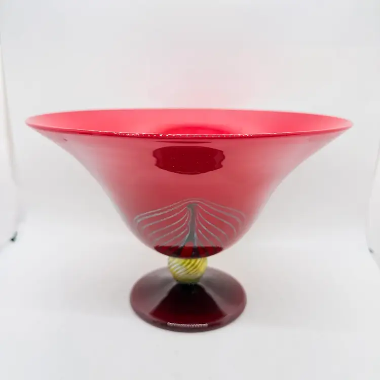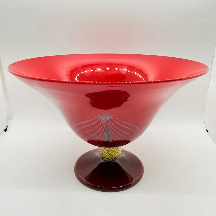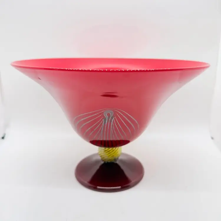Rick Strini Signed Pulled Purple/ Blue Feather Red and Yellow Hand Blown Art Glass Footed Bowl. I believe the inside of the bowl is a lighter red than the outside of the bowl. I believe the date is 2003. No chips or cracks. There are scratches and scuffs on the outside, primarily on one side. Please see pictures. Sold as is.