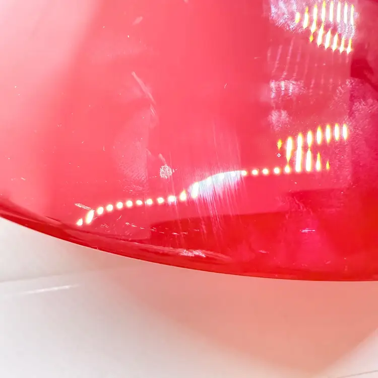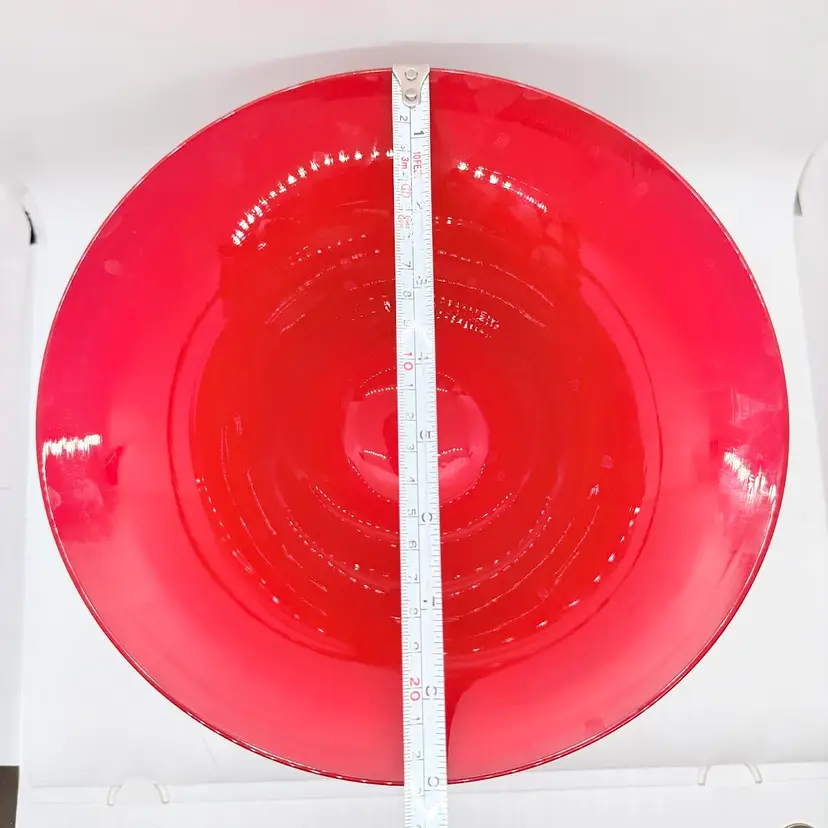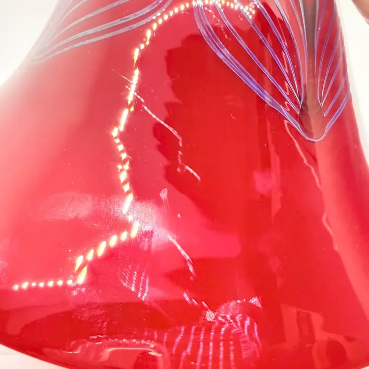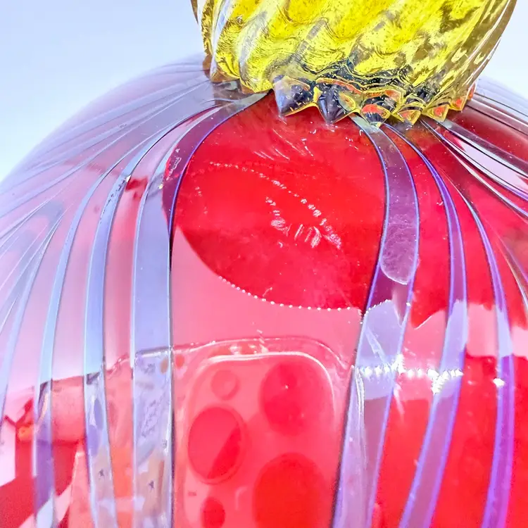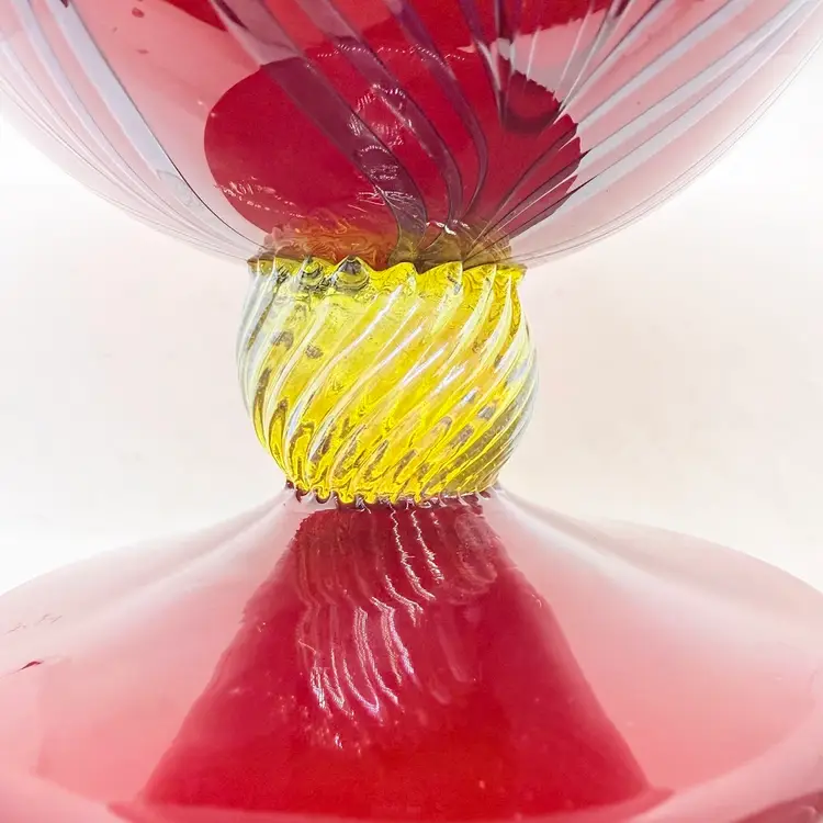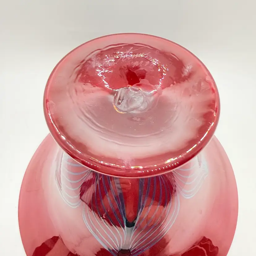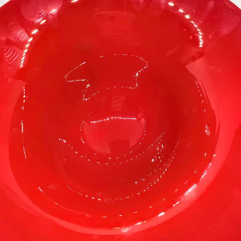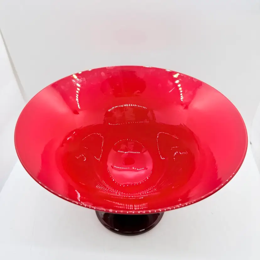 Rick Strini Signed Pulled Purple/ Blue Feather Red and Yellow Hand Blown Art Glass Footed Bowl. I believe the inside of the bowl is a lighter red than the outside of the bowl. I believe the date is 2003. No chips or cracks. There are scratches and scuffs on the outside, primarily on one side. Please see pictures. Sold as is.
