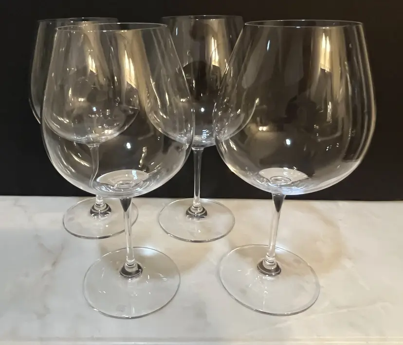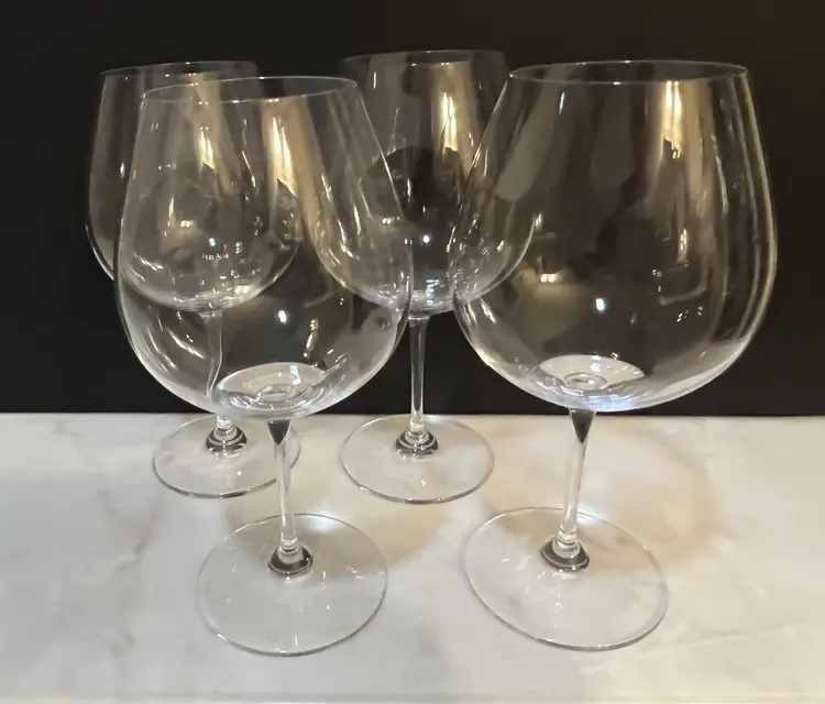 Riedel Vinum Burgundy Wineglass. Made in Austria. Set of four exquisite red wine glasses. Generous bowl shape and an etched logo. 8.5 inches tall. Etched RIEDEL brand logo.