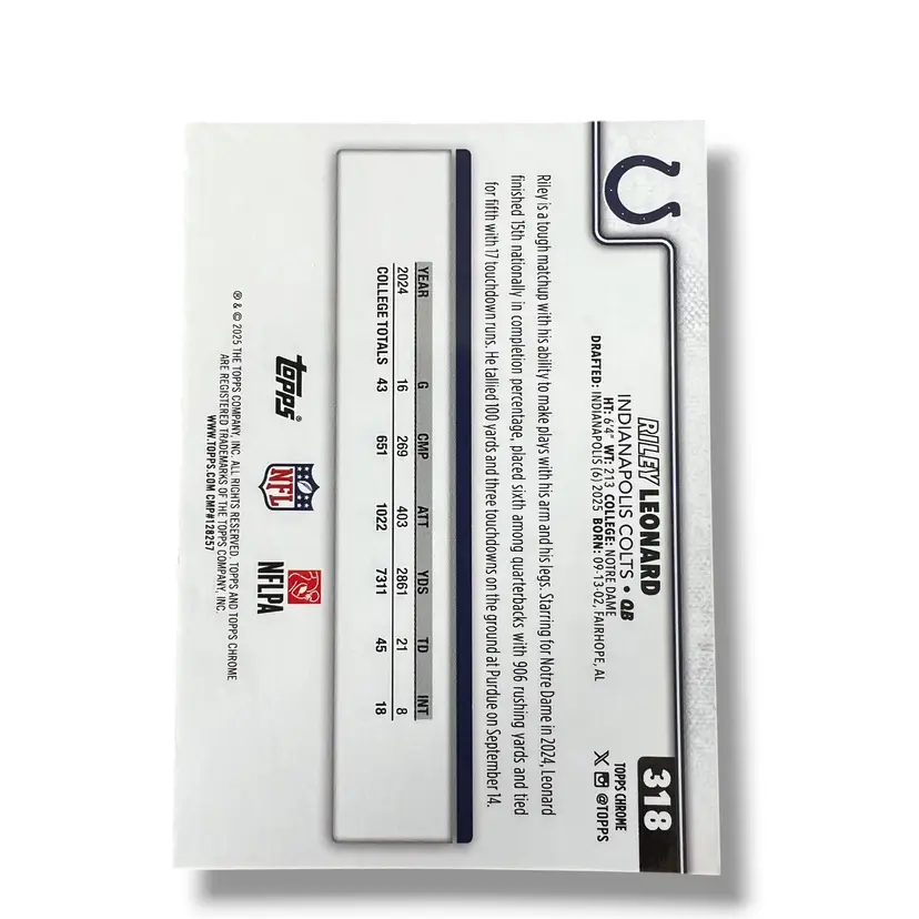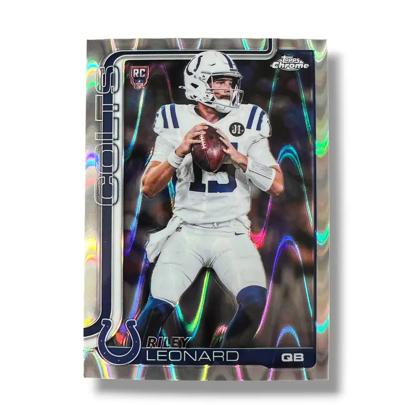 Here We Have a Riley Leonard RC Colts 2025 Topps Chrome Football RayWave Refractor RC #318