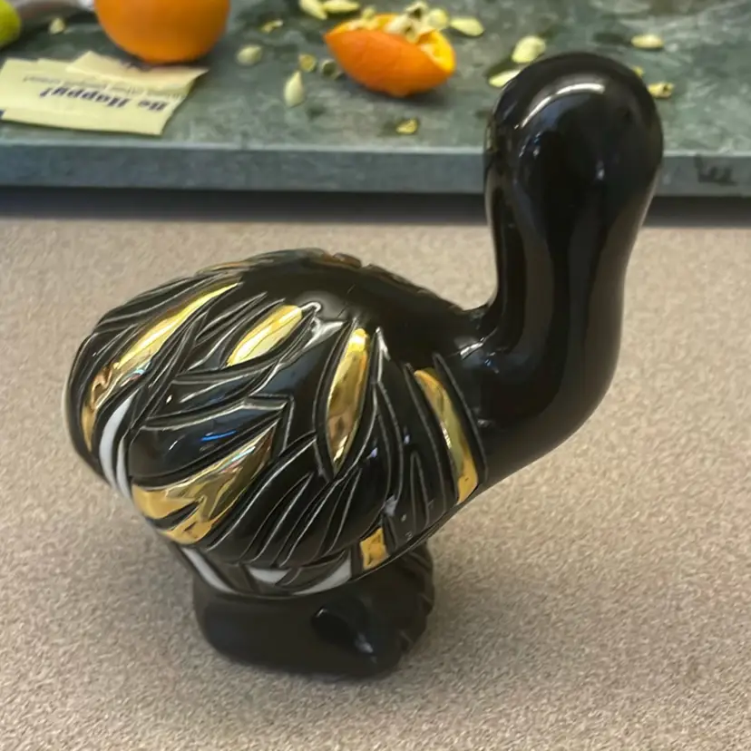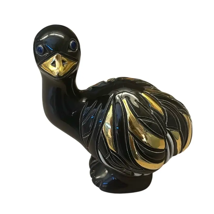 This is an Artesania Rinconada Ostrich figurine, part of the "Anniversary Collection". The figurine is hand-carved from fine grain earthenware clay. It features black enamel glaze with accents of 24kt gold and platinum. Each piece is handcrafted in Uruguay. This specific model has been retired from production.