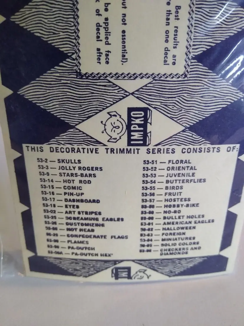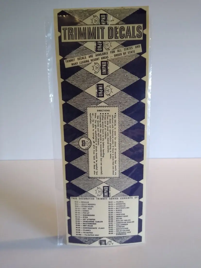 Original new old stock decal in original package. Made by Trimmit. Entire bag is 11.25" x 4". Excellent unused condition.