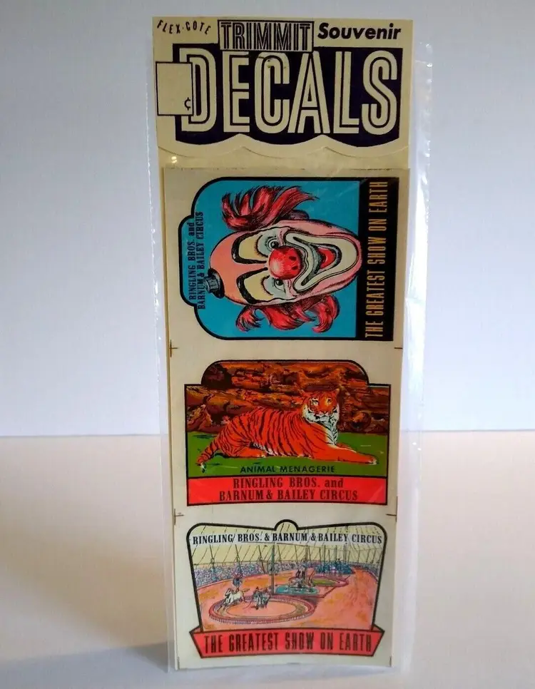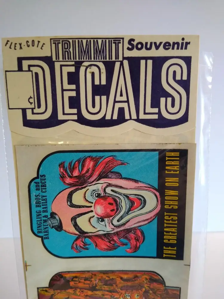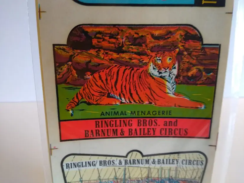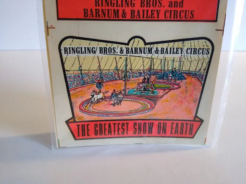 For sale is an amazing package of Ringling Bros. and Barnum Bailey Circus decals. These colorful decals feature various images of the circus, including clowns, tigers, and the big top tent. Each decal is made in the United States and dates back to the 1940s-1950s era, making them true collectibles for any circus enthusiast. The package of decals has not been modified in any way and is in excellent condition, ready to be used or added to a collection. These decals are a great addition to any ephemera or paper collection, and would make a fantastic gift for anyone who loves the circus or vintage advertising. Don't miss out on the chance to own a piece of American circus history!