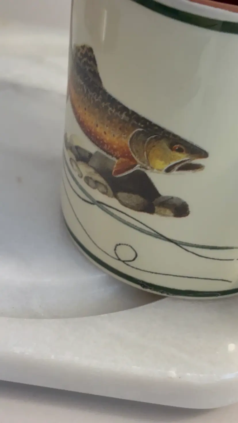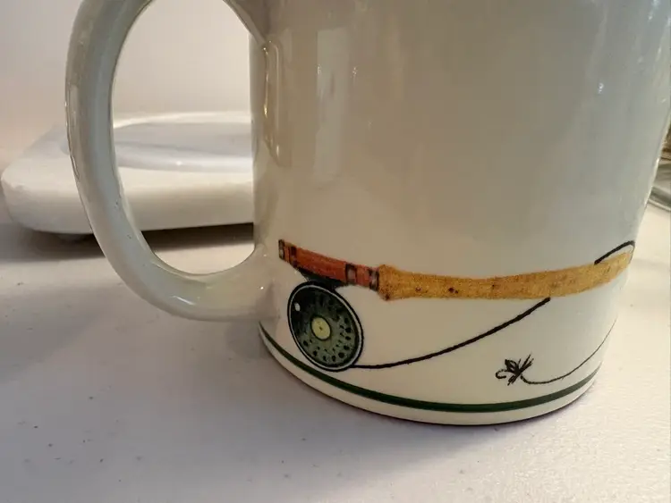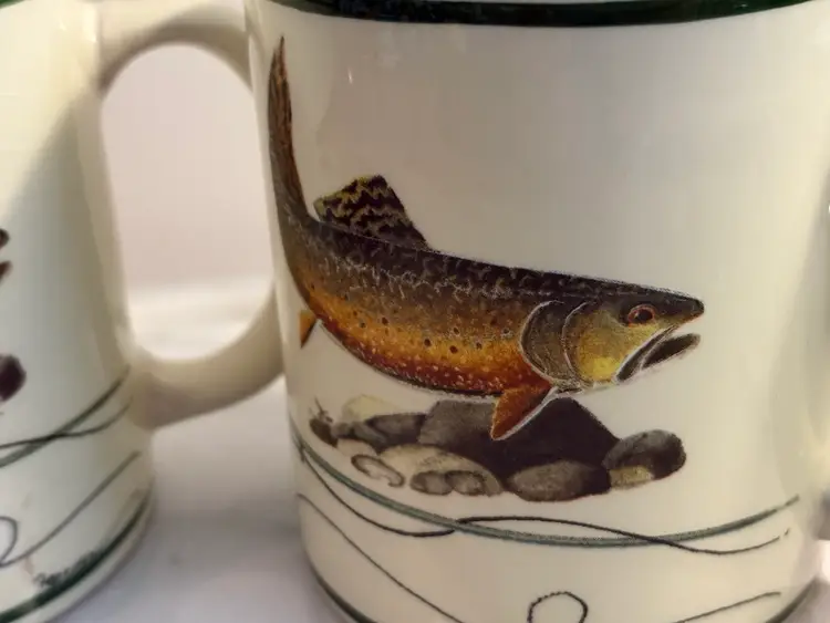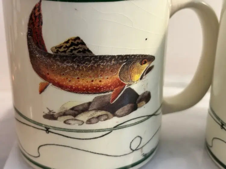 The Rivers Edge Coffee Tea Cup Mug features a charming design of a trout fish with lure and rod, perfect for outdoor enthusiasts and fishing lovers. Made of durable stoneware, this two-piece set includes two 8oz tea cups with a capacity for both hot and cold beverages. The colorful abstract design and fish theme make it a unique addition to your kitchen or home decor. The cups are licensied reproduction and care instructions recommend hand wash only. Ideal for all occasions, this medium-sized mug set is a must-have for fishing-themed collectors and outdoor enthusiasts.