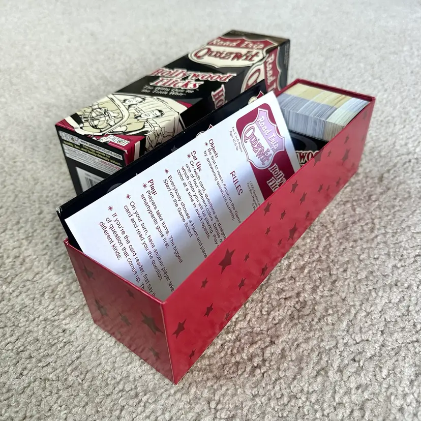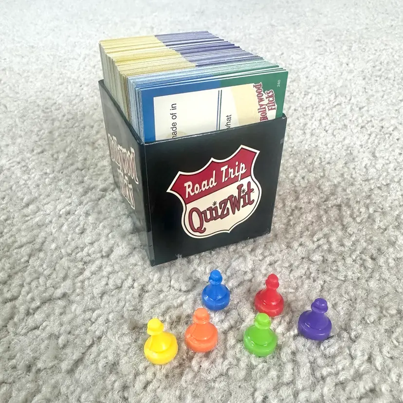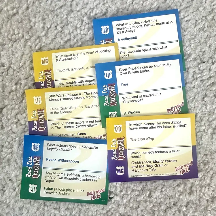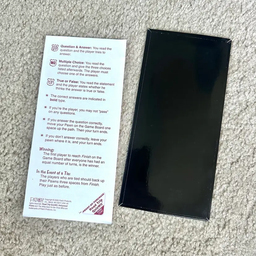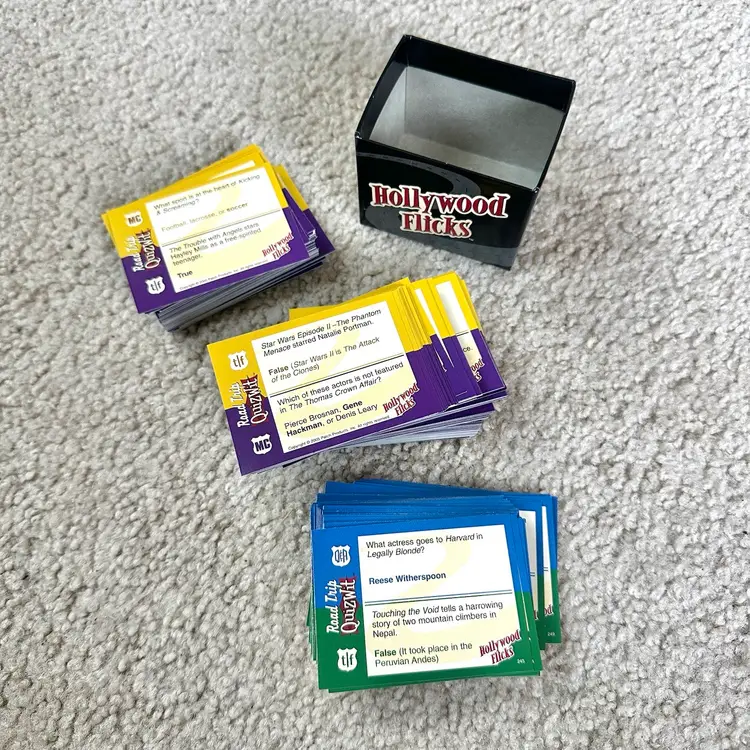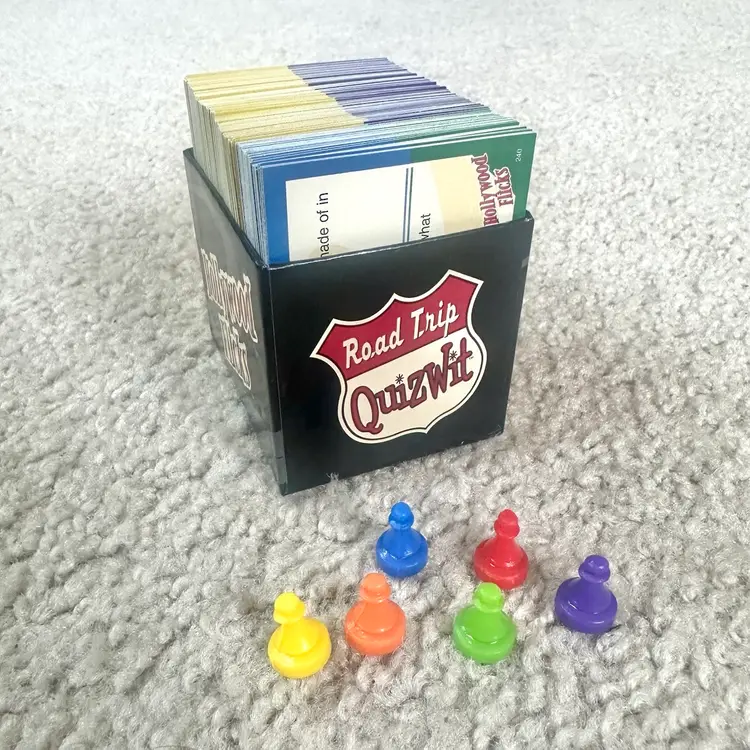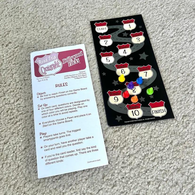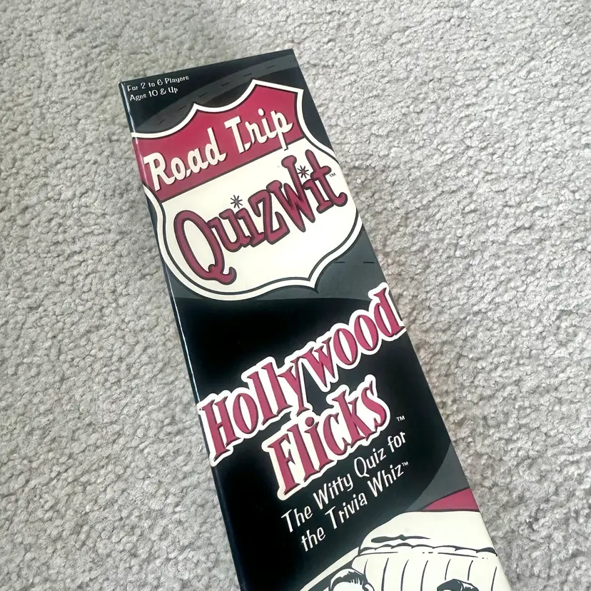 Road Trip Quizwit HOLLYWOOD FLICKS Trivia Game made by Patch Products in 2005. Great for home use or while driving on road trips. Complete with magnetic game board and pawns, plus 1,000 Hollywood movie questions on 250 game cards. Rules sheet also included. Game is 100% complete and LIKE NEW CONDITION!! See pics for more details