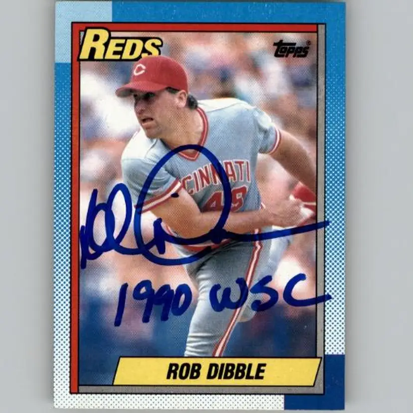 Authentic 1990 Topps baseball card featuring Rob Dibble of the Cincinnati Reds, signed with '1990 WSC' inscription. A must-have for Reds fans and autograph collectors. Your purchase supports Signatures For Soldiers in aiding homeless and disabled veterans.