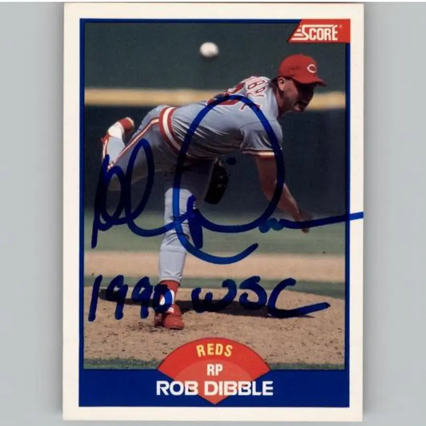 Authentic 1989 Score baseball card featuring Rob Dibble of the Cincinnati Reds, signed by Dibble with an inscription '1990 WS C'. A great addition for Reds fans and autograph card collectors. Your purchase supports Signatures For Soldiers in helping homeless and disabled veterans.