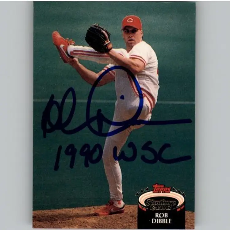 Authentic Topps Stadium Club baseball card featuring Rob Dibble of the Cincinnati Reds, signed with '1990 WSC' inscription. A must-have for Reds fans and autograph collectors. Your purchase supports Signatures For Soldiers in aiding homeless and disabled veterans.