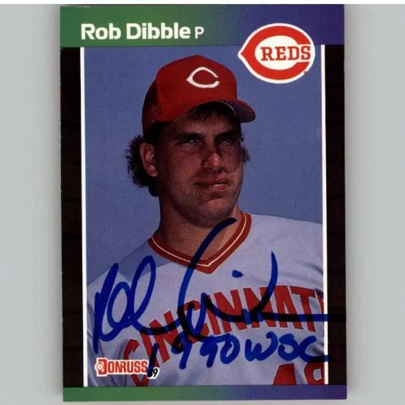 Authentic 1989 Donruss baseball card featuring Rob Dibble of the Cincinnati Reds, signed in bold blue ink. A must-have for Reds fans and autograph collectors. Your purchase supports Signatures For Soldiers in helping homeless and disabled veterans.