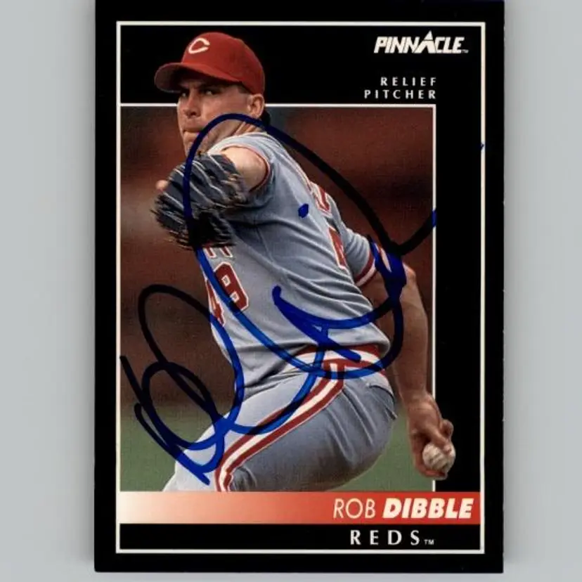 Authentic Pinnacle baseball card featuring Rob Dibble of the Cincinnati Reds, signed boldly in blue ink. A must-have for Reds fans and autograph collectors. Your purchase supports Signatures For Soldiers in helping homeless and disabled veterans.