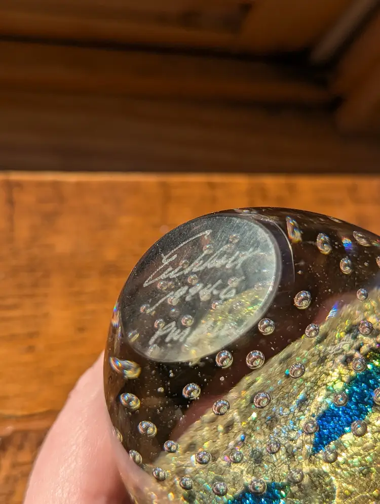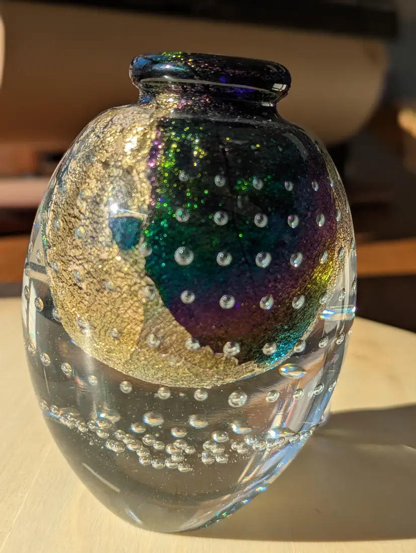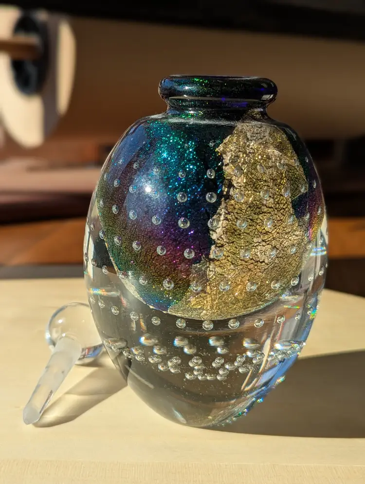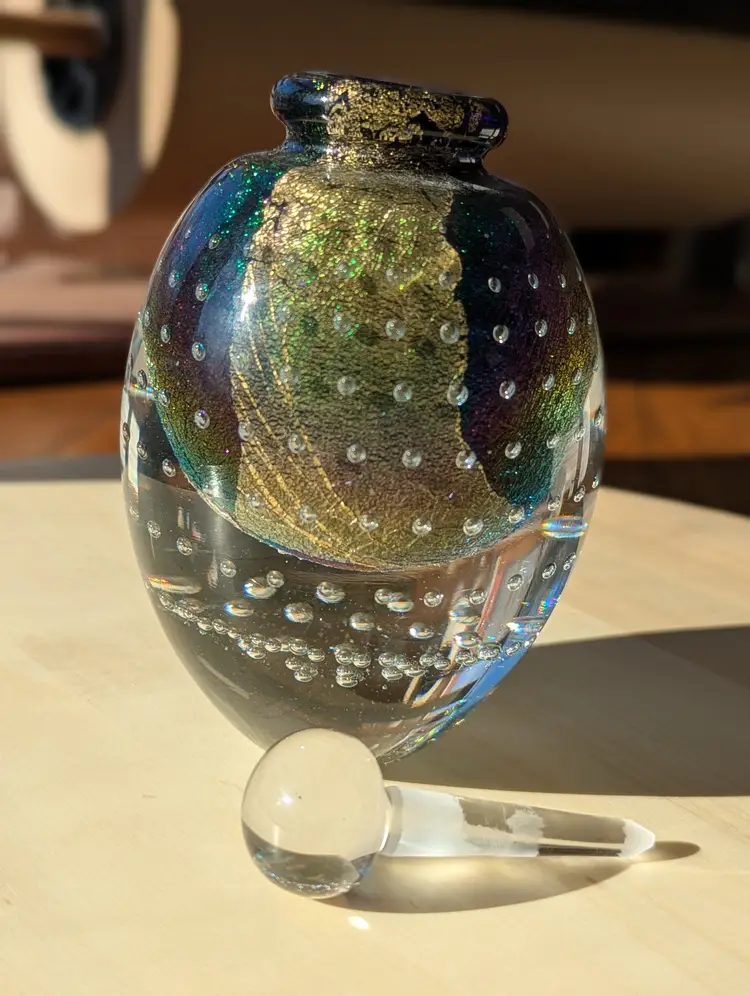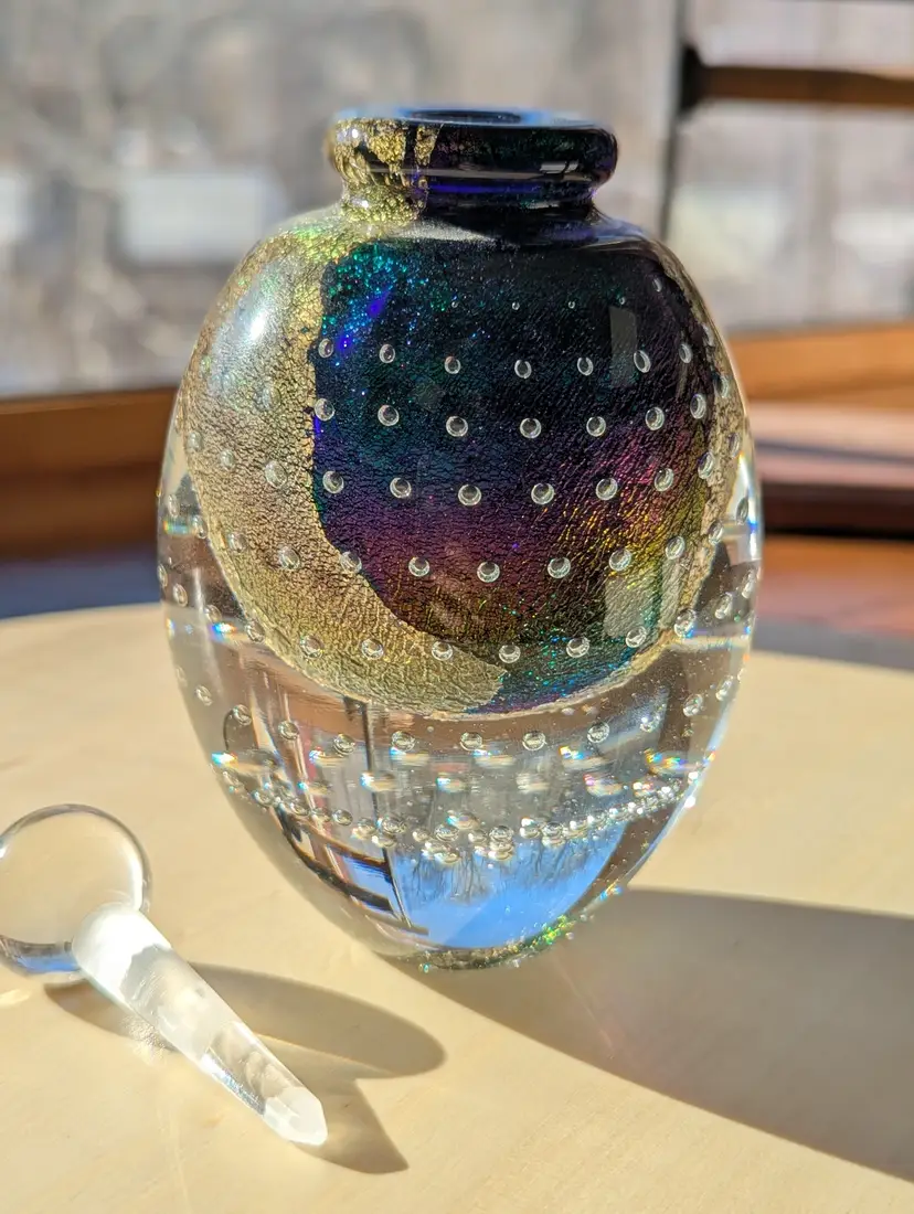 Robert Eickholt art glass bullicante large perfume bottle, signed 1994 with stopper. She's a stunner! Controlled bubbles are expertly spaced and aligned.