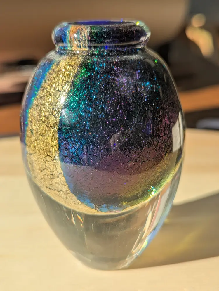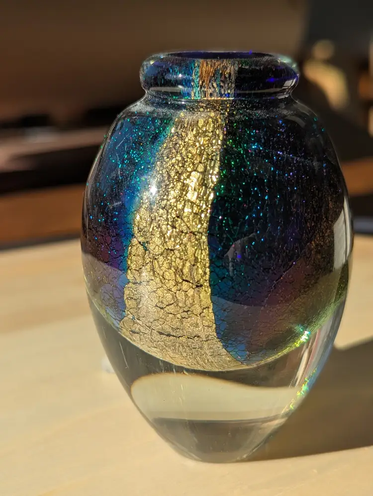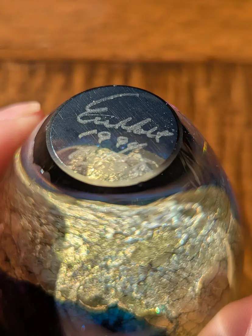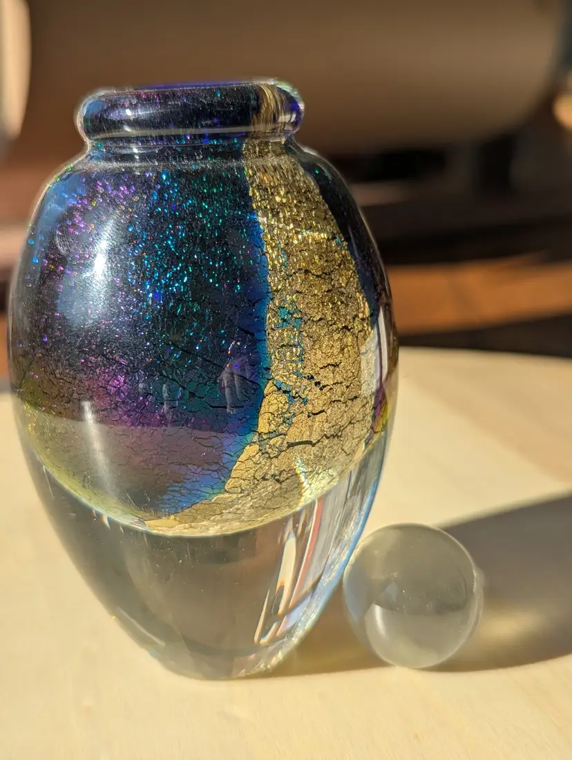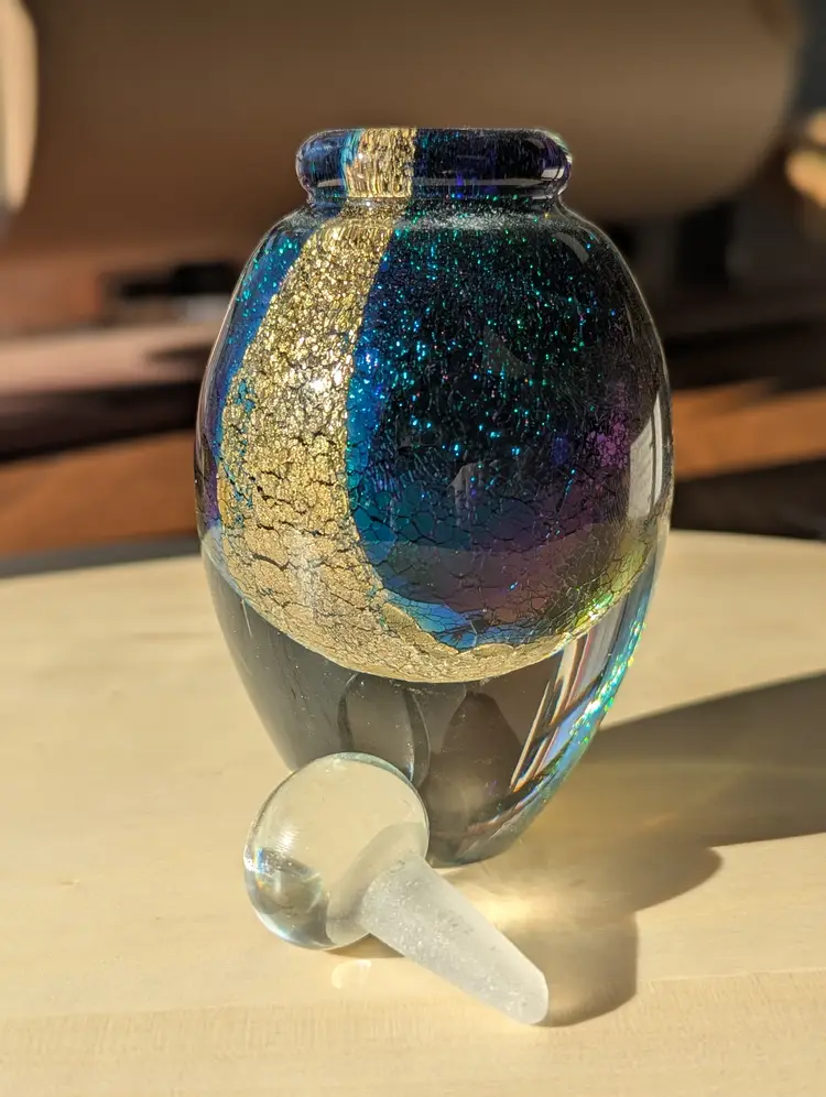 Robert Eickholt art glass perfume bottle, signed 1994. Stopper is short but does not feel chipped to the touch, as seen in photos.