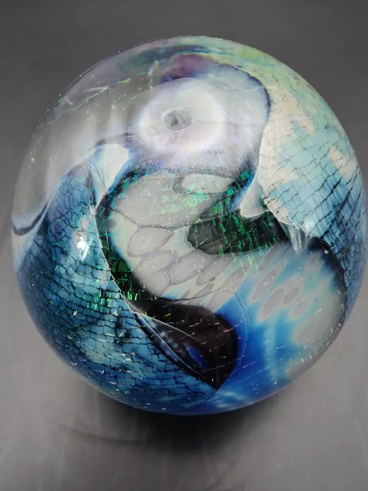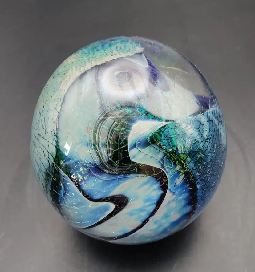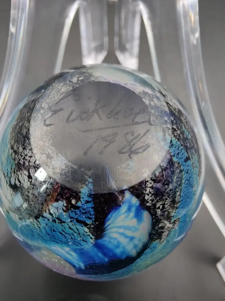 Signed 1986. Beautiful condition, no chips or cracks. Paperweight is not round, it's more of an egg shape