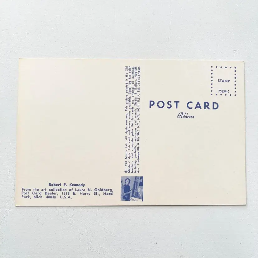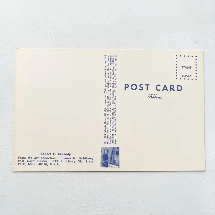 Robert F kennedy Portrait Art Postcard Picture of Morris Katz Painting Vtg 1970 From the art collection of Laura N. Goldberg, Post Card Dealer, Hazel Park, Michigan Copyright 1970 Morris Katz Studio & Gallery, 6th Avenue, New York, NY This postcard is a picture of an original painting painted in the Old Masters' Style Condition: Unused. Unposted. Wear on the corners. Measures 5-1/2 inches x 3-1/2 inches Packaged in a plastic sleeve inside a rigid envelope Visit my store to see more vintage ephemera, advertising, novelties, gifts, estate sale and yard sale finds https://district.net/u/finderspickerspaper SKU B21