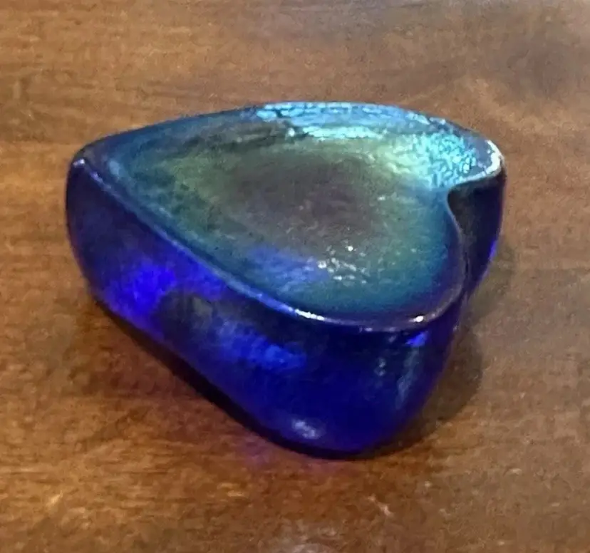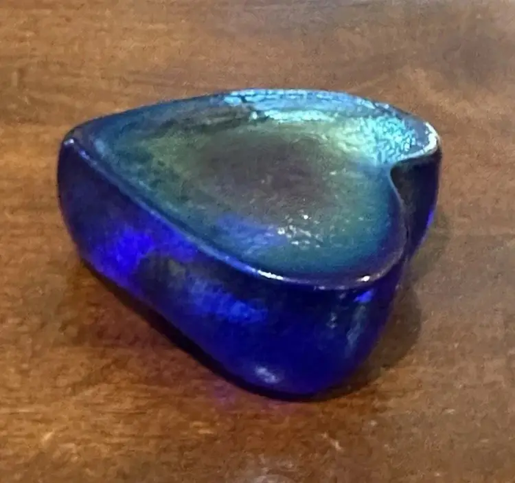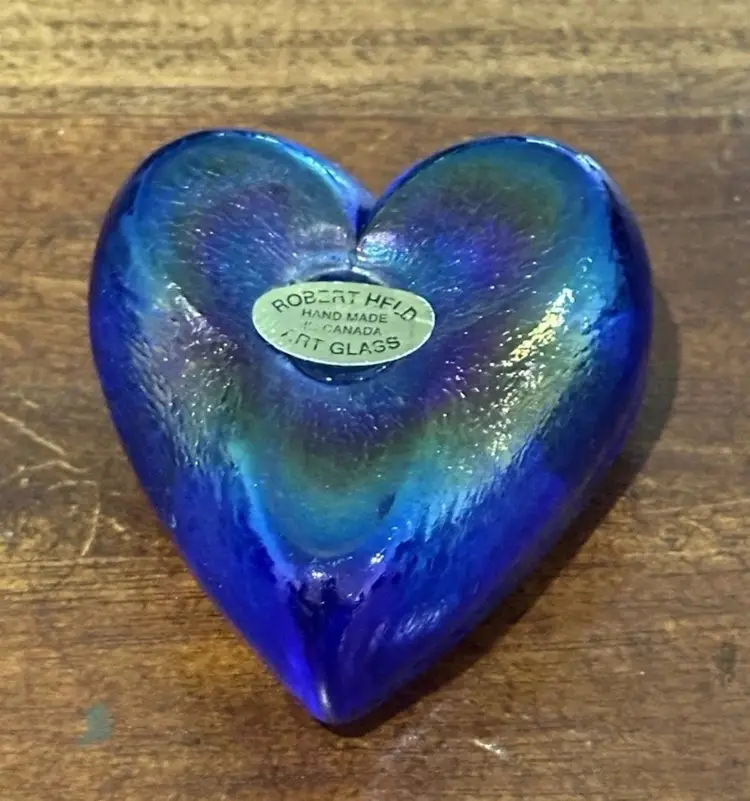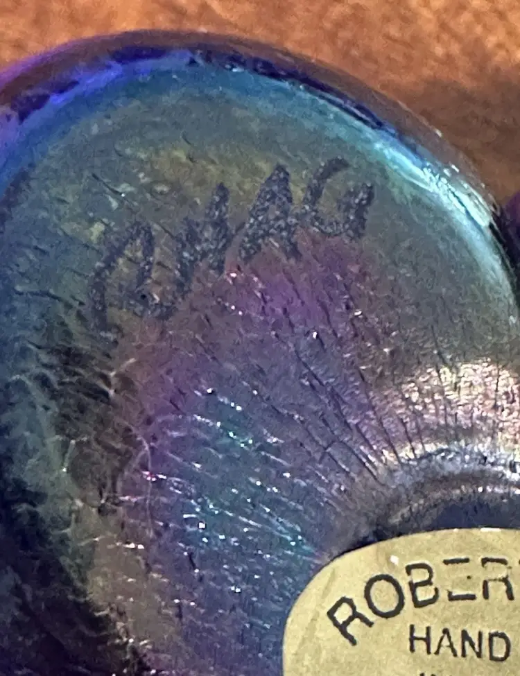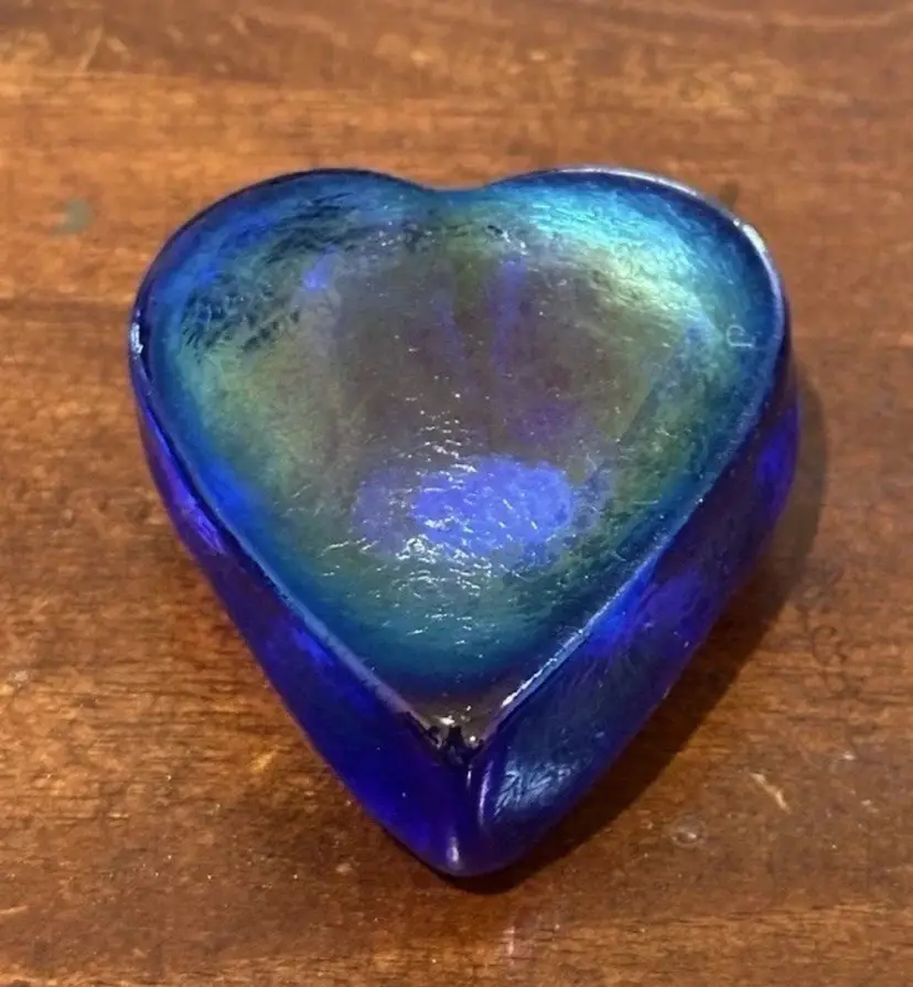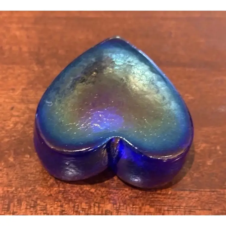 Blue iridescent paperweight with no chips, cracks or bruises. It has the paper sticker as well as signed RHAG. It measures approximately 2.75x2.5x1.5"