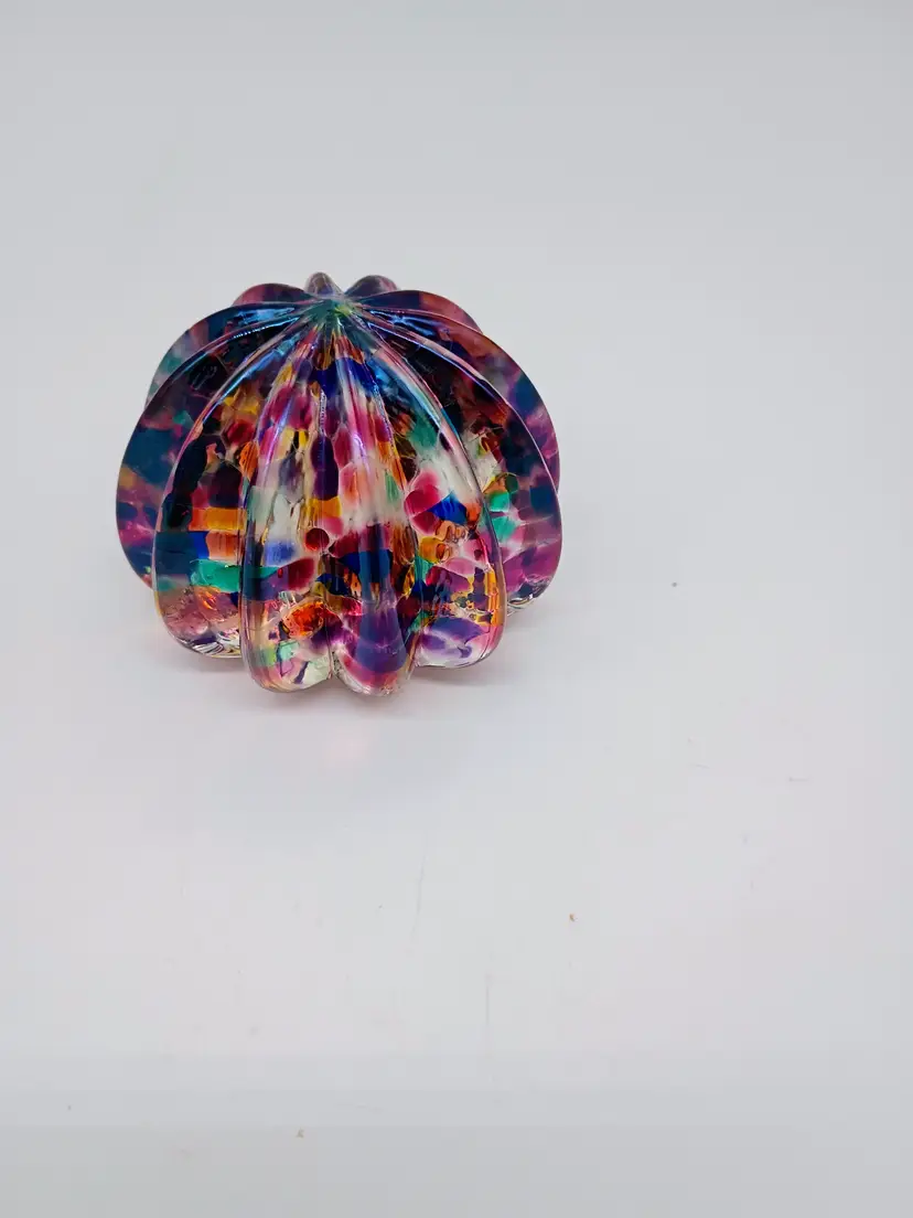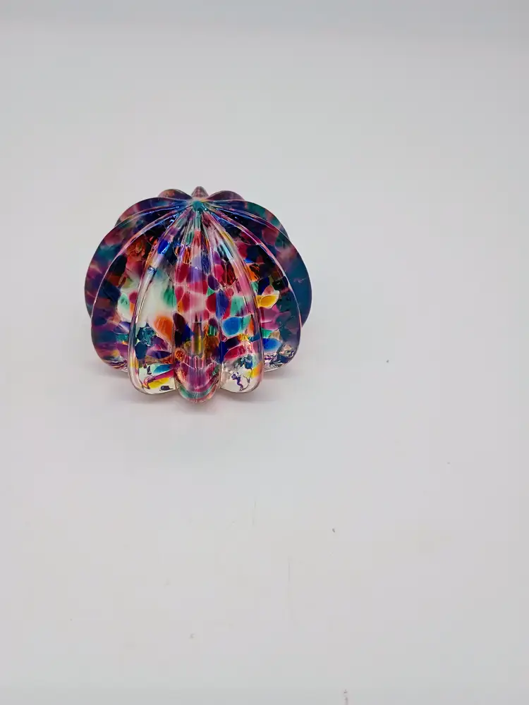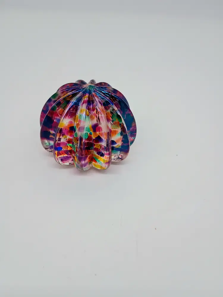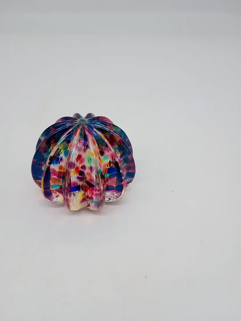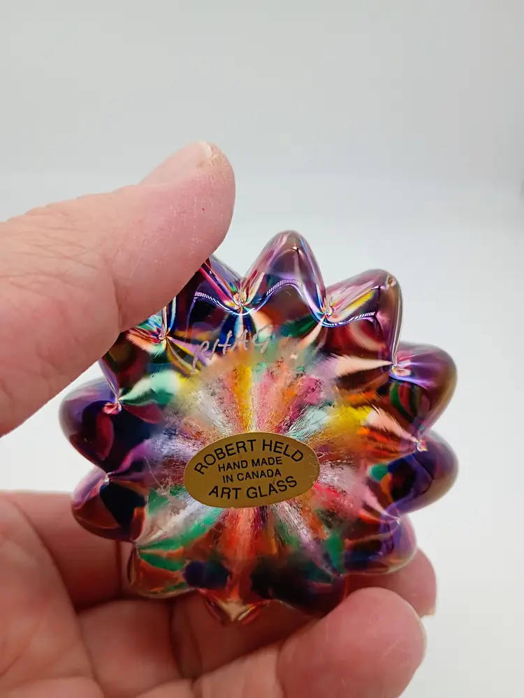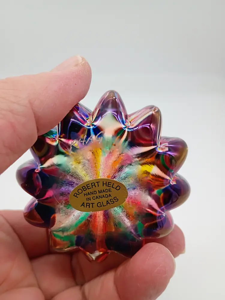 Robert Held Signed Art Glass Sea Urchin Confetti Rainbow Paperweight RARE Color. Circa early 2000's. This is 2 3/8 inches in diameter and just a hair over 2 inches in height. This is in Mint condition. no chips cracks or flea bites. Has original sticker and incised signature. This is a rare color to find this in almost an end of day glass mixture. Ships USPS domestically and USPS International Shipping globally
