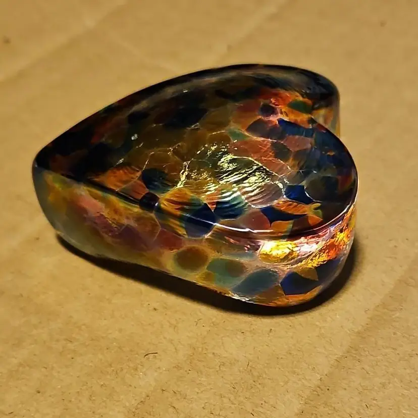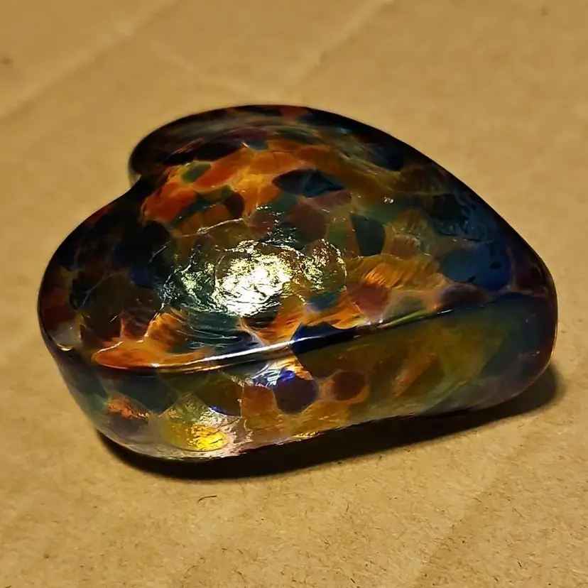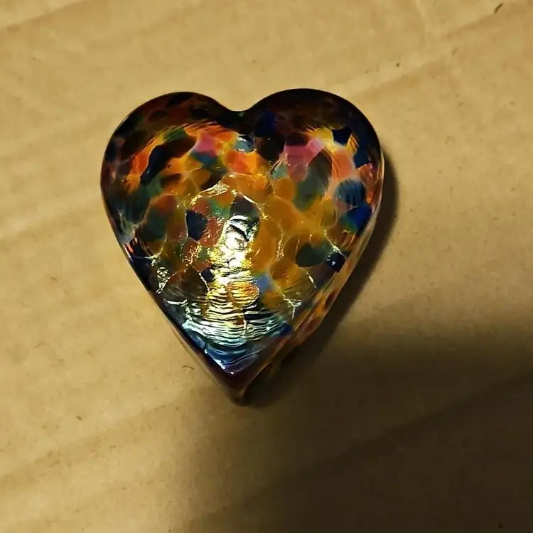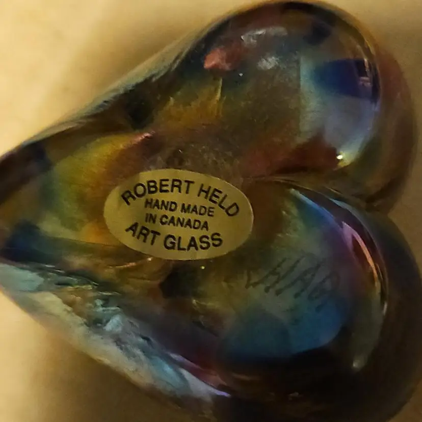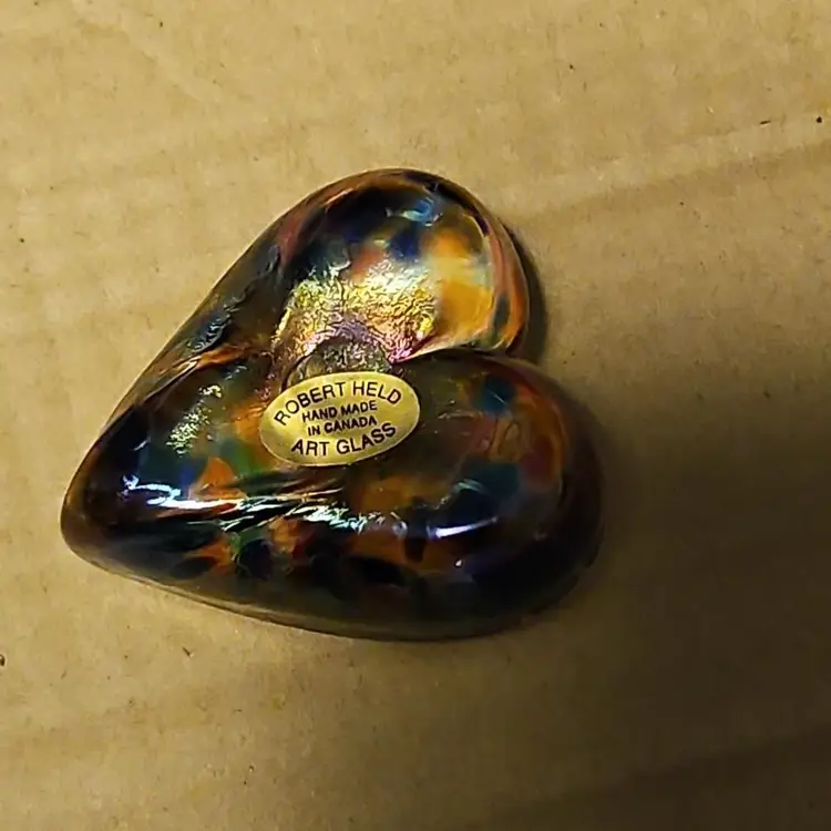 This beautiful paperweight is a true piece of art, hand-blown by renowned Canadian artist Robert Held. It features a striking multicolored heart design and comes with its original label intact and etched signature. Whether you're a collector of paperweights or simply looking for a unique decorative piece, this item is sure to impress.